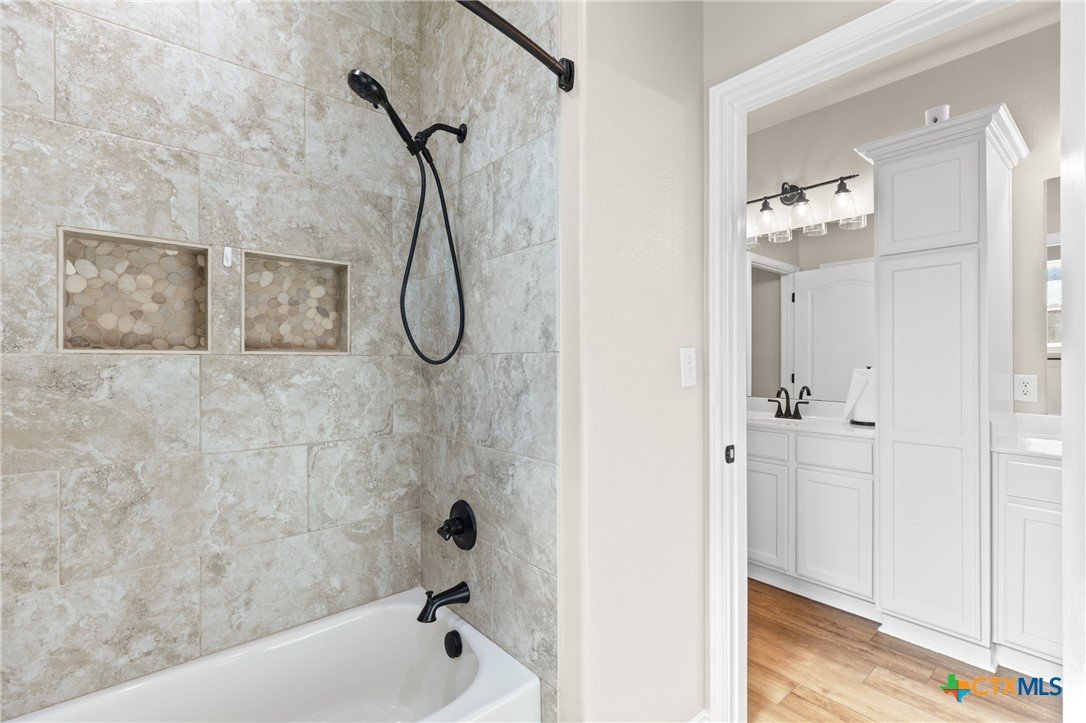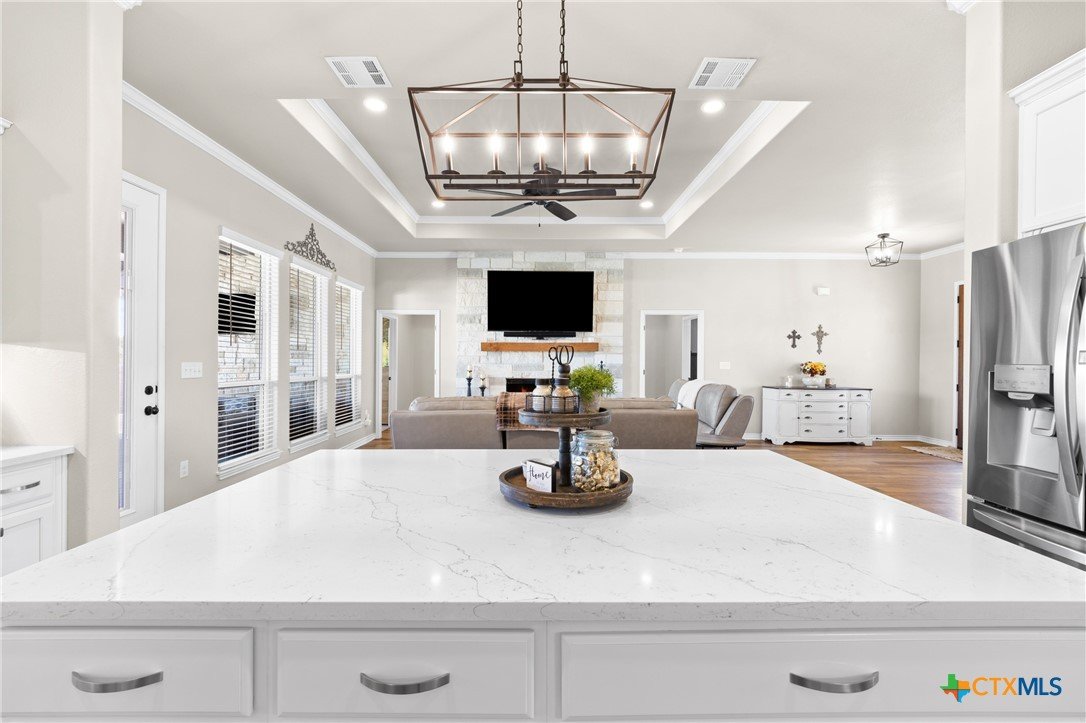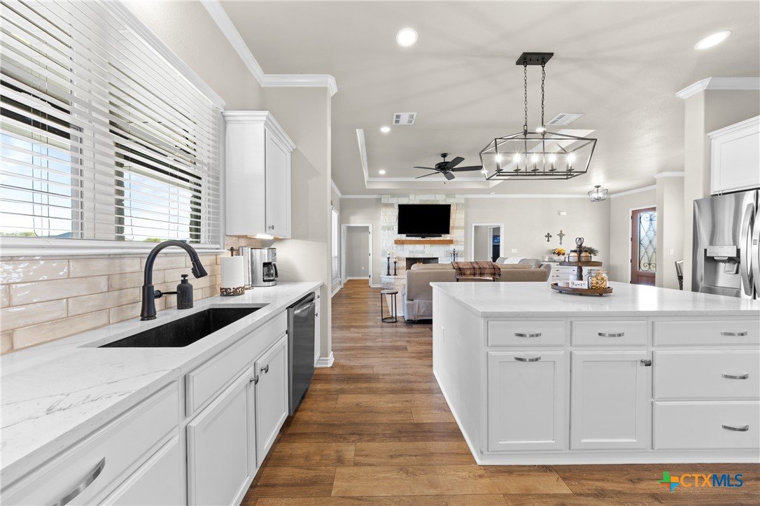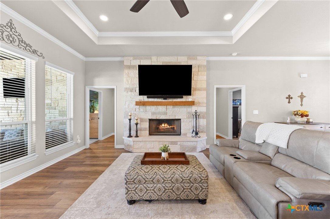 Welcome to your new home in the North Lake Estates of west Temple! This spacious single-family home thoughtfully designed for those seeking comfort, flexibility, and a warm sense of belonging. Step inside to discover well-appointed living space with 4 bedrooms and 2 bathrooms. The main living area showcases elegant high ceilings and crown molding, complemented by luxury vinyl plank flooring and the glow of recessed lighting. Imagine the cozy ambiance of the fireplace on chilly evenings, while ceiling fans keep you cool throughout warmer months. The gourmet kitchen is a true centerpiece featuring a spacious island, quartz countertops, double ovens, and a walk-in pantry, making meal prep effortless and social. Enjoy plenty of natural light and year-round comfort thanks to double-pane windows. Outdoor living is just as appealing with a covered patio and an extended, open patio perfect for barbecues, quiet coffee mornings, or sunset conversations. Gather around the fire pit or let kids and pets enjoy the boundless possibilities of this 0.6-acre lot—giving you abundant space for gardening, outdoor games, or relaxing in the fresh air. 220 power for a hot tub is available. An east-facing backyard means shade throughout the year, and the sprinkler system helps keeps the grass green. The setting provides room to spread out, making it an ideal haven for households looking for both connection and privacy. This home offers proximity to excellent educational options, with High Point Elementary School, North Belton Middle School, and Lake Belton High School all nearby for your convenience. Settle into a neighborhood that makes balancing home life and daily routines effortless. If you are looking for a place where your family can feel at ease, surrounded by quality upgrades and welcoming spaces to create lasting memories, this is the place for you. Property is less than 1 mile from the boat dock at Cedar Ridge Park on Lake Belton. Contact us today to schedule your private tour.