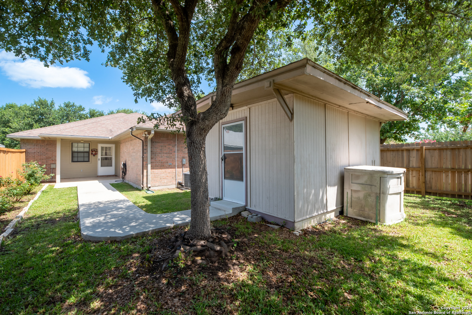 Charming 3-Bed, 2-Bath Home on a Corner Lot - No HOA! This beautifully maintained home offers the perfect blend of comfort, style, and convenience. Nestled on a spacious corner lot with mature trees and exceptional curb appeal, this property features a thoughtful split floor plan, high ceilings, and an abundance of natural light. The private primary suite includes dual vanities, a walk-in shower, and a generous walk-in closet with built-in shelving. Enjoy the outdoors in your landscaped backyard, complete with a 16x12 storage shed and plenty of space to relax or entertain. Additional highlights include a side-entry garage and no HOA restrictions. Ideally located near schools, shopping, Kraft Park, and the County Line Memorial Trail. Don't miss your opportunity to make this darling home yours-schedule your private showing today!