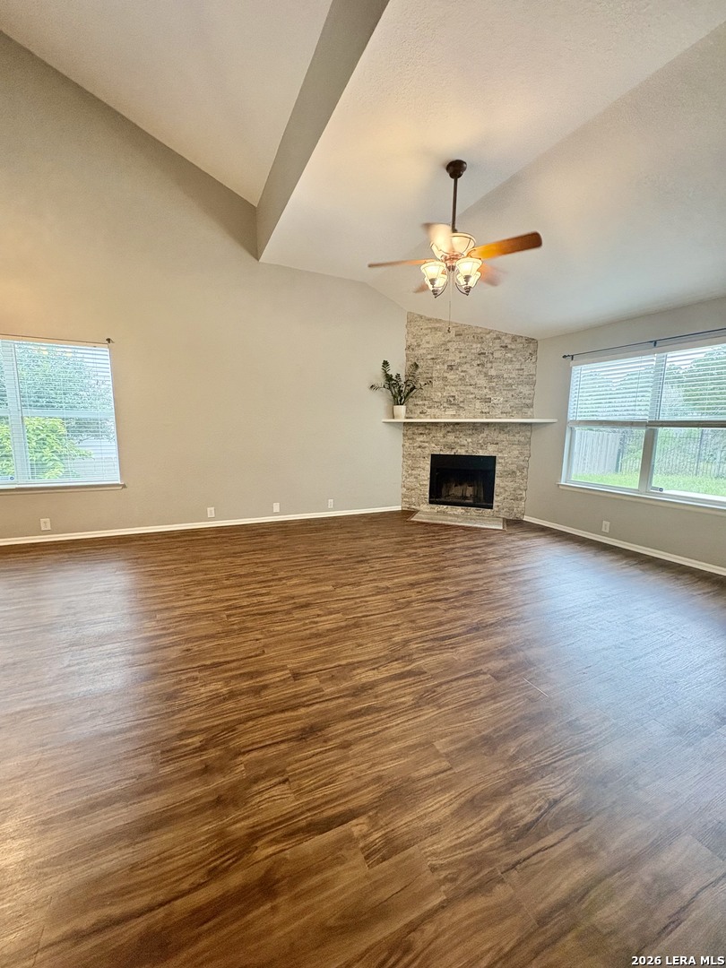 Exceptional home offers a spacious, functional floor plan in a prime location. The main floor features a primary suite and a versatile flex room or office with beautiful laminate wood flooring. An open layout flows seamlessly from the kitchen to the living area, which is characterized by the high ceilings, accent brick/stone wall and fireplace, and abundant natural light. The primary suite serves as a true retreat, complete with a separate shower, garden tub, large walk-in closet. Upstairs includes a large game room/loft, three bedrooms, Jack/Jill bathroom w/ double vanity. 2 of these bedrooms are particularly large and feature walk-in closets. Standout features include the private backyard, which backs up to a quiet greenbelt. You can enjoy the tranquility under the oversized, extended covered patio. HVAC system replaced 2024 /Sprinkler system front and back. Easy access to North 1604 and IH 10, placing it within 5 miles of UTSA, La Cantera Mall, Valero, USAA, and major hospitals and the New HEB.