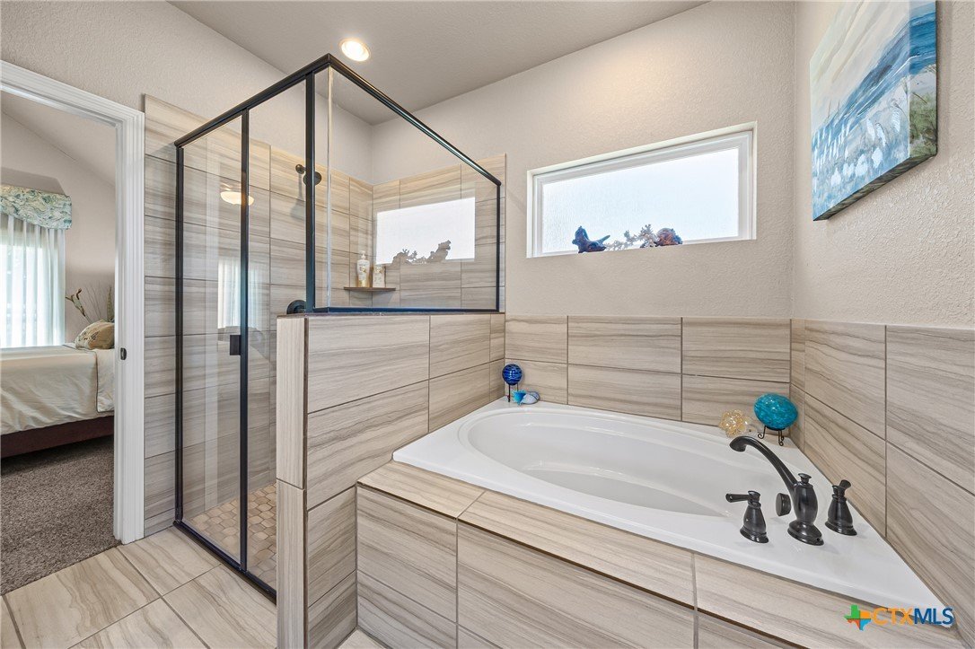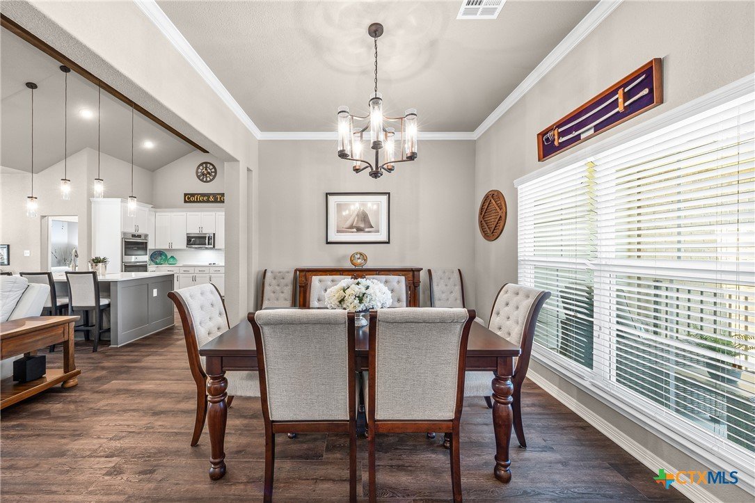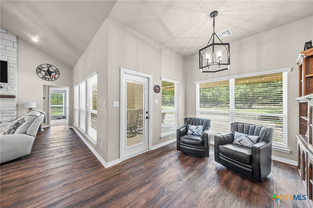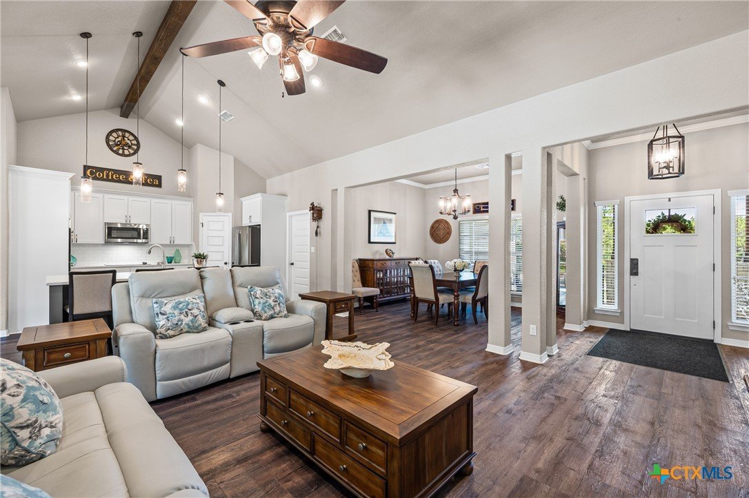This pristine one owner 4 bedroom, 3 bath, home is on a corner (2 lots) plus the seclusion of three (3) additional lots in Tanglewood's gated community. This home is ideal for entertaining and relaxing. The home features a formal and informal dining; an open concept living area with vaulted ceilings and wood beam ceiling; plus, a kitchen with built-in double ovens, vented microwave with convection and air fryer features; plus an island with spacious workspace, seating for four providing casual dining and entertaining. All of the bedrooms have bath access; one has a private entry and patio access. Flooring is Luxury Vinyl Wood Plank, carpet (in 3 bedrooms), one bedroom has a specialized rubber gym floor, and tile in all bathrooms. The back patio has an outdoor fireplace, sink, and a mini fridge. The back patio is pre-wired for a TV and has a 20-foot-wide remote control electric awning. This house has foam insulation in the attic and conventional batt insulation in the walls. Home security includes the seven (7) camera Hi-Def Infra-Red security cameras with DVR recorder. An over-sized 2 car garage with side storage. Backyard has wooded privacy fencing on 2 sides. This home blends comfort, style, and functionality in a serene, secure setting and privacy! NO CITY TAXES, Belton Schools, boat ramps nearby! Schedule your appointment today!