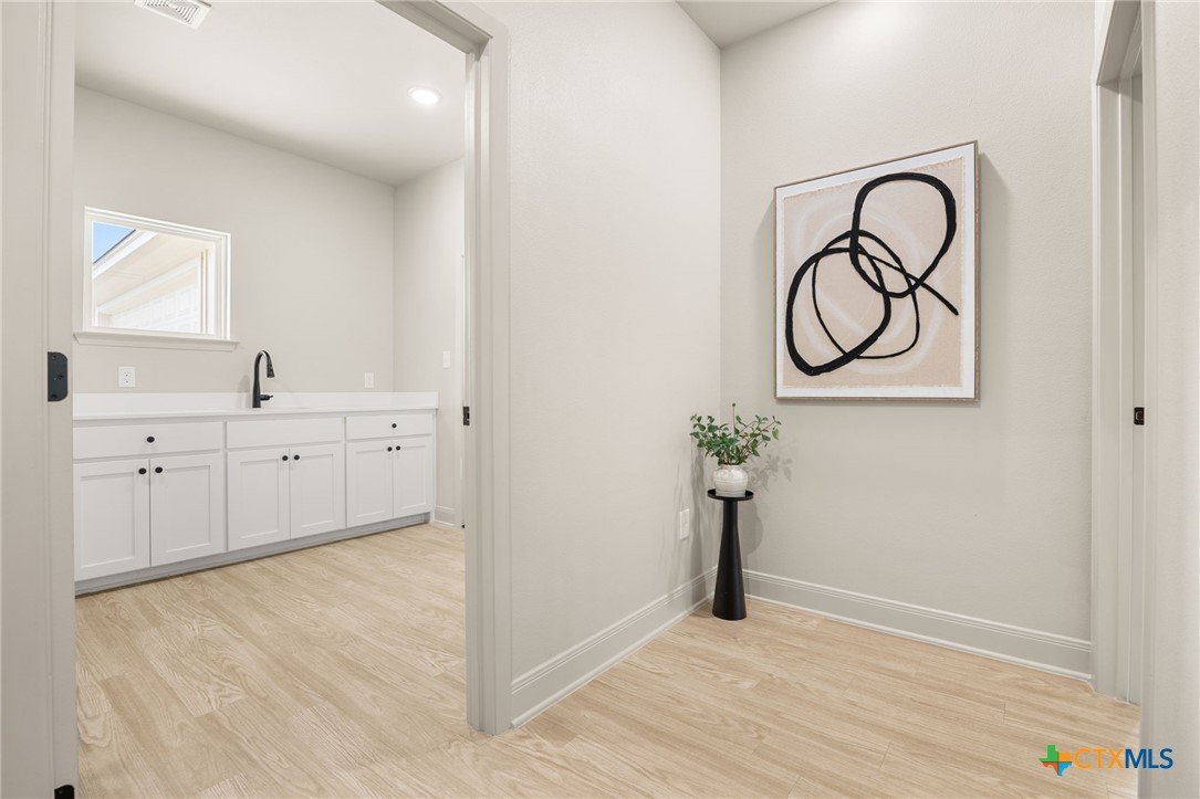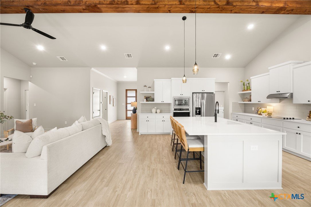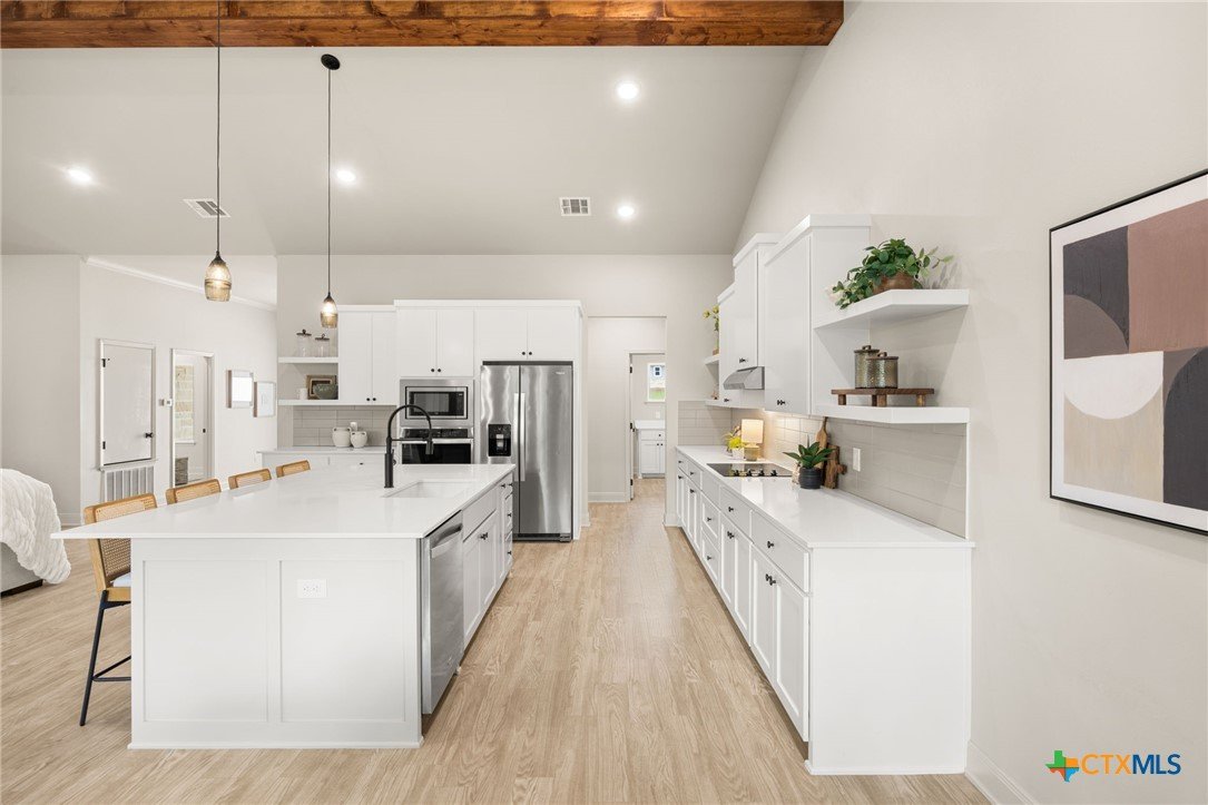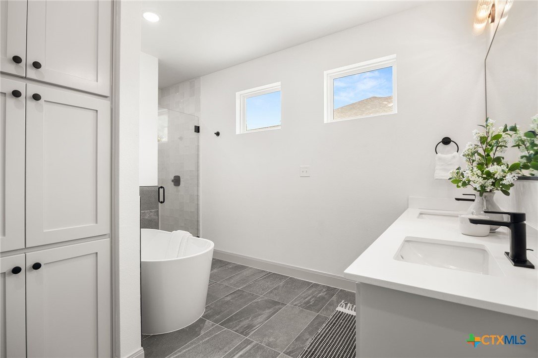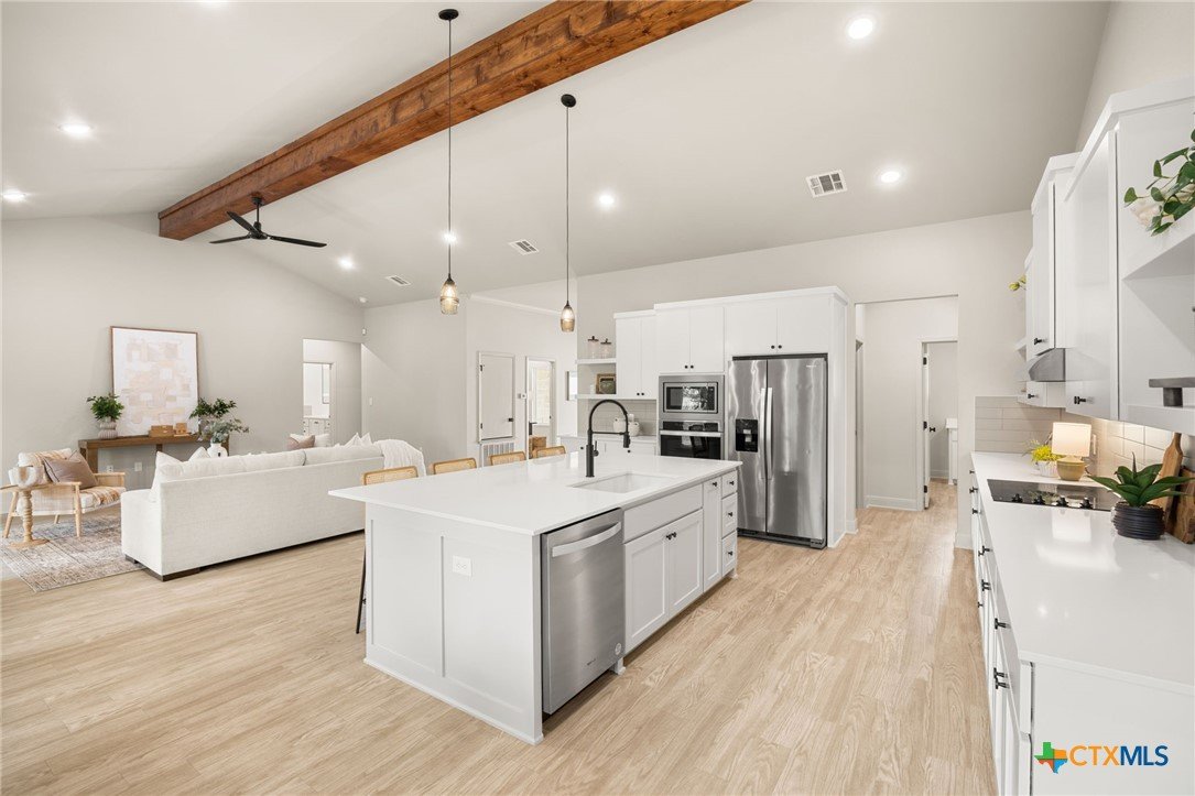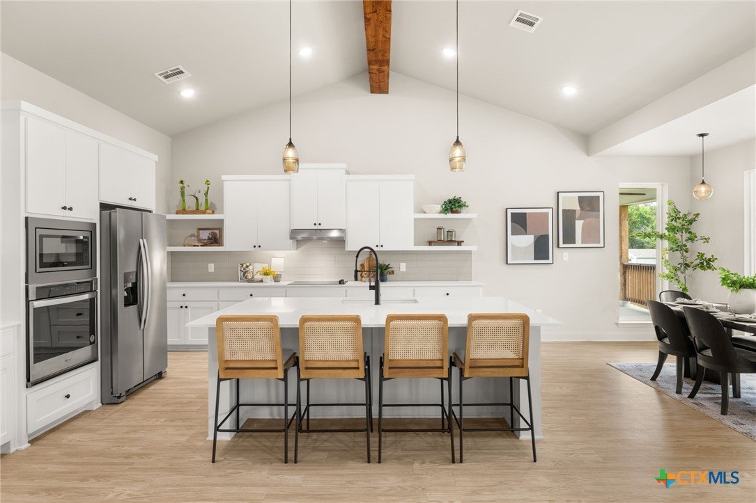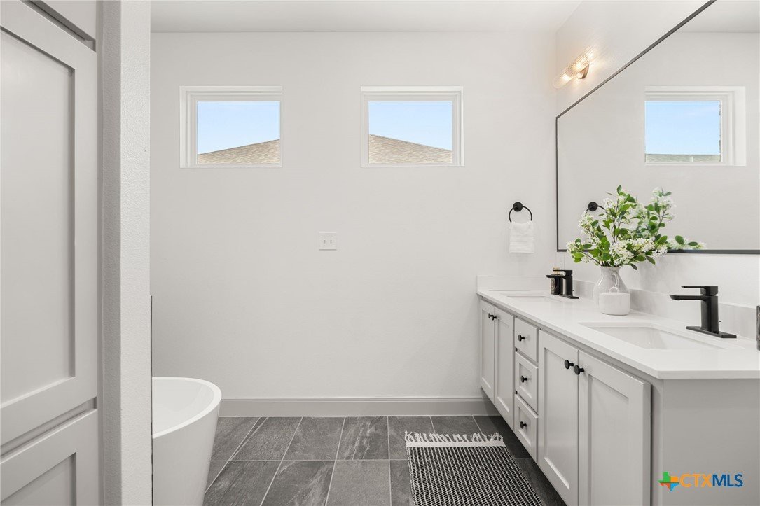 Welcome to this stunning home nestled inside a gated community with top-tier amenities including a neighborhood pool, playground, and a scenic trail leading to the lake—all with the added benefit of no city taxes. With over 2,700 square feet of living space, this 4-bedroom, 2.5-bath property offers a perfect mix of modern design and everyday comfort. The exterior showcases a beautiful blend of stone and Hardie siding, creating standout curb appeal. Inside, the home features an airy, open layout filled with natural light and finished with durable luxury vinyl plank flooring throughout—no carpet in sight. The kitchen is designed to impress with custom cabinetry, quartz countertops, a stylish matte-toned backsplash, and stainless steel Whirlpool appliances. The adjoining dining area is enhanced by modern three-pendant lighting, creating a sleek and inviting space for everyday meals or entertaining. Additional features include a large walk-in pantry, a spacious laundry room with a utility sink, and a 2-car garage that offers extra room for a workshop or storage. The primary suite provides a quiet escape with private access to the back patio. The ensuite bathroom includes dual vanities, a soaking tub, and a beautifully tiled walk-in shower for a spa-like feel. Situated on a spacious lot, the backyard offers plenty of room to relax, entertain, or create your ideal outdoor setup. This move-in ready home delivers style, function, and valuable savings with no city taxes—all in a great Temple location.