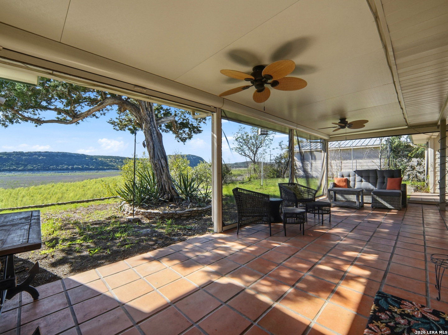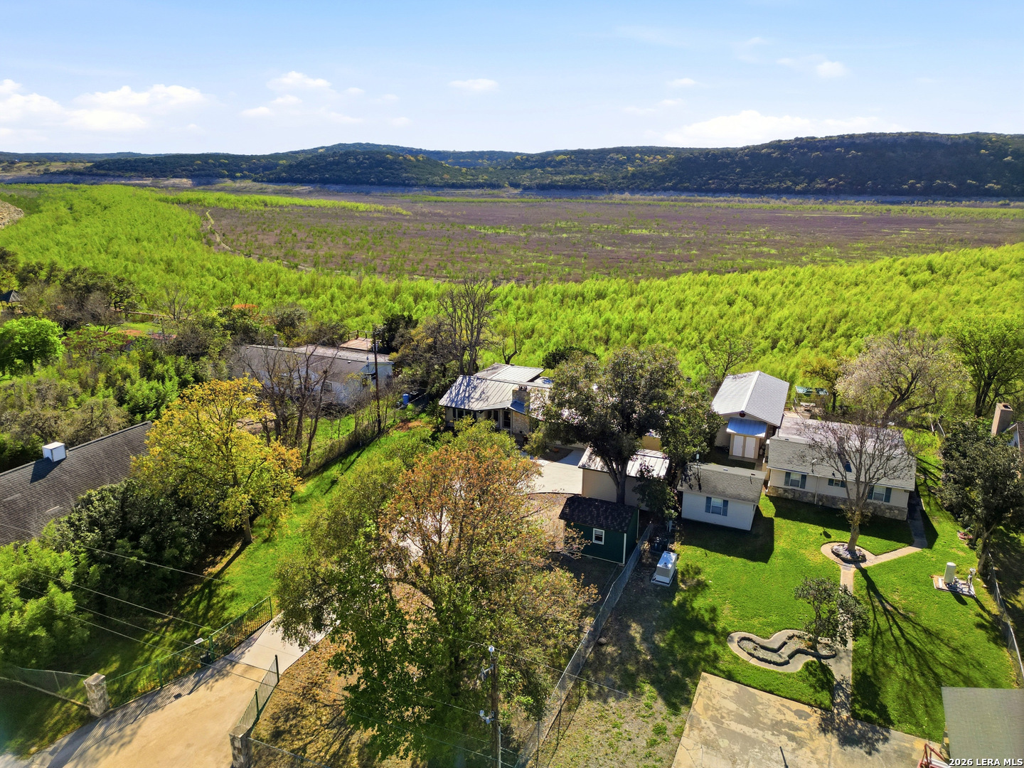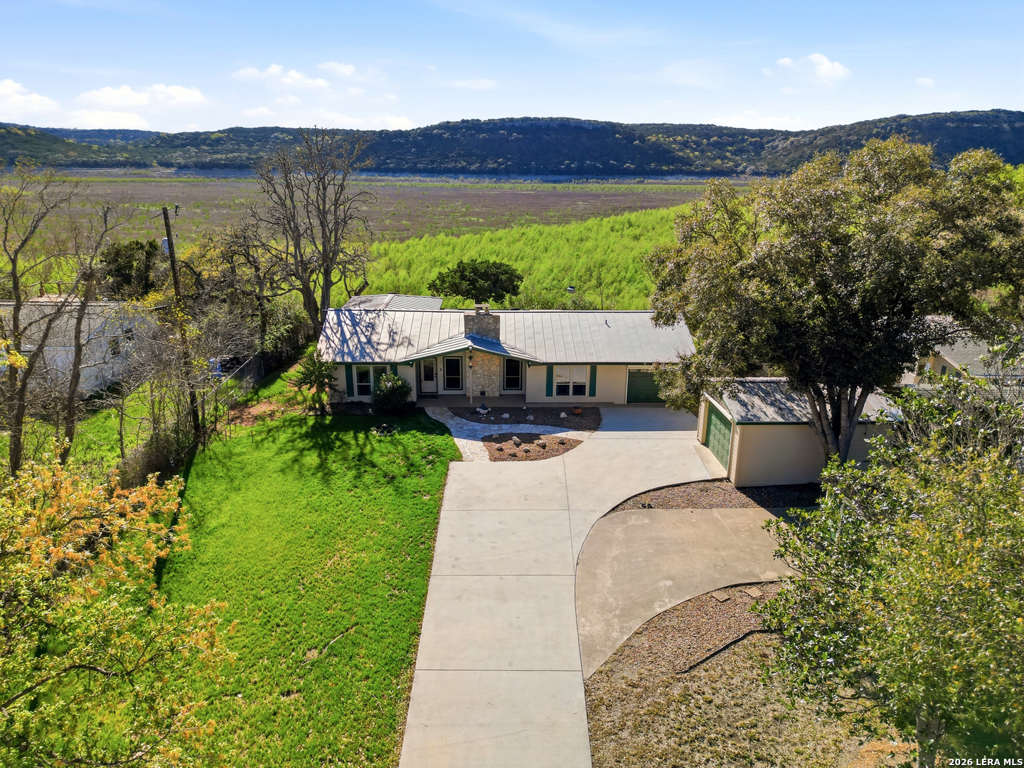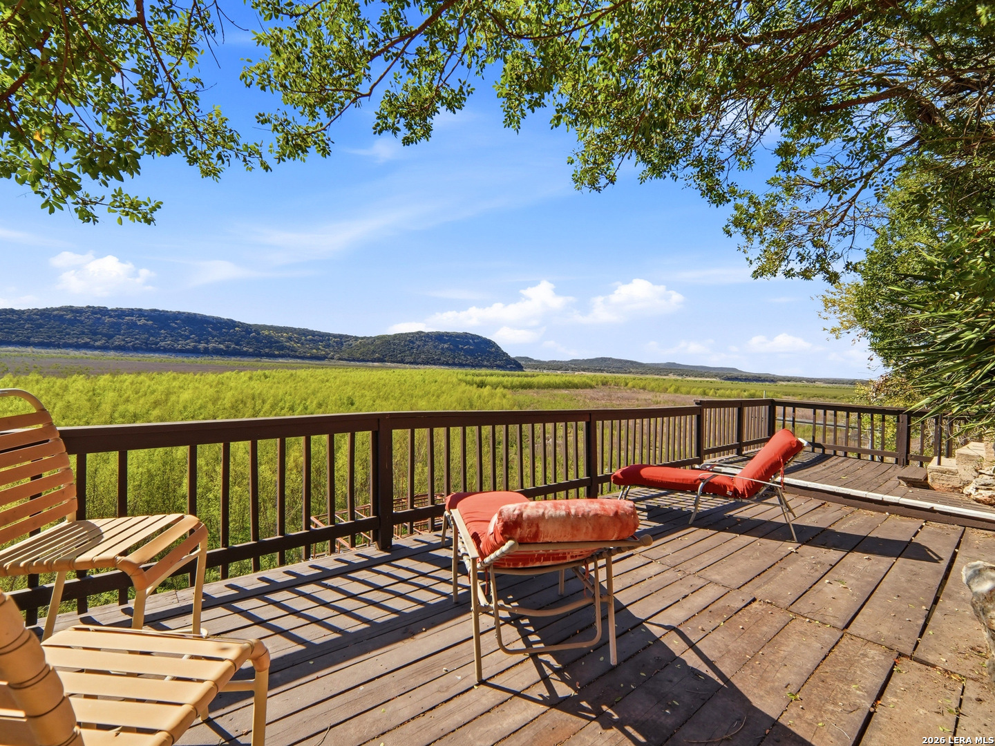 Experience lakefront living just minutes from San Antonio in this well-maintained one-story home in the desirable Lakehills area. This unique 3-bedroom, 3-bath secluded property offers a great setting for enjoying the private and serene Hill Country with panoramic views. An open concept floor plan features a spacious kitchen with brand new countertops, opening to comfortable living areas highlighted by a beautiful stone fireplace-perfect for cozy evenings. The oversized primary suite offers relaxing countryside views and a jacuzzi tub for a private retreat. Outdoor living shines with a 25-foot deck overlooking the Medina Lake countryside, where you can enjoy spectacular sunsets and expansive Hill Country vistas. A motorized screened patio adds additional space for relaxing or entertaining. Located on a quiet, secluded road in one of Lakehills' premier sections, the fully fenced property includes an electric gate, extended concrete driveway, two garages, and a small, air-conditioned shop with a new roof-ideal for hobbies or storage. Durable standing seam metal roofing and Hardie plank siding make this home perfect as a full-time residence, weekend getaway, or gathering place for family and friends. This property is priced to sell and is being offered as-is. Buyer to independently verify all information and conduct their own due diligence.