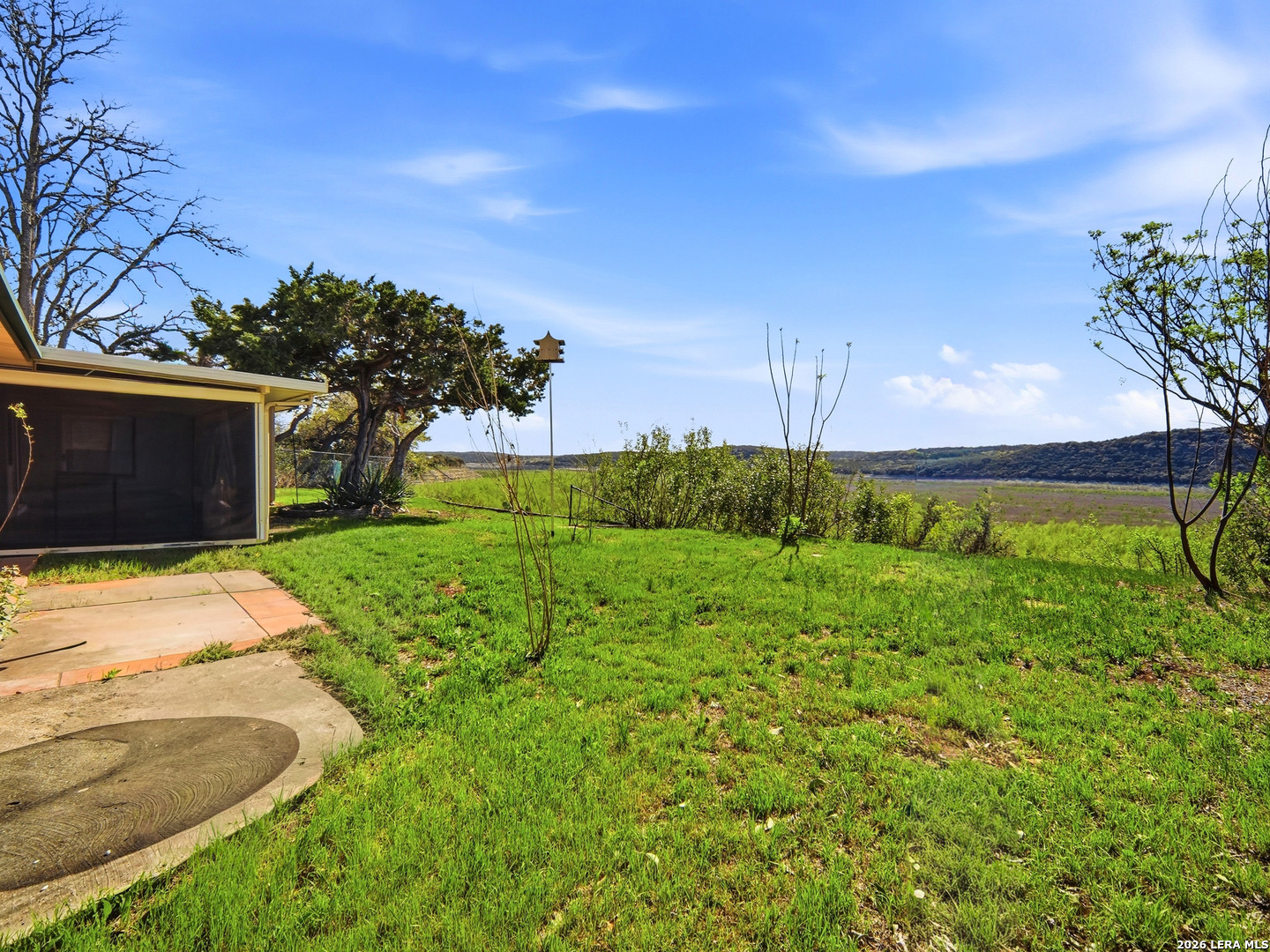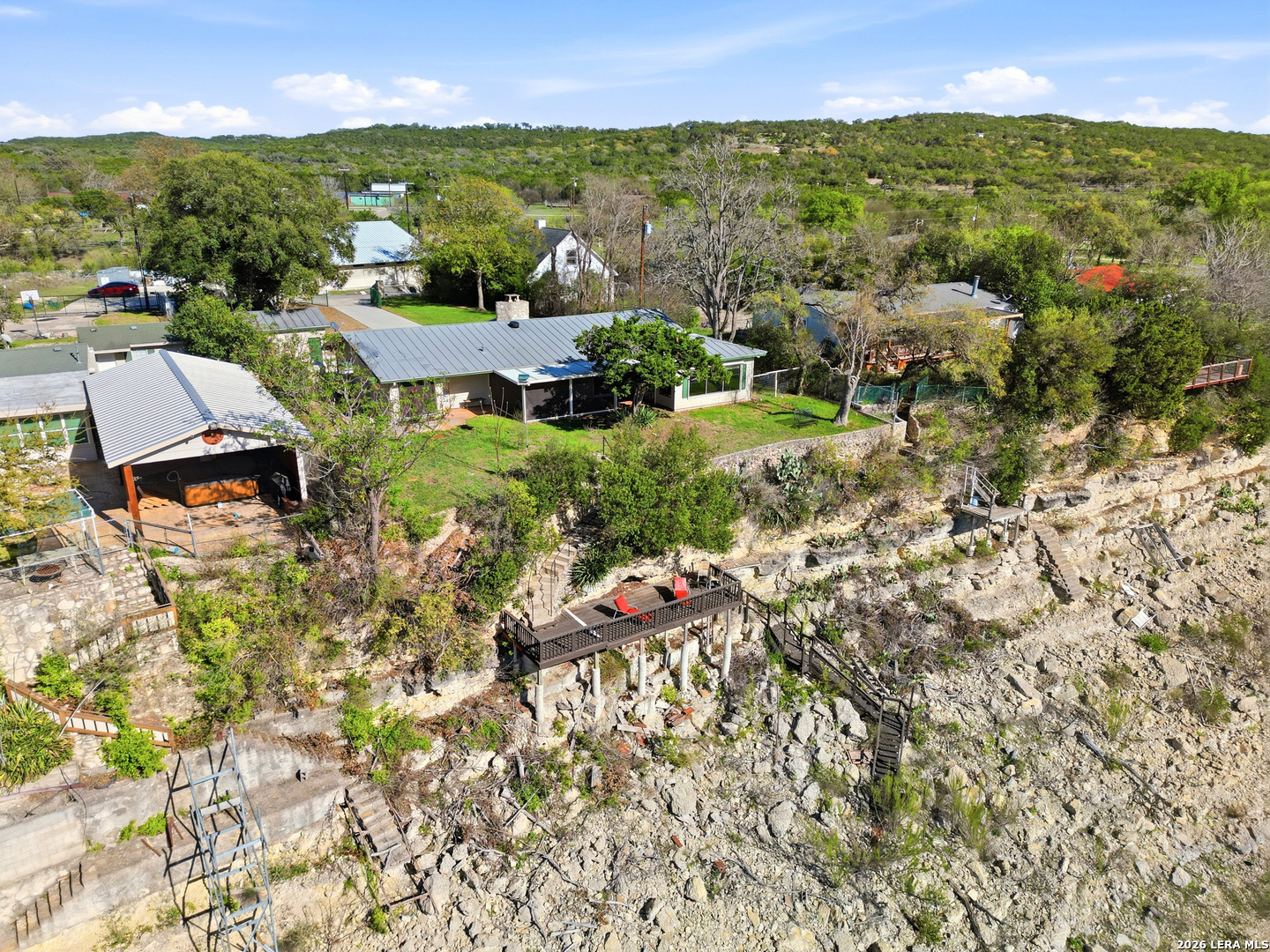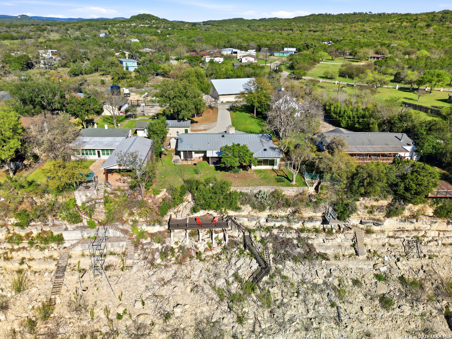 Experience lakefront living just minutes from San Antonio in this well-maintained one-story home in the desirable Lakehills area. This unique 3-bedroom, 3-bath secluded property offers a great setting for enjoying the private and serene Hill Country with panoramic views. An open concept floor plan features a spacious kitchen with brand new countertops, opening to comfortable living areas highlighted by a beautiful stone fireplace-perfect for cozy evenings. The oversized primary suite offers relaxing countryside views and a jacuzzi tub for a private retreat. Outdoor living shines with a 25-foot deck overlooking the Medina Lake countryside, where you can enjoy spectacular sunsets and expansive Hill Country vistas. A motorized screened patio adds additional space for relaxing or entertaining. Located on a quiet, secluded road in one of Lakehills' premier sections, the fully fenced property includes an electric gate, extended concrete driveway, two garages, and a small, air-conditioned shop with a new roof-ideal for hobbies or storage. Durable standing seam metal roofing and Hardie plank siding make this home perfect as a full-time residence, weekend getaway, or gathering place for family and friends. This property is priced to sell and is being offered as-is. Buyer to independently verify all information and conduct their own due diligence.