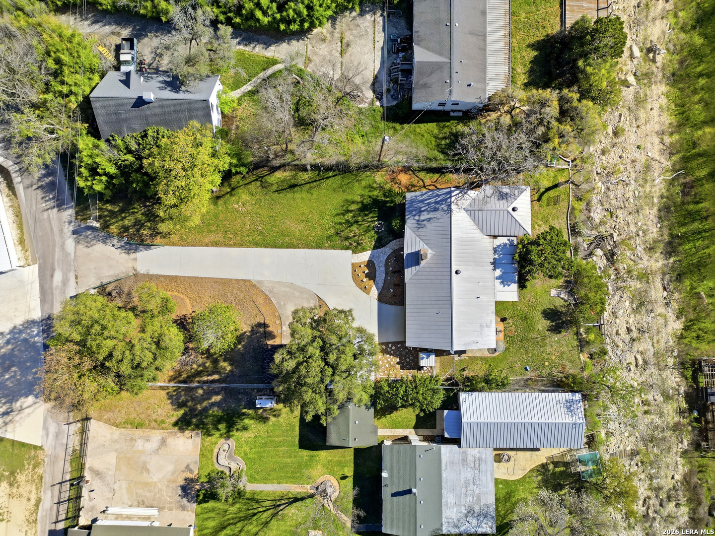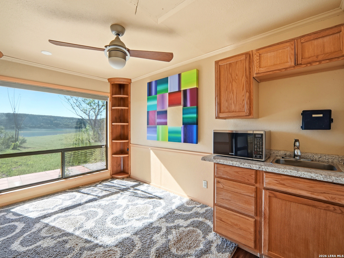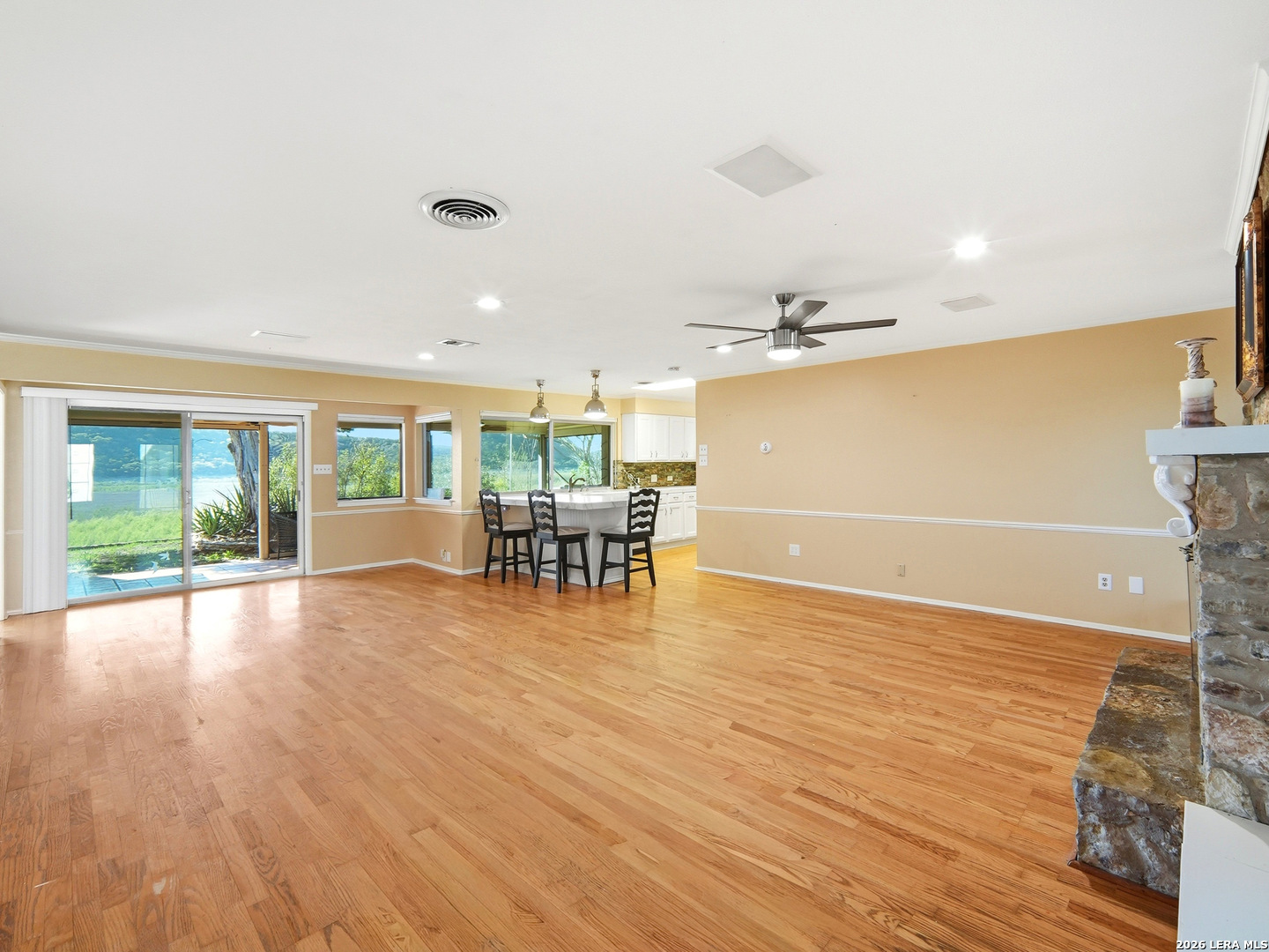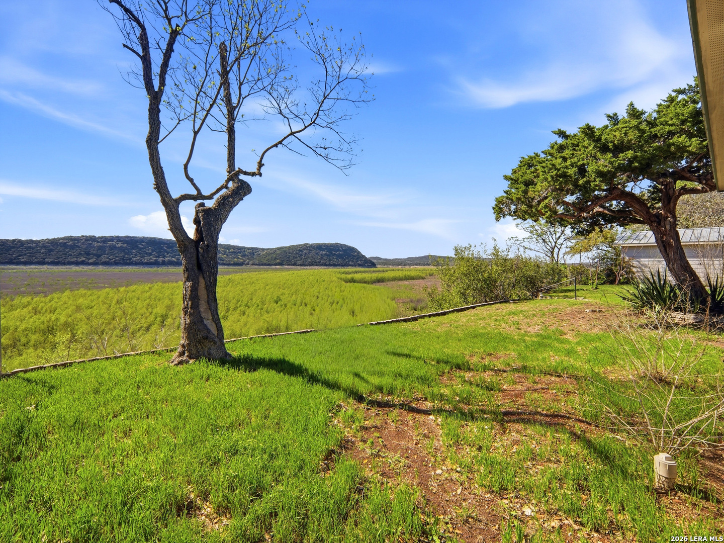 Experience lakefront living just minutes from San Antonio in this well-maintained one-story home in the desirable Lakehills area. This unique 3-bedroom, 3-bath secluded property offers a great setting for enjoying the private and serene Hill Country with panoramic views. An open concept floor plan features a spacious kitchen with brand new countertops, opening to comfortable living areas highlighted by a beautiful stone fireplace-perfect for cozy evenings. The oversized primary suite offers relaxing countryside views and a jacuzzi tub for a private retreat. Outdoor living shines with a 25-foot deck overlooking the Medina Lake countryside, where you can enjoy spectacular sunsets and expansive Hill Country vistas. A motorized screened patio adds additional space for relaxing or entertaining. Located on a quiet, secluded road in one of Lakehills' premier sections, the fully fenced property includes an electric gate, extended concrete driveway, two garages, and a small, air-conditioned shop with a new roof-ideal for hobbies or storage. Durable standing seam metal roofing and Hardie plank siding make this home perfect as a full-time residence, weekend getaway, or gathering place for family and friends. This property is priced to sell and is being offered as-is. Buyer to independently verify all information and conduct their own due diligence.