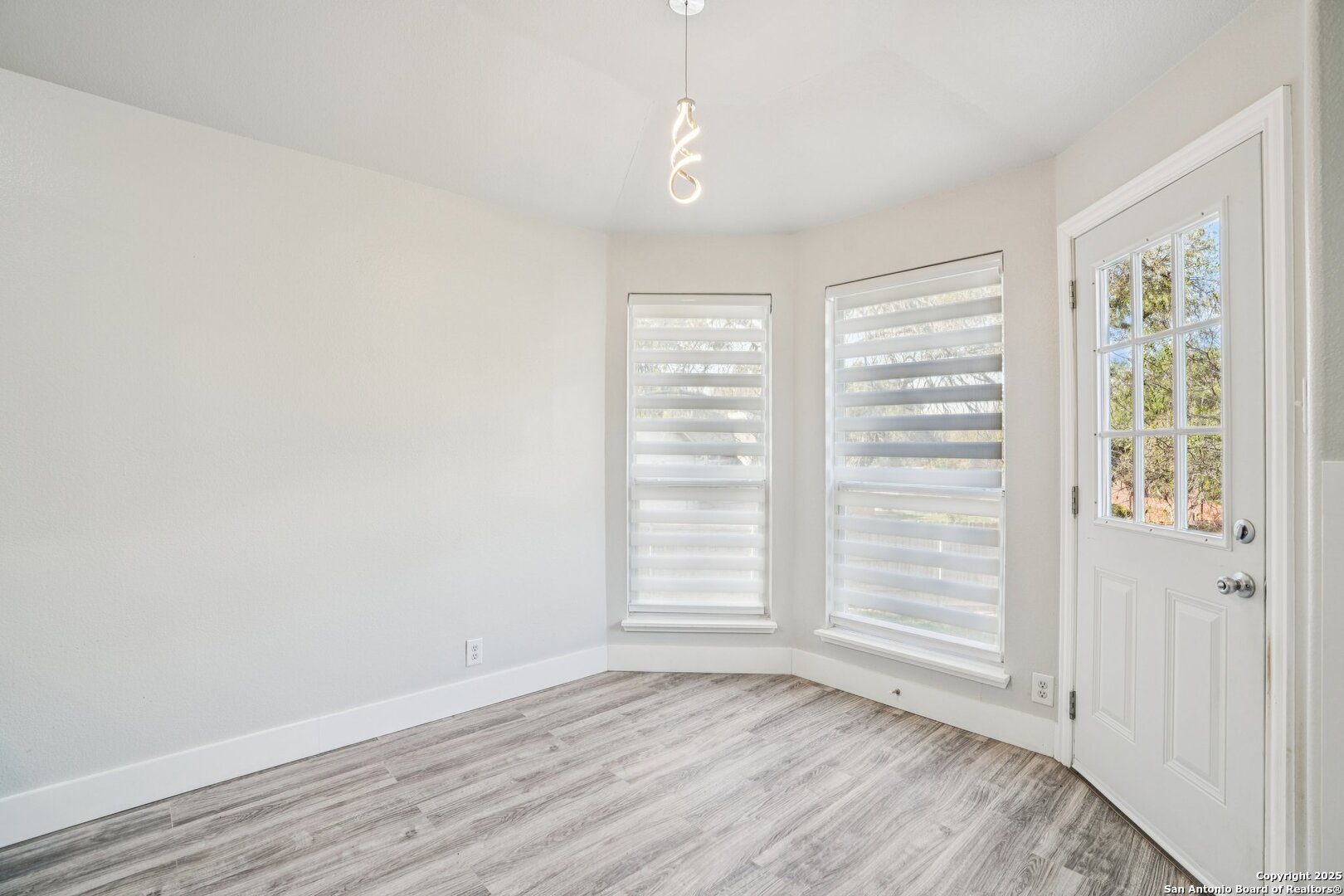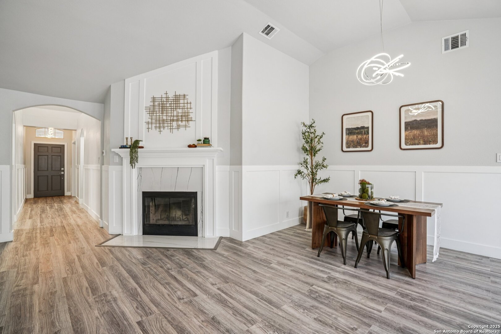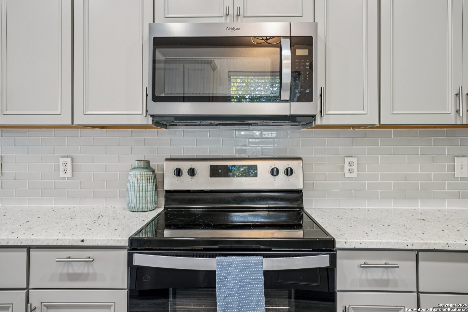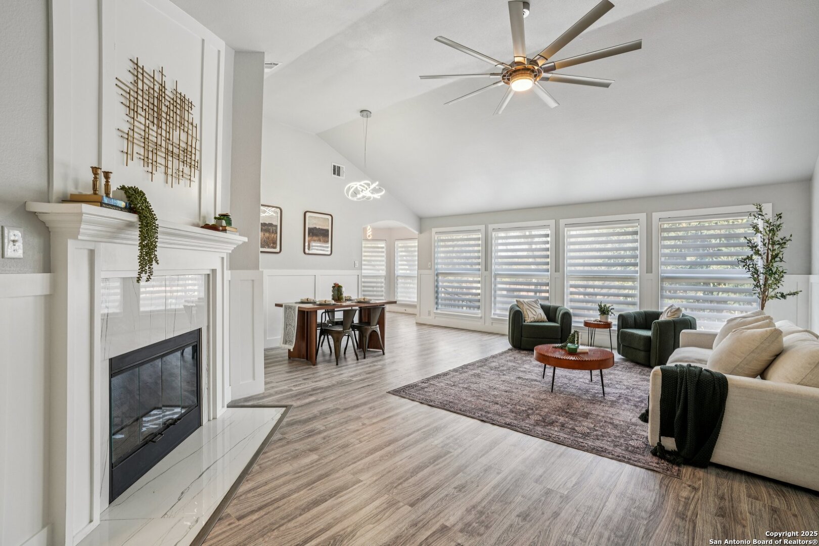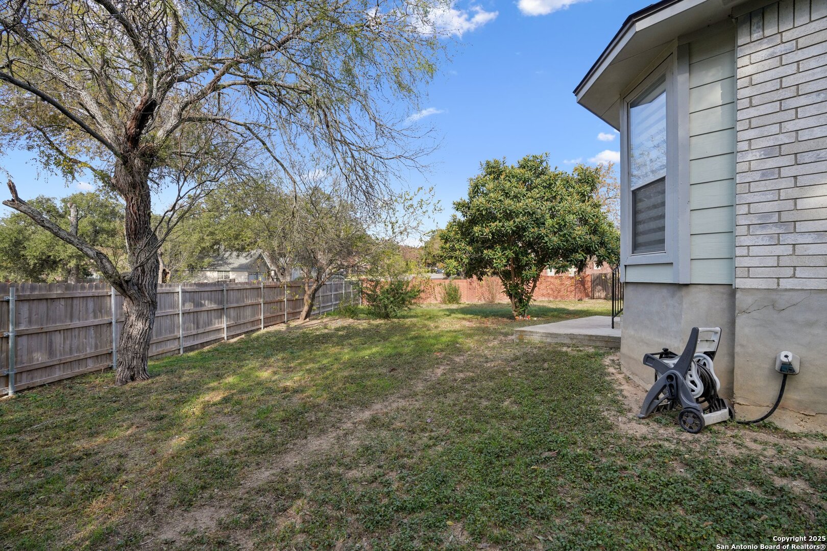 Located in the desirable Greenshire neighborhood, this beautifully renovated home offers a comfortable blend of classic character and modern updates. The light-filled interior features wainscoting accents, a welcoming fireplace, and a functional layout designed for everyday living. The updated kitchen includes sleek countertops, stainless steel appliances, and a spacious walk-in pantry, making it ideal for both cooking and entertaining. The primary suite provides a private retreat with a garden tub, separate shower, and ample closet space. Outside, enjoy a peaceful setting on the private patio overlooking an oversized lot with mature trees. Conveniently located near shopping, dining, major highways, and Randolph AFB, this home delivers comfort, style, and a prime location in one of Schertz's most established communities.