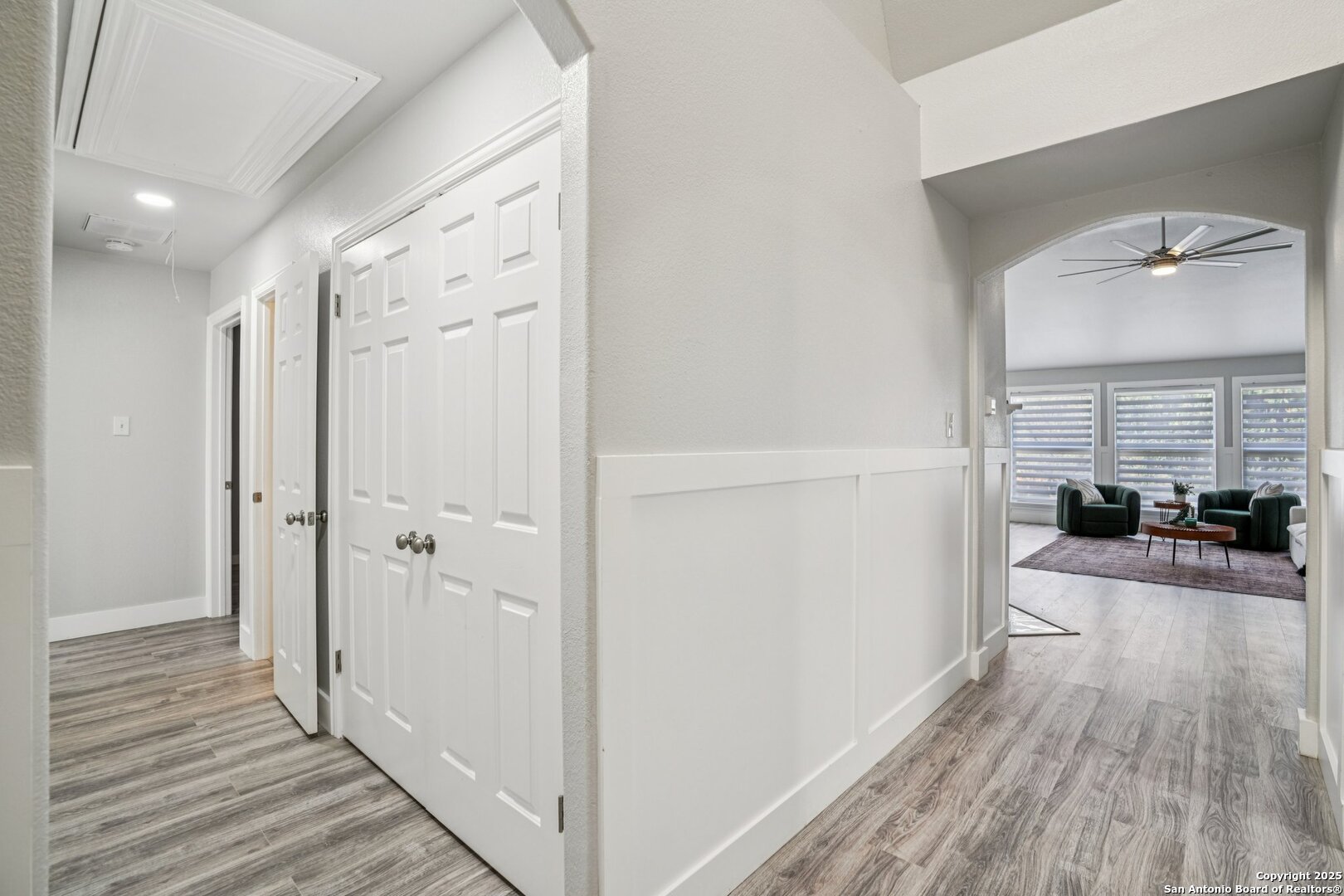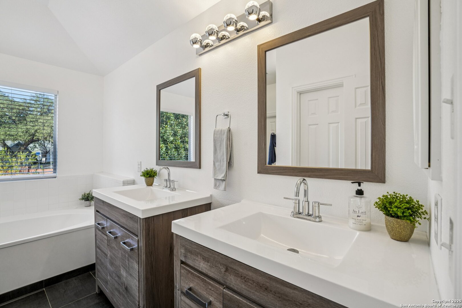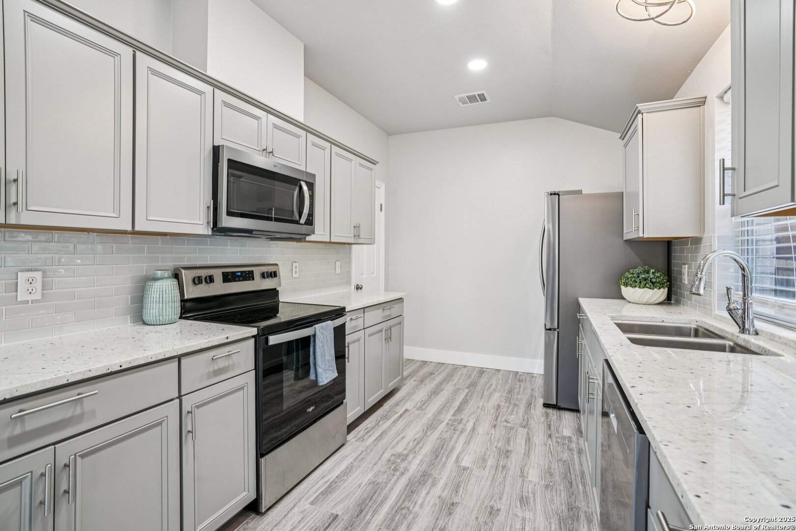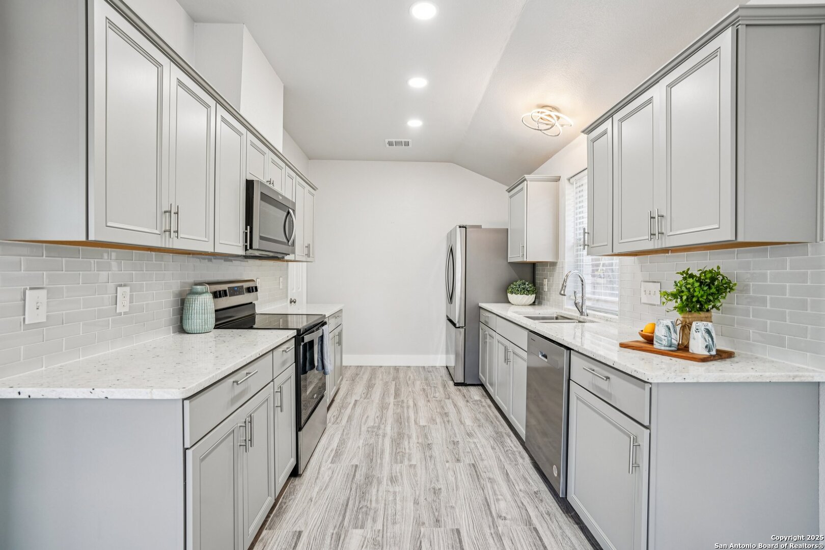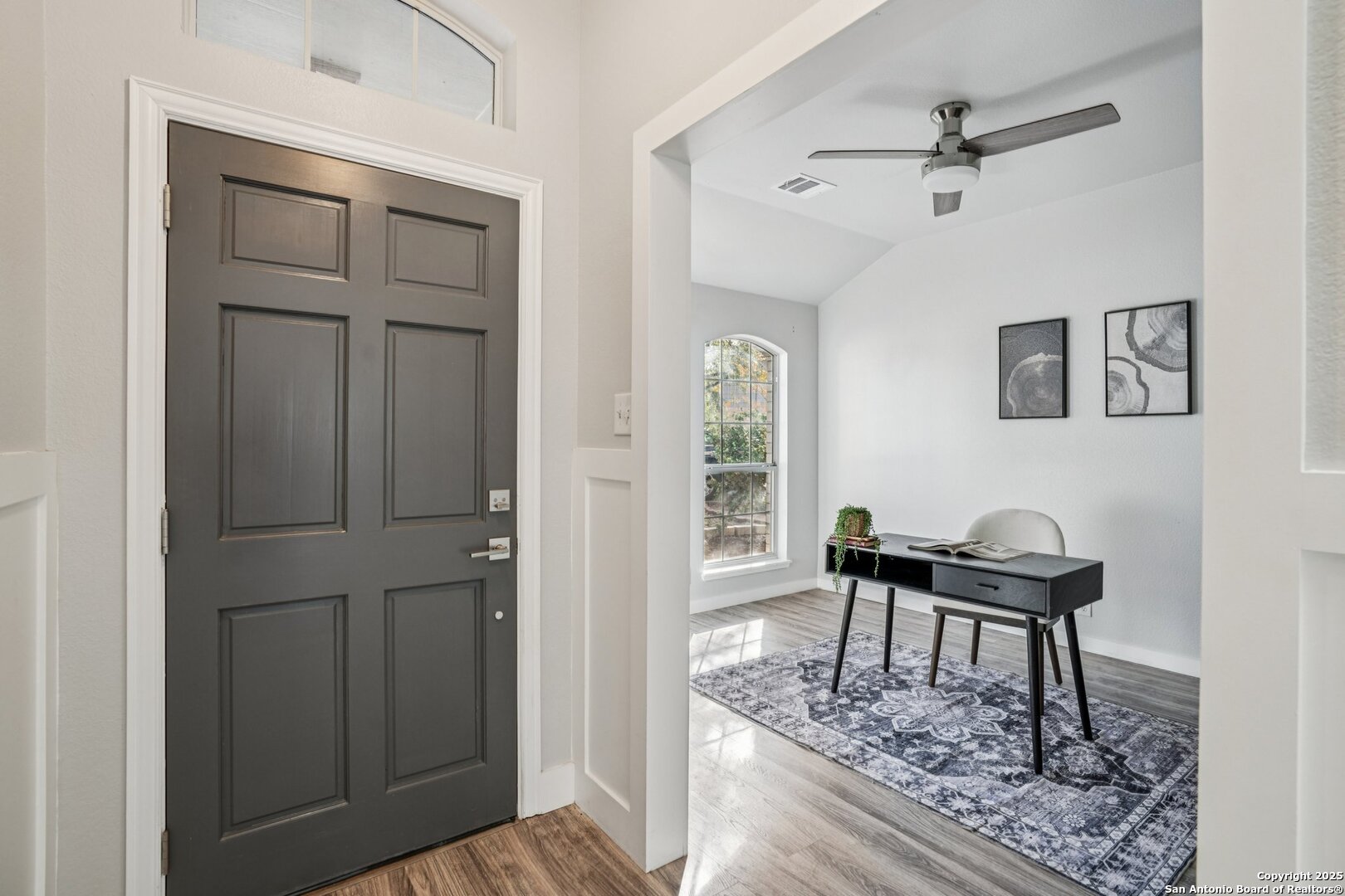Located in the desirable Greenshire neighborhood, this beautifully renovated home offers a comfortable blend of classic character and modern updates. The light-filled interior features wainscoting accents, a welcoming fireplace, and a functional layout designed for everyday living. The updated kitchen includes sleek countertops, stainless steel appliances, and a spacious walk-in pantry, making it ideal for both cooking and entertaining. The primary suite provides a private retreat with a garden tub, separate shower, and ample closet space. Outside, enjoy a peaceful setting on the private patio overlooking an oversized lot with mature trees. Conveniently located near shopping, dining, major highways, and Randolph AFB, this home delivers comfort, style, and a prime location in one of Schertz's most established communities.