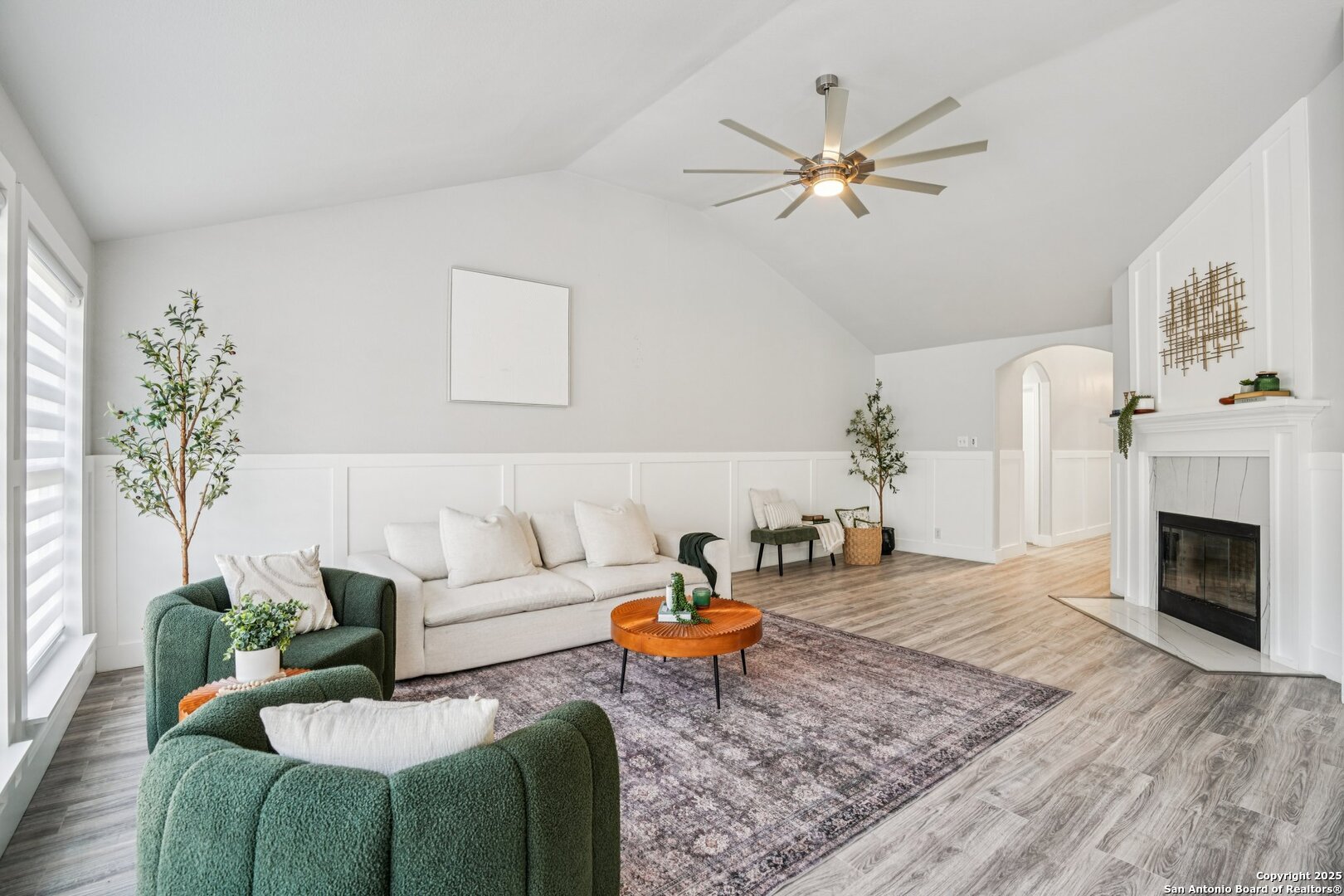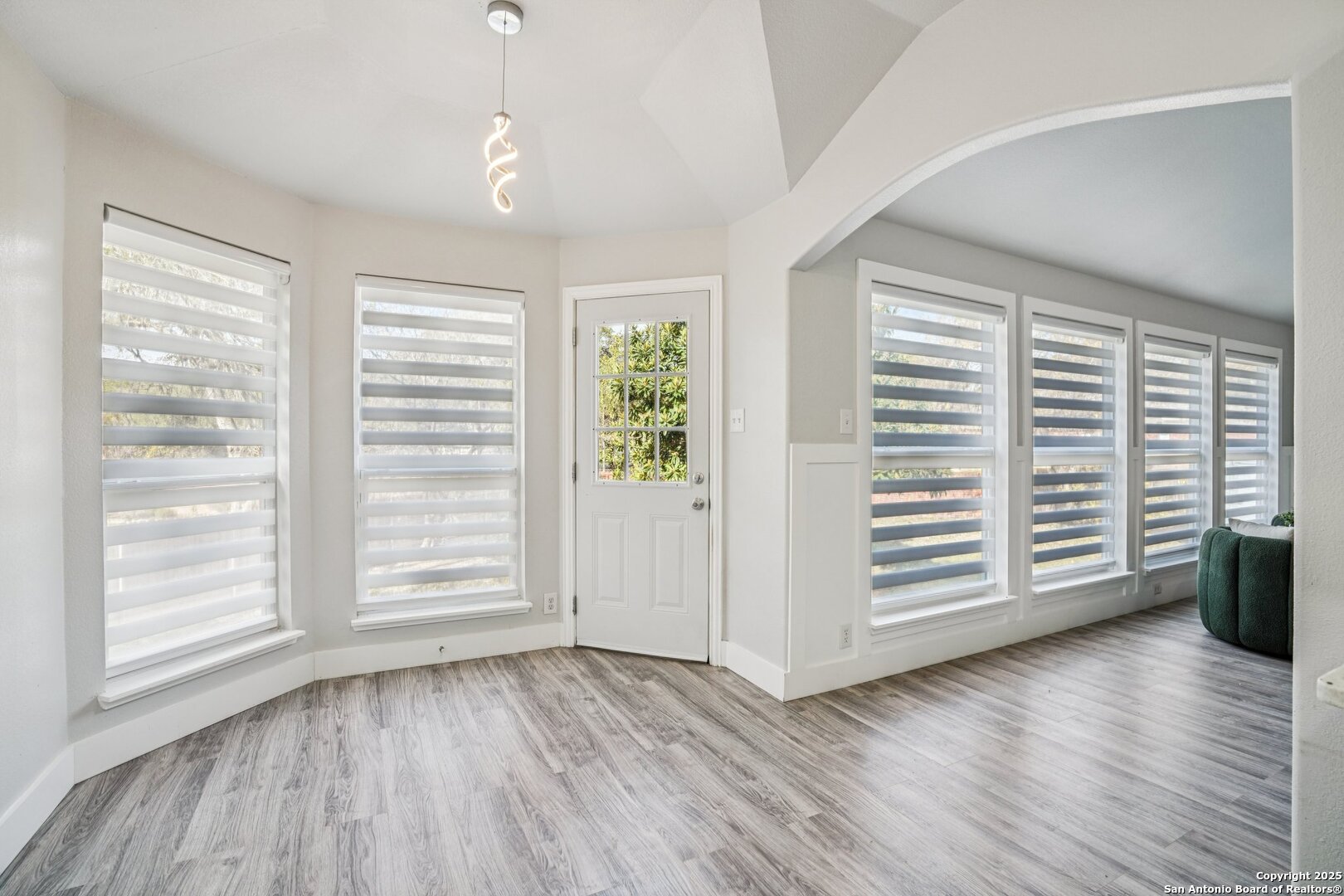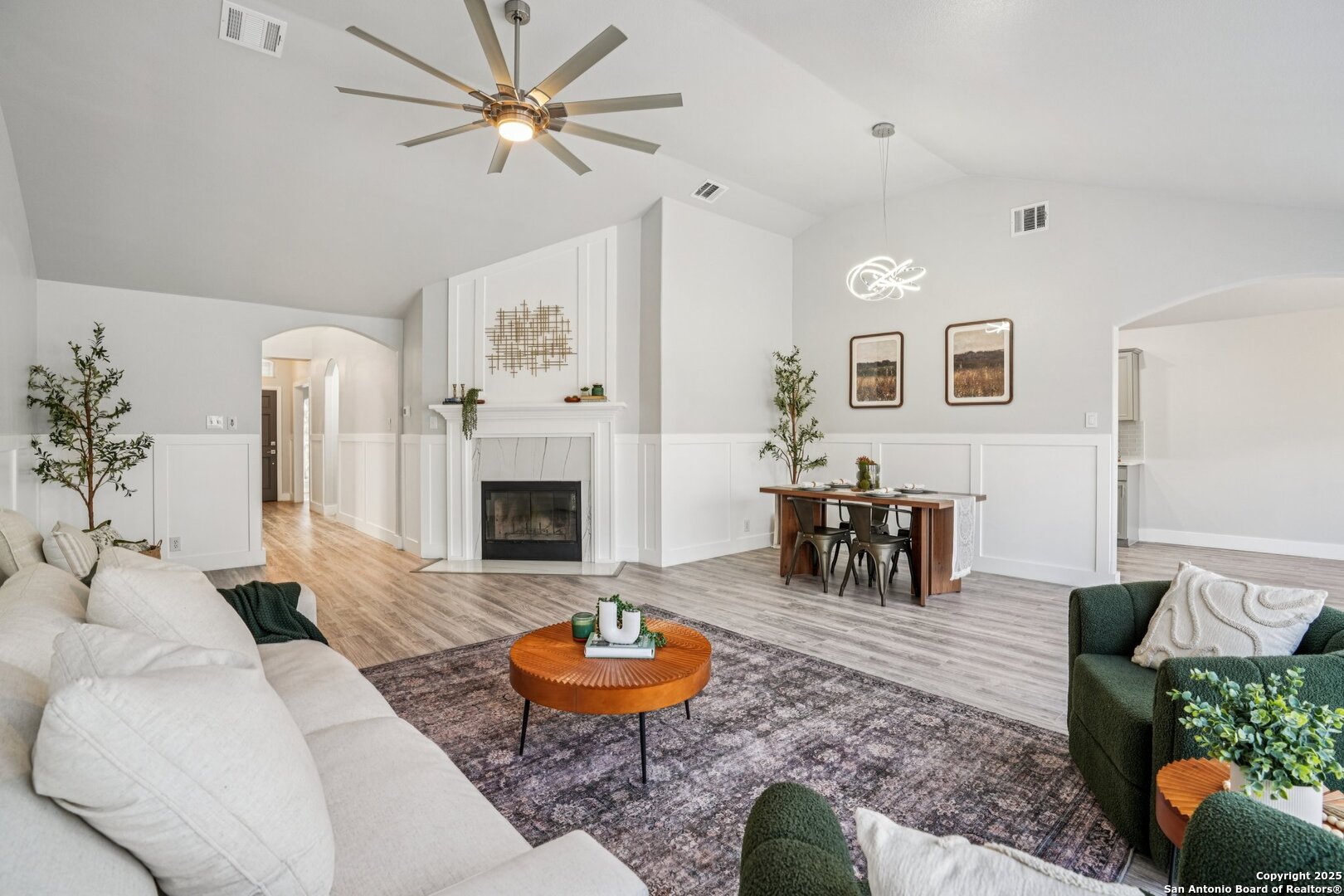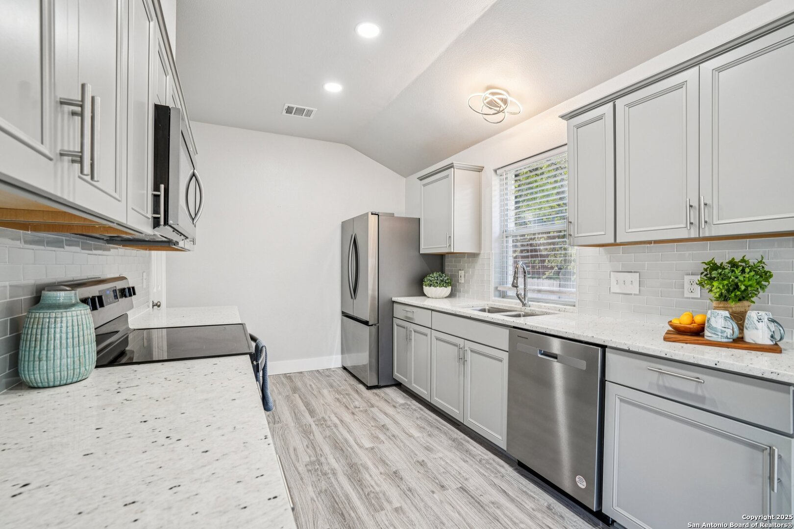 Located in the desirable Greenshire neighborhood, this beautifully renovated home offers a comfortable blend of classic character and modern updates. The light-filled interior features wainscoting accents, a welcoming fireplace, and a functional layout designed for everyday living. The updated kitchen includes sleek countertops, stainless steel appliances, and a spacious walk-in pantry, making it ideal for both cooking and entertaining. The primary suite provides a private retreat with a garden tub, separate shower, and ample closet space. Outside, enjoy a peaceful setting on the private patio overlooking an oversized lot with mature trees. Conveniently located near shopping, dining, major highways, and Randolph AFB, this home delivers comfort, style, and a prime location in one of Schertz's most established communities.