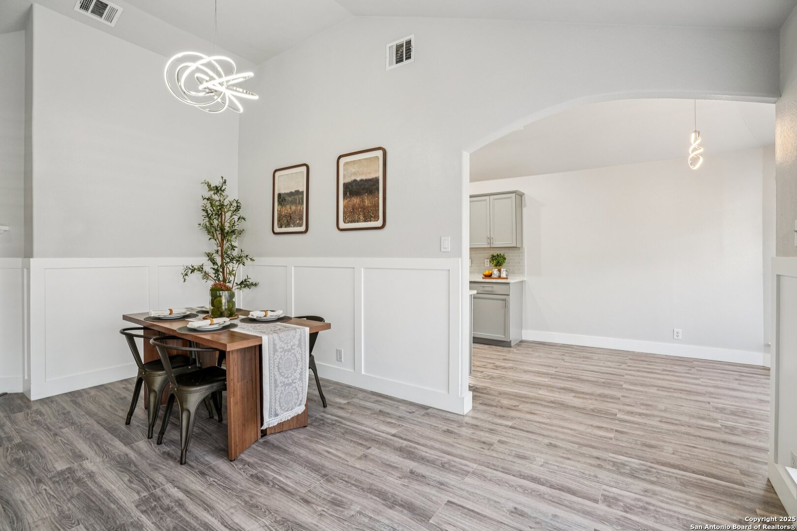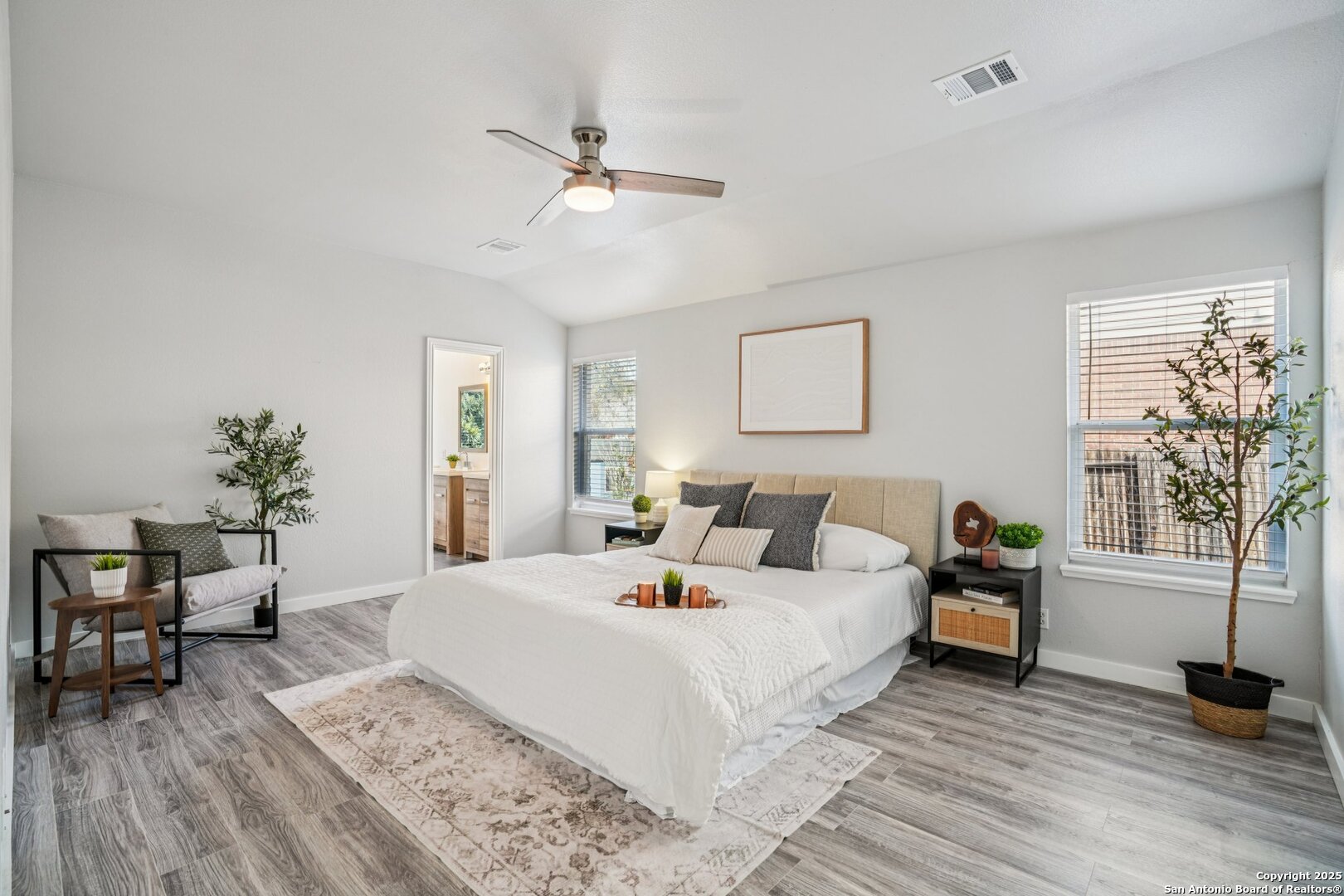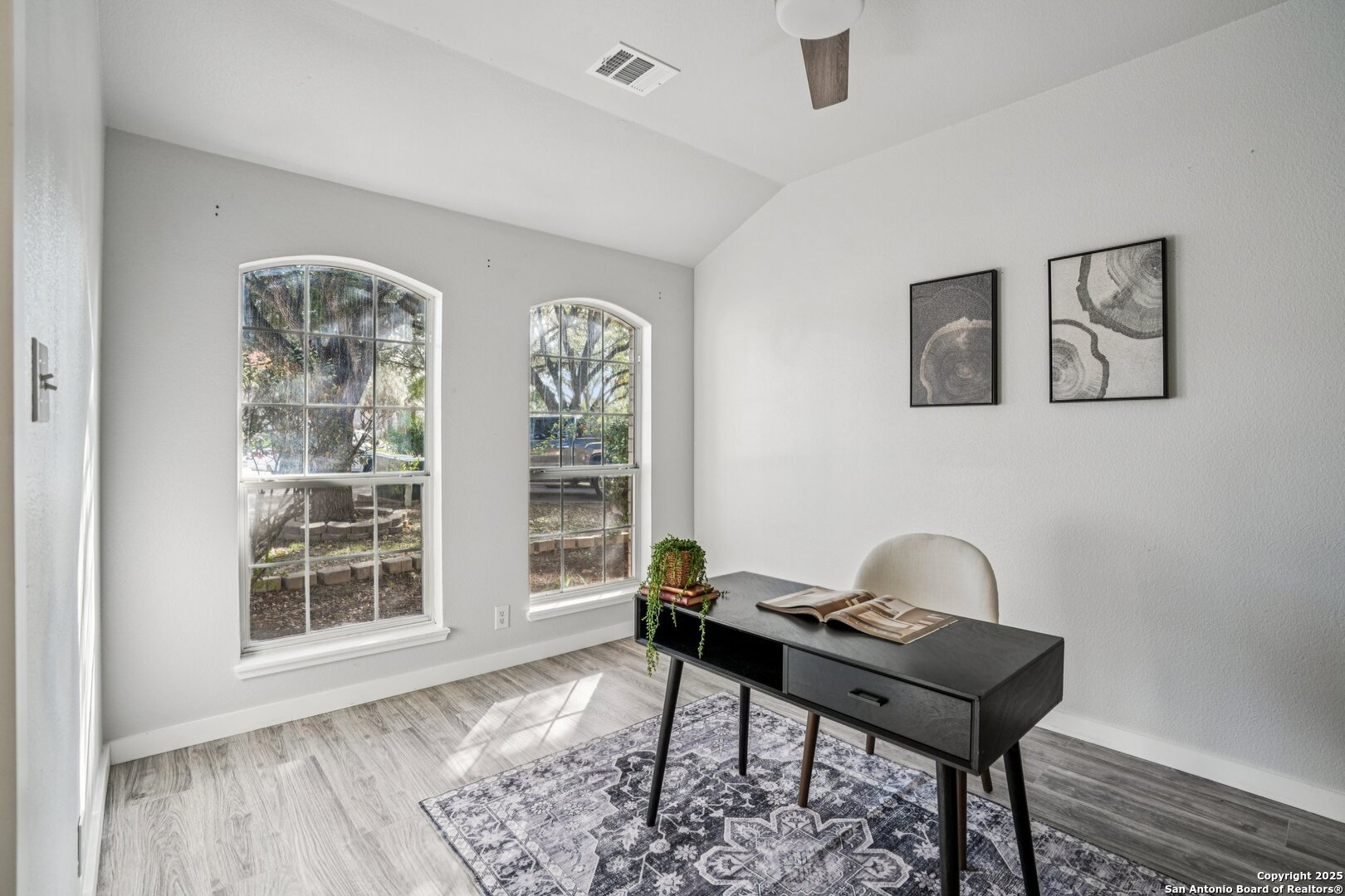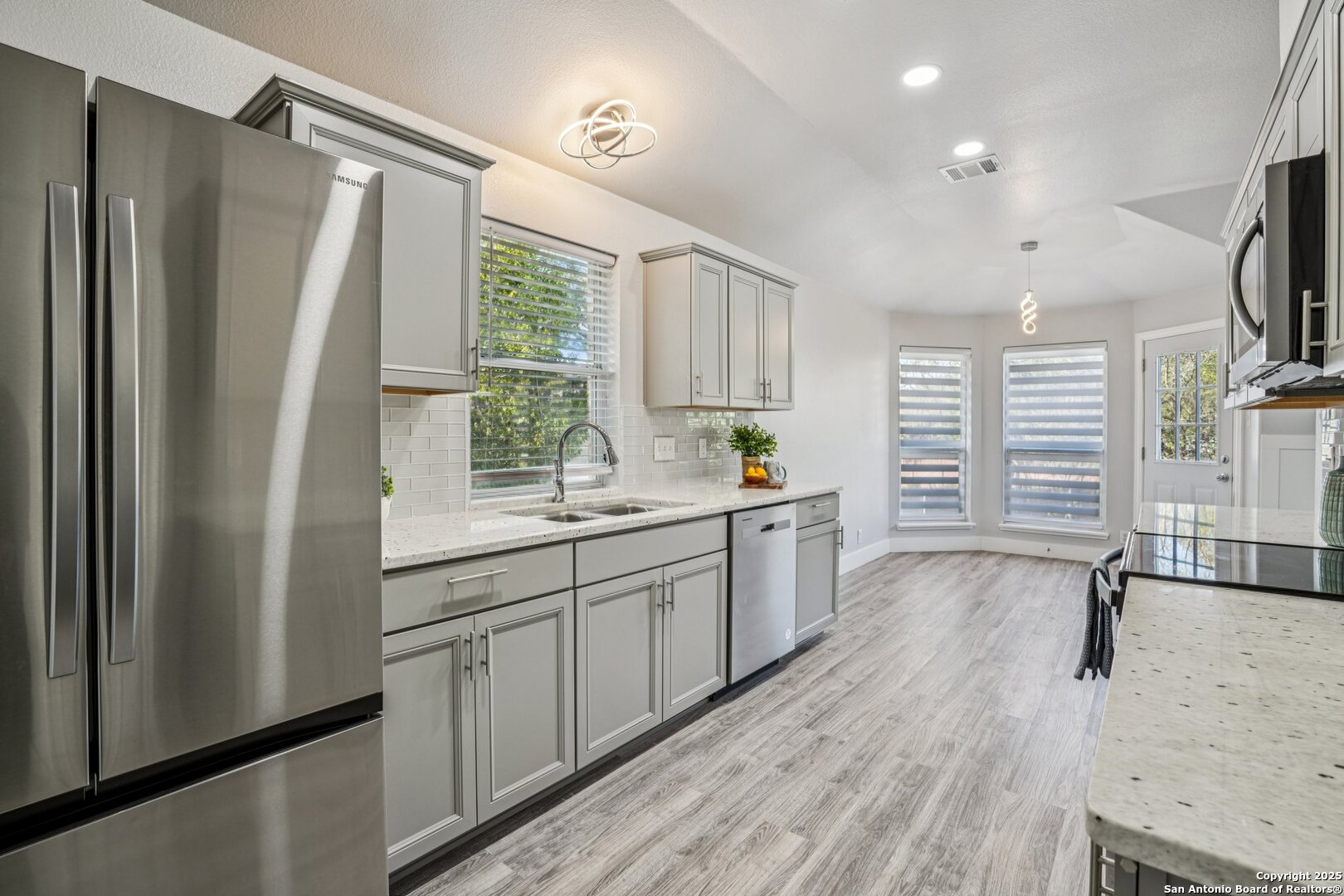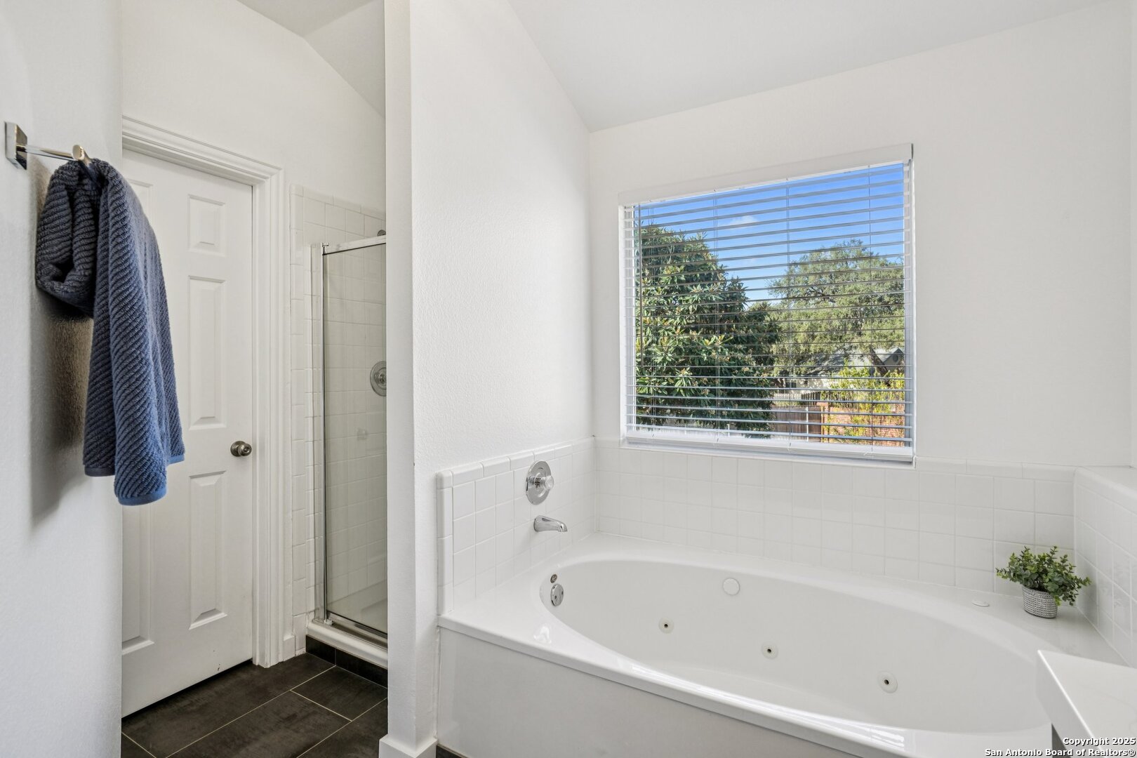 Located in the desirable Greenshire neighborhood, this beautifully renovated home offers a comfortable blend of classic character and modern updates. The light-filled interior features wainscoting accents, a welcoming fireplace, and a functional layout designed for everyday living. The updated kitchen includes sleek countertops, stainless steel appliances, and a spacious walk-in pantry, making it ideal for both cooking and entertaining. The primary suite provides a private retreat with a garden tub, separate shower, and ample closet space. Outside, enjoy a peaceful setting on the private patio overlooking an oversized lot with mature trees. Conveniently located near shopping, dining, major highways, and Randolph AFB, this home delivers comfort, style, and a prime location in one of Schertz's most established communities.