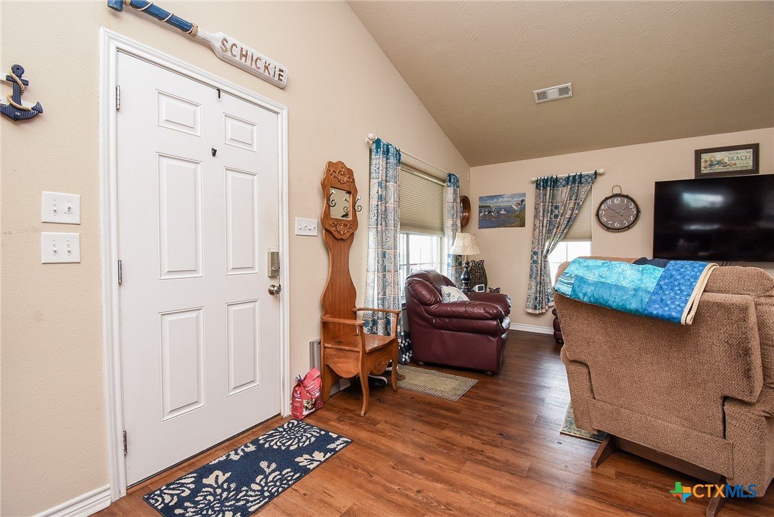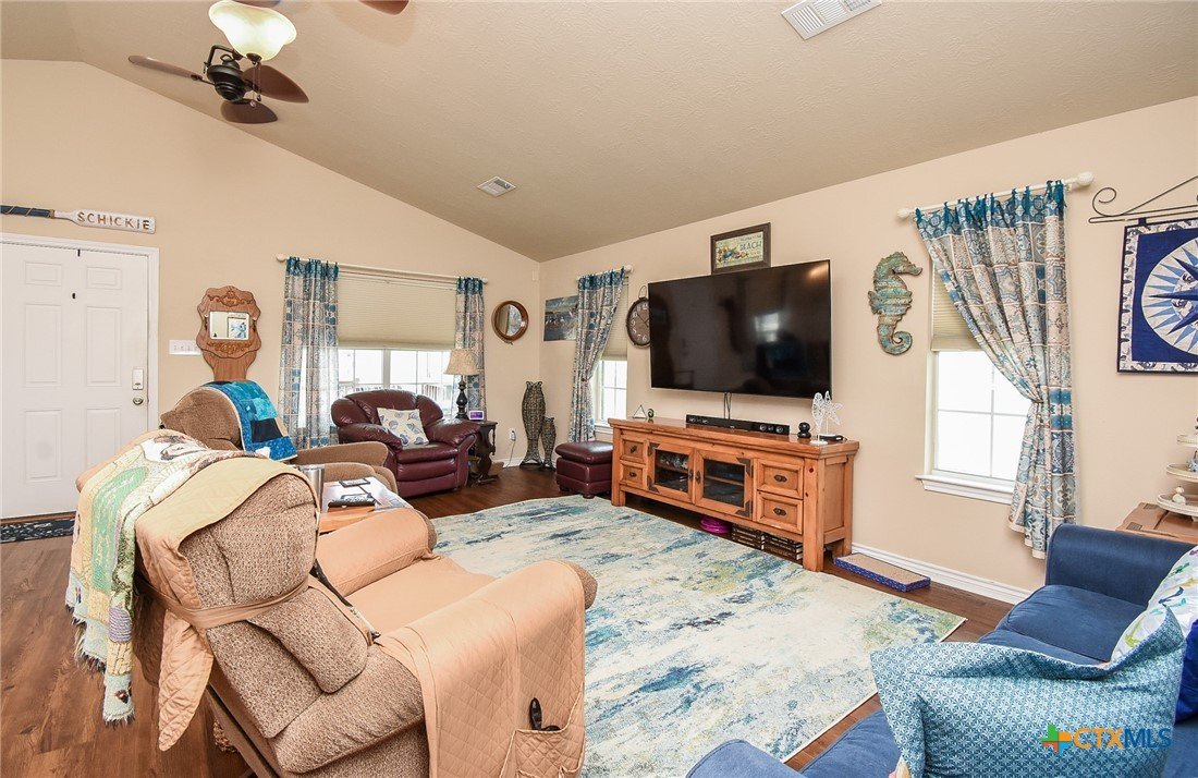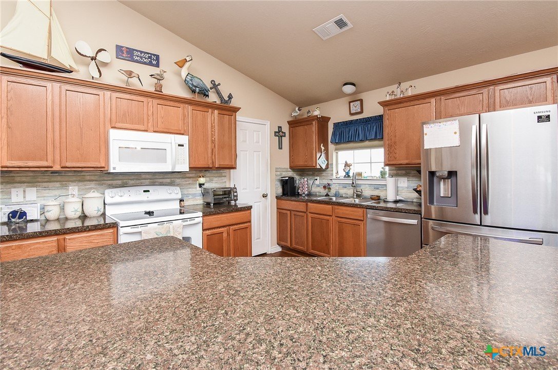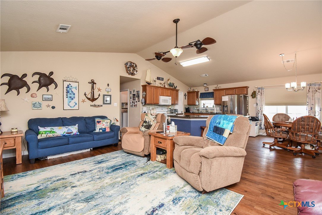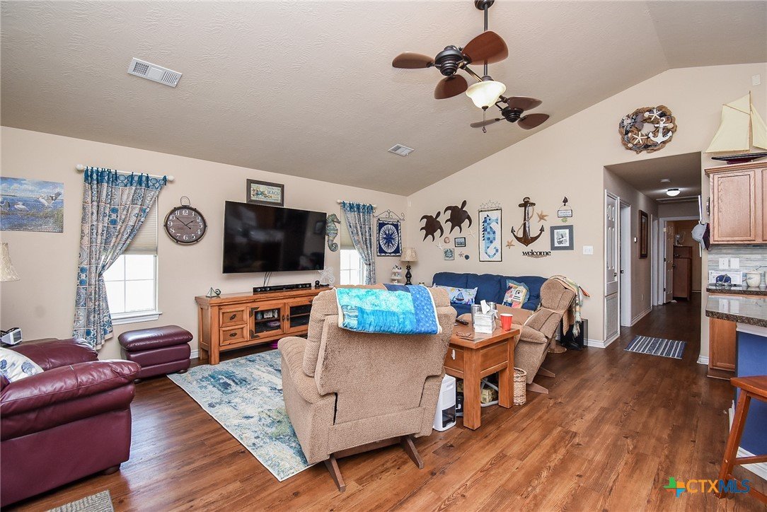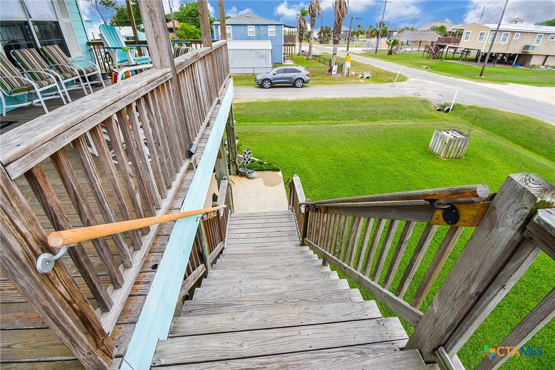 Welcome home to 16 Peggy St. in the Clarence Schicke subdivision, locally known as Schicke Point. Enjoy the sunset facing views of Carancahua Bay from your 12x28 covered patio. Situated on 1/3 acre corner lot, this home boasts 3 parking stalls and 2 garage spaces under the home, a storage building and a 20x40 covered RV storage with concrete pad. The garage has been climatized with insulation and mini-split A/C, and don't miss the 1/4 bath toilet room. Step inside to an open floor plan with vaulted ceiling, a spacious kitchen with pantry and island, and hurricane-rated screens covering double-paned windows. The primary bedroom offers outside access to a staircase and cargo lift for your convenience and ensuite bath. The laundry facilities are just behind the kitchen for ease of use on the main floor. Whether you are searching for a primary residence or weekend retreat, this home has it all!