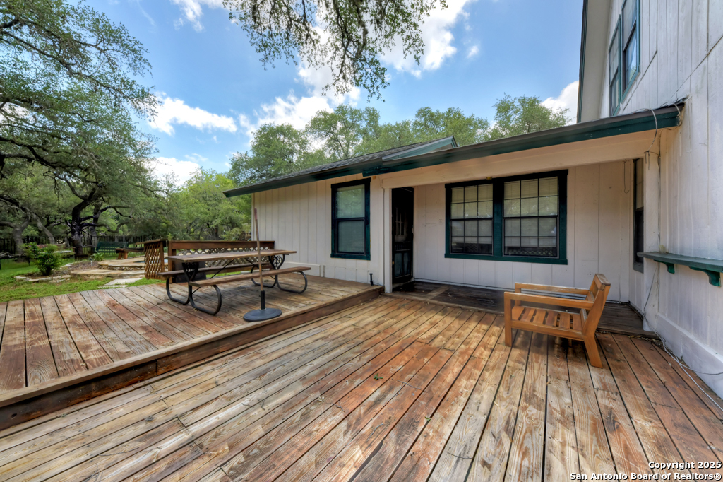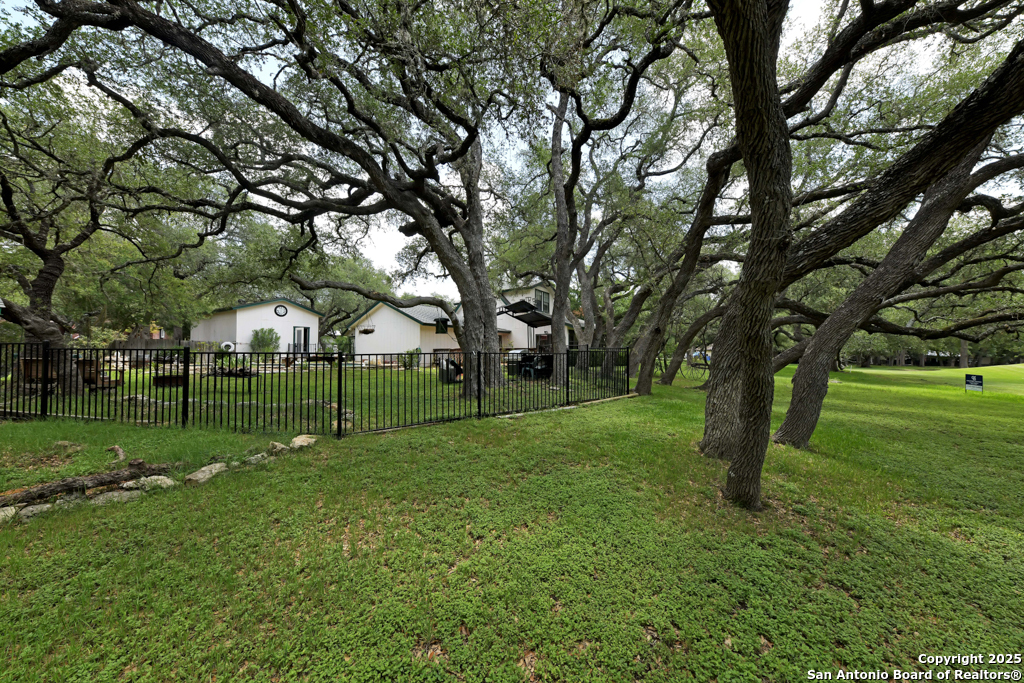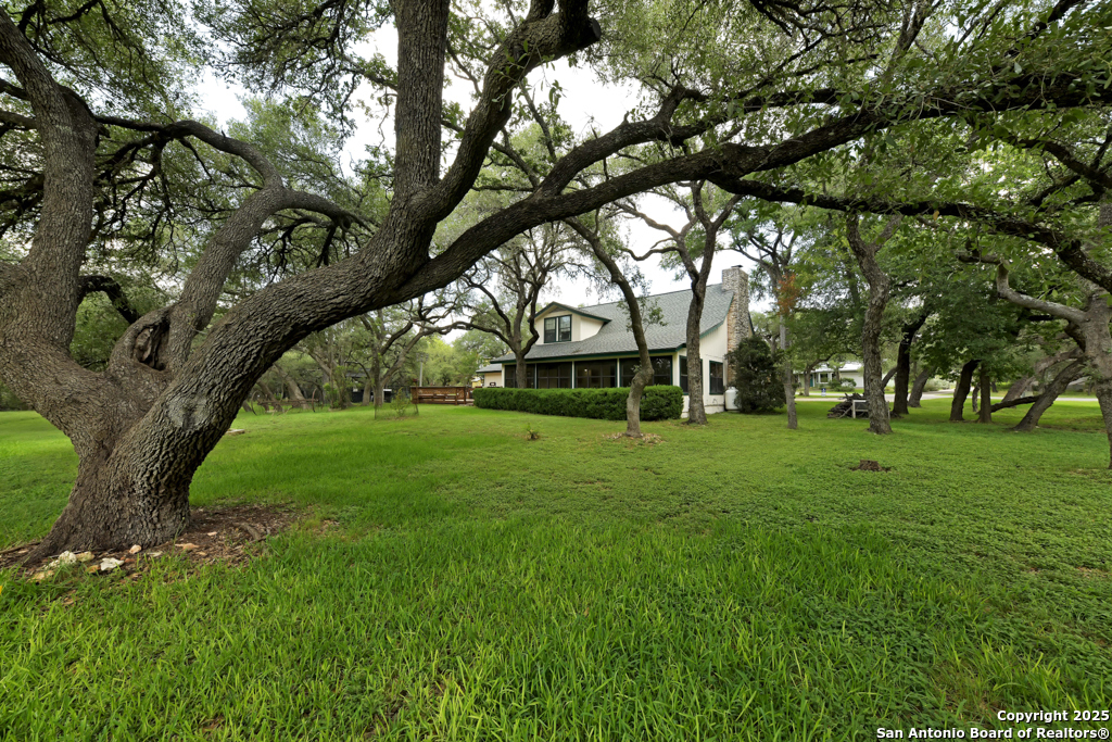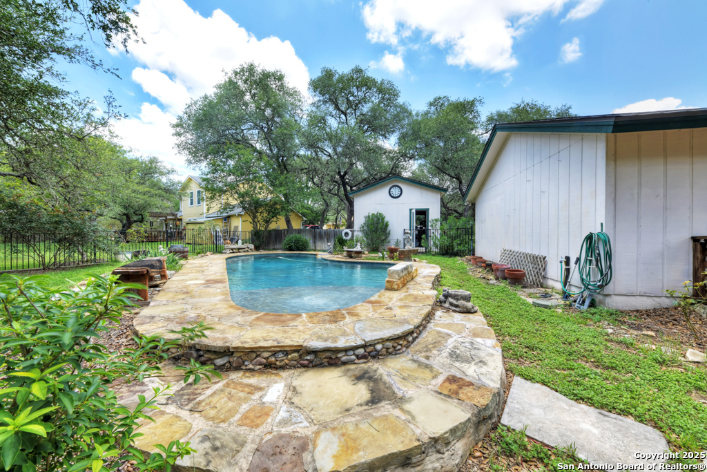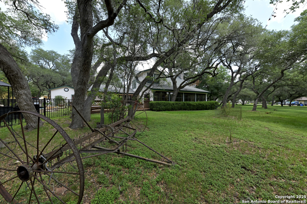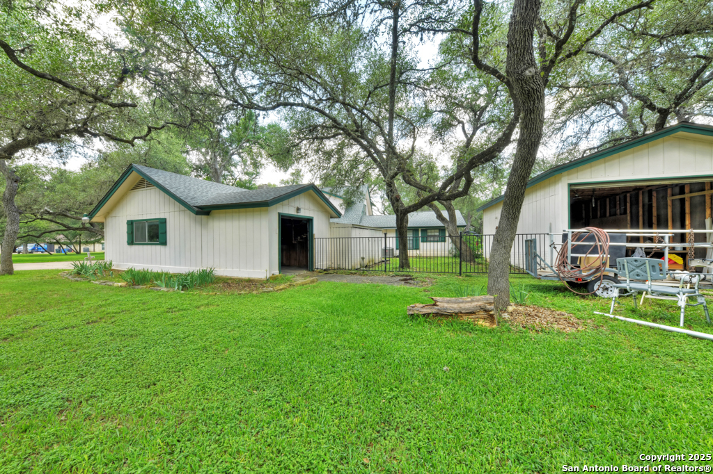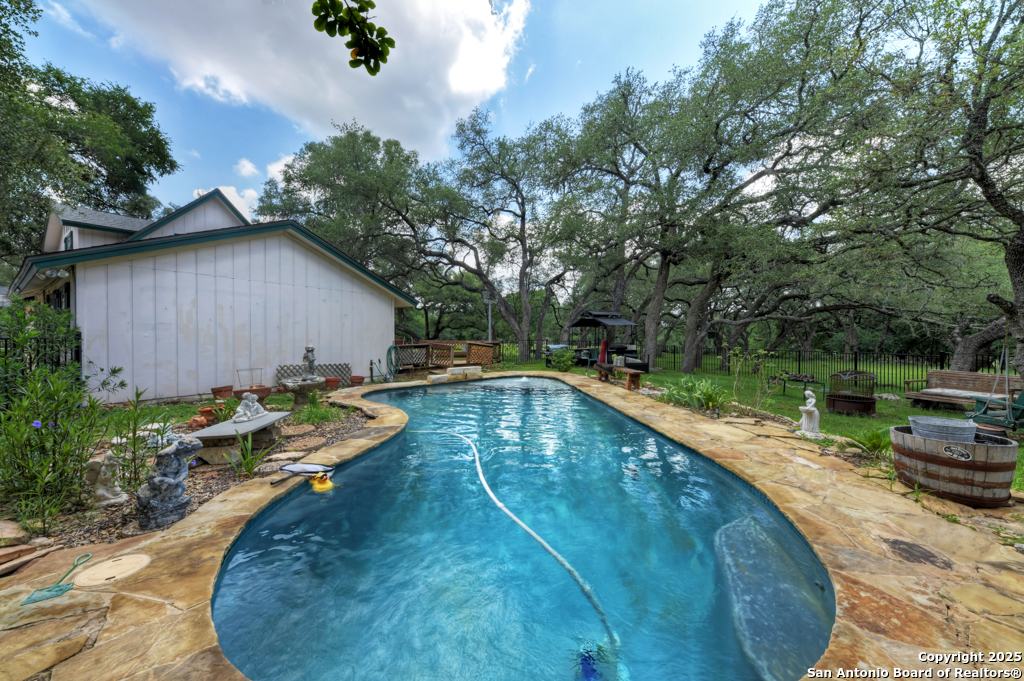 Nestled on a generous double lot totaling 0.48 acres, this unique property offers stunning golf course frontage along the 17th hole of the Double J Ranch Golf Club in scenic Wimberley, Texas. Originally built in 1979 by builder Ray Pingray, the home features an open-concept living space that highlights a striking stone fireplace, a sunroom with kitchenette and an inviting outdoor patio overlooking an in-ground pool added in 2016. The open loft is the 3rd bedroom with bath facilities, closet and windows. The primary suite offers a walk-in closet, a Hydro Dimensions walk-in tub, and a separate shower. The kitchen comes fully equipped, with the refrigerator, stove and dishwasher all conveying. Major systems have been thoughtfully updated, including HVAC (2019), hot water heater (2021), and roof (2025). A detached two-car garage 420 sqft includes attic storage and a workshop area, with a rear golf cart garage and roll-up door for added convenience. The double garage has 744 sqft w/garage door and keyed exterior door w/fenced 30x20 ft side yard houses the pool equipment, including a two-speed pump. This one-of-a-kind home offers character, functionality, and an unbeatable location for golf lovers.