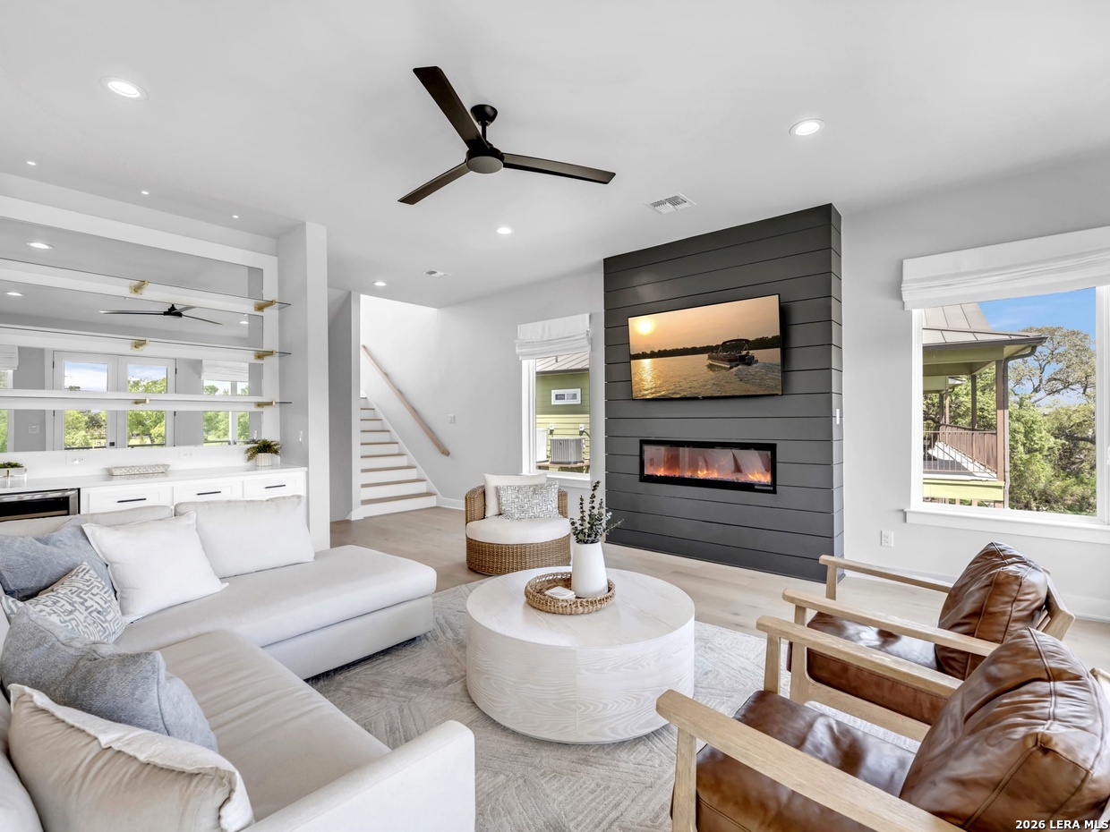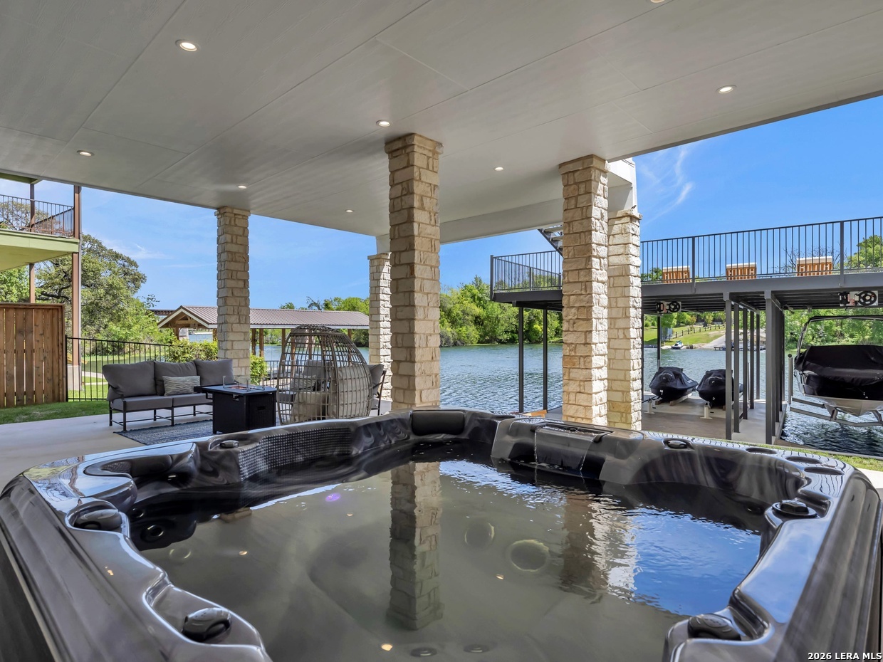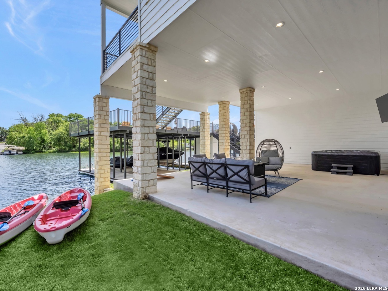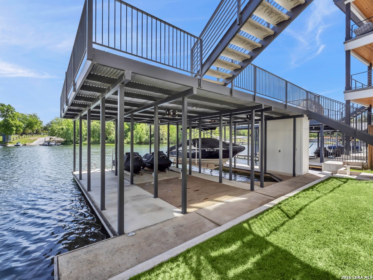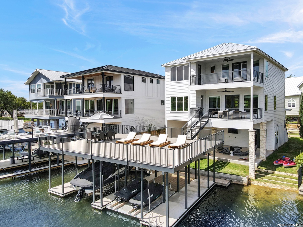 Welcome to 1601 Glen Cove in Kingsland, Texas-an exceptional, like-new modern waterfront retreat tucked away in a quiet cove along the Colorado River. Custom designed and thoughtfully built for this rare homesite, this stunning property offers the perfect blend of luxury, comfort, and the ultimate lake lifestyle. Featuring 4 bedrooms and 4.5 bathrooms, two primary suites-both with unparalleled lake views, the home showcases elegant finishes and stylish decor throughout. Luxury vinyl plank flooring flows seamlessly through the main living areas and bedrooms, while beautifully appointed bathrooms feature sleek ceramic tile. Expansive windows frame breathtaking water views from the kitchen, family room, and multiple bedrooms, creating a bright and serene atmosphere. The heart of the home is a designer kitchen equipped with a spacious quartz island, stainless steel appliances, built-in oven, smooth cooktop, farmhouse sink, and a dedicated wine fridge with additional custom cabinetry and modern glass shelving-perfect for entertaining. The primary suite is a true sanctuary, offering stunning lake views and a spa-inspired bathroom complete with dual quartz vanities, marble flooring, a luxurious marble shower, and elegant gold hardware. A second primary suite located upstairs provides added privacy and features its own covered patio overlooking the water, along with a beautifully designed ensuite bath with double vanities and a walk-in glass and tile shower. Outdoor living is simply unmatched. Enjoy two covered patios overlooking the water, plus a massive elevated concrete deck large enough to host 20+ guests-ideal for sunbathing, grilling, and entertaining. A custom staircase connects the covered patio to the expansive upper deck, creating seamless indoor-outdoor flow. The ground-level covered area offers direct lake access and includes a hot tub, lounge space, and ample room for shaded dining. The private boat dock is fully equipped with a boat slip, lift, and jet ski parking, making it effortless to enjoy boating, kayaking, and all things lake life. Additional highlights include a finished garage currently set up as a recreational lounge with epoxy flooring, ping pong, and TV space-perfect for relaxing after a day on the water. Currently utilized as a second home and successful short-term rental, this property has demonstrated strong income potential, with weekend rates reaching approximately $1,000 per night. Every detail of this home was carefully curated to maximize views, comfort, and the waterfront lifestyle. Whether you're seeking a private escape, full-time residence, or investment opportunity, 1601 Glen Cove is a rare find you won't want to miss. Shown by appointment only.