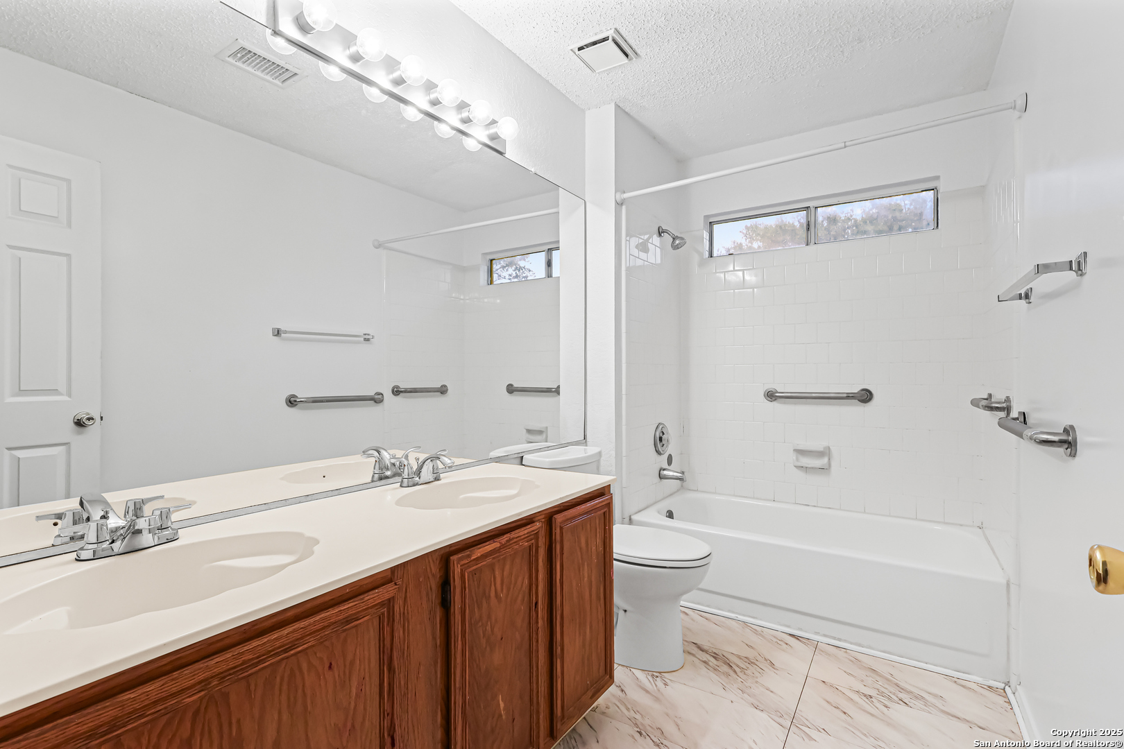 **OPEN HOUSE 12/21/25 1pm-4pm **Discover this spacious 5-bedroom, 2.5-bath home located in the highly sought-after Westcreek community of San Antonio. This inviting residence offers a perfect blend of comfort, functionality, and family-friendly living. The first floor features designer-stained concrete floors that provide both style and durability. Entertain in the formal dining room, or enjoy casual meals in the kitchen's breakfast nook. The kitchen also boasts a breakfast bar, gas stove, and ample cabinet space, making it ideal for cooking and gathering. The living room includes a gas fireplace, offering a cozy centerpiece for relaxing evenings or entertaining guests. The primary bedroom, conveniently located downstairs, includes a ceiling fan and walk-in closet. The primary bathroom is equipped with dual sinks, a separate shower, and a garden tub, providing a private retreat. Upstairs, a large game room offers plenty of space for family activities, and four additional bedrooms share a full bath, perfect for kids, guests, or a home office. Step outside to enjoy the fenced yard with mature trees, providing privacy and outdoor space for recreation or relaxation. Additional features include a two-car garage with opener and a water softener, adding convenience and functionality. Westcreek residents enjoy an array of HOA amenities, including two pools, a clubhouse, jogging trails, children's playgrounds, and sports courts for tennis and basketball, as well as a soccer field and baseball field. These amenities foster an active, community-oriented lifestyle for families of all ages. The location is ideal for commuters and families alike, with close proximity to Lackland AFB, excellent dining, shopping, and entertainment options. Major employers nearby include Citibank, Microsoft, Wells Fargo, and Chase, while top medical facilities such as Christus Santa Rosa and Baptist Hospital are easily accessible. This home combines thoughtful design, functional living spaces, and a prime location in one of San Antonio's most desirable neighborhoods. Whether you're entertaining, working from home, or enjoying time outdoors, 1602 Kingsbridge provides a comfortable and convenient lifestyle for every stage of life.