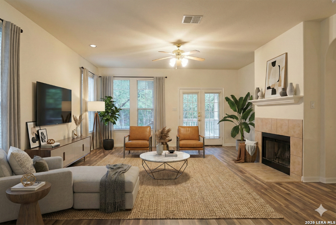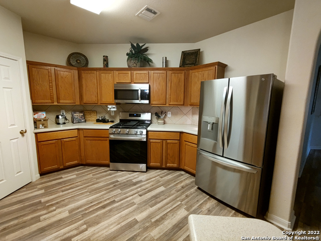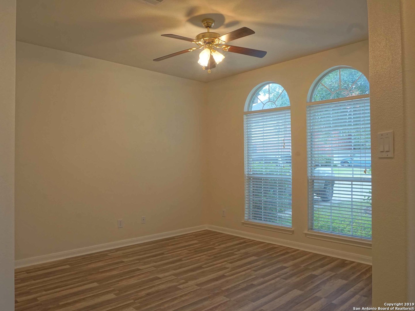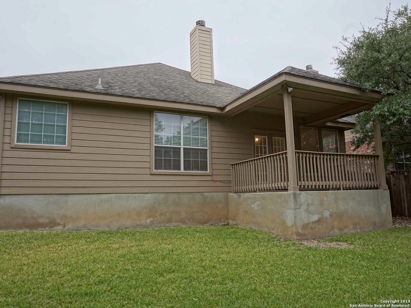 SINGLE STORY HOME that backs to a GREENBELT for extra privacy and peaceful views from the COVERED PATIO. Laminate flooring! Lots of natural lighting in this open, flexible floor plan. Living Room could be a study or home office. Split bedroom arrangement. OUTSTANDING LOCATION with easy access to 281 and a short drive to 1604. Community has access to pool, clubhouse, basketball court, jogging trails, and more. Close to Canyon Springs Golf Course.