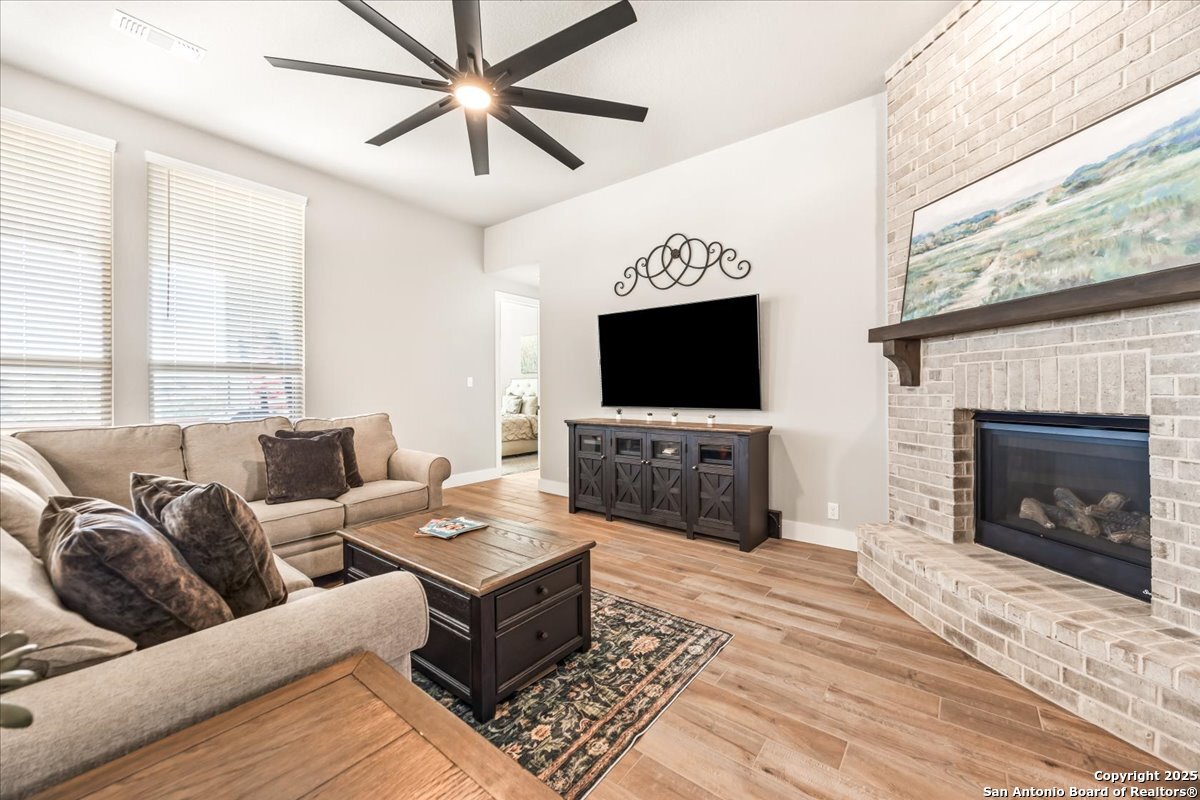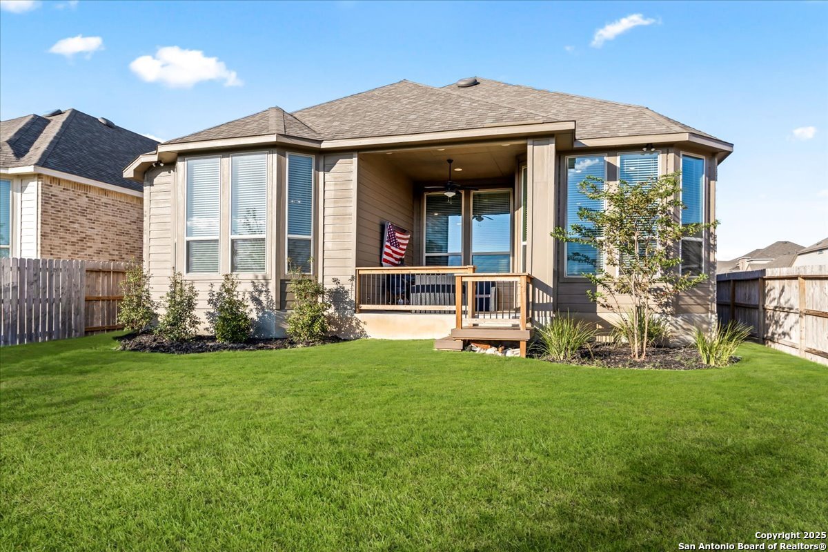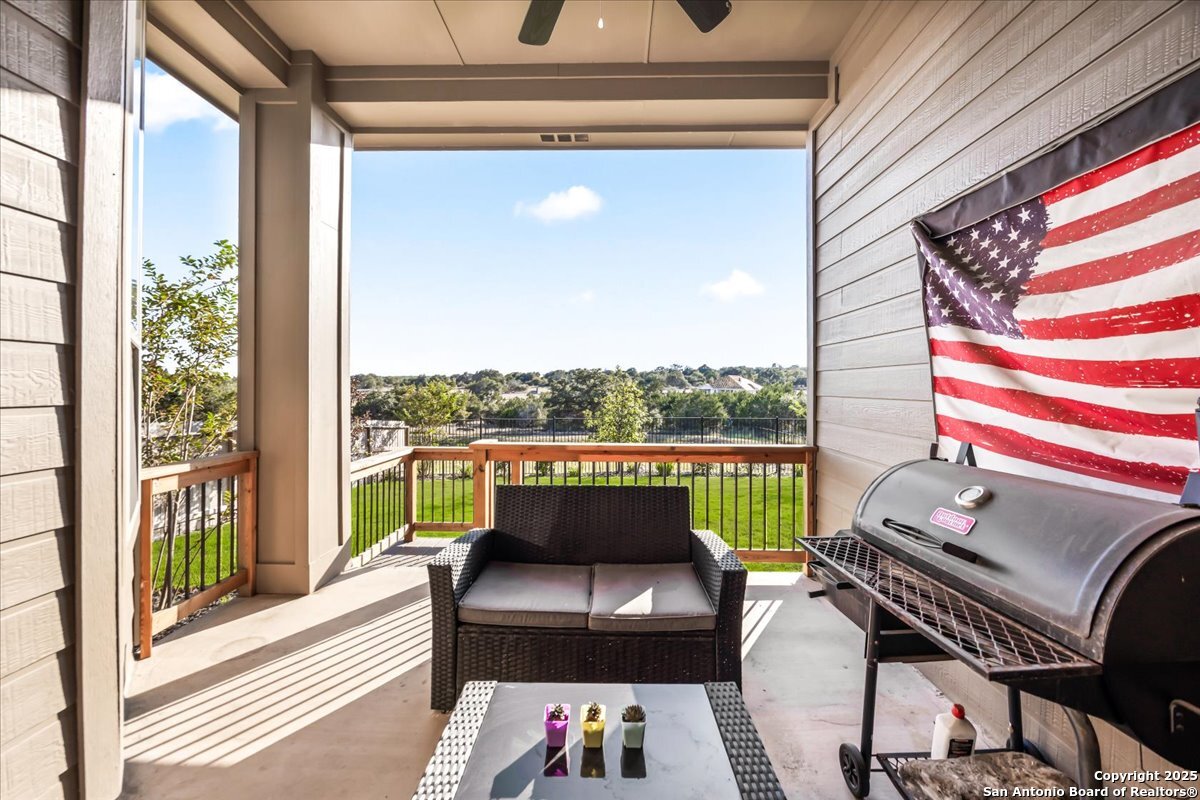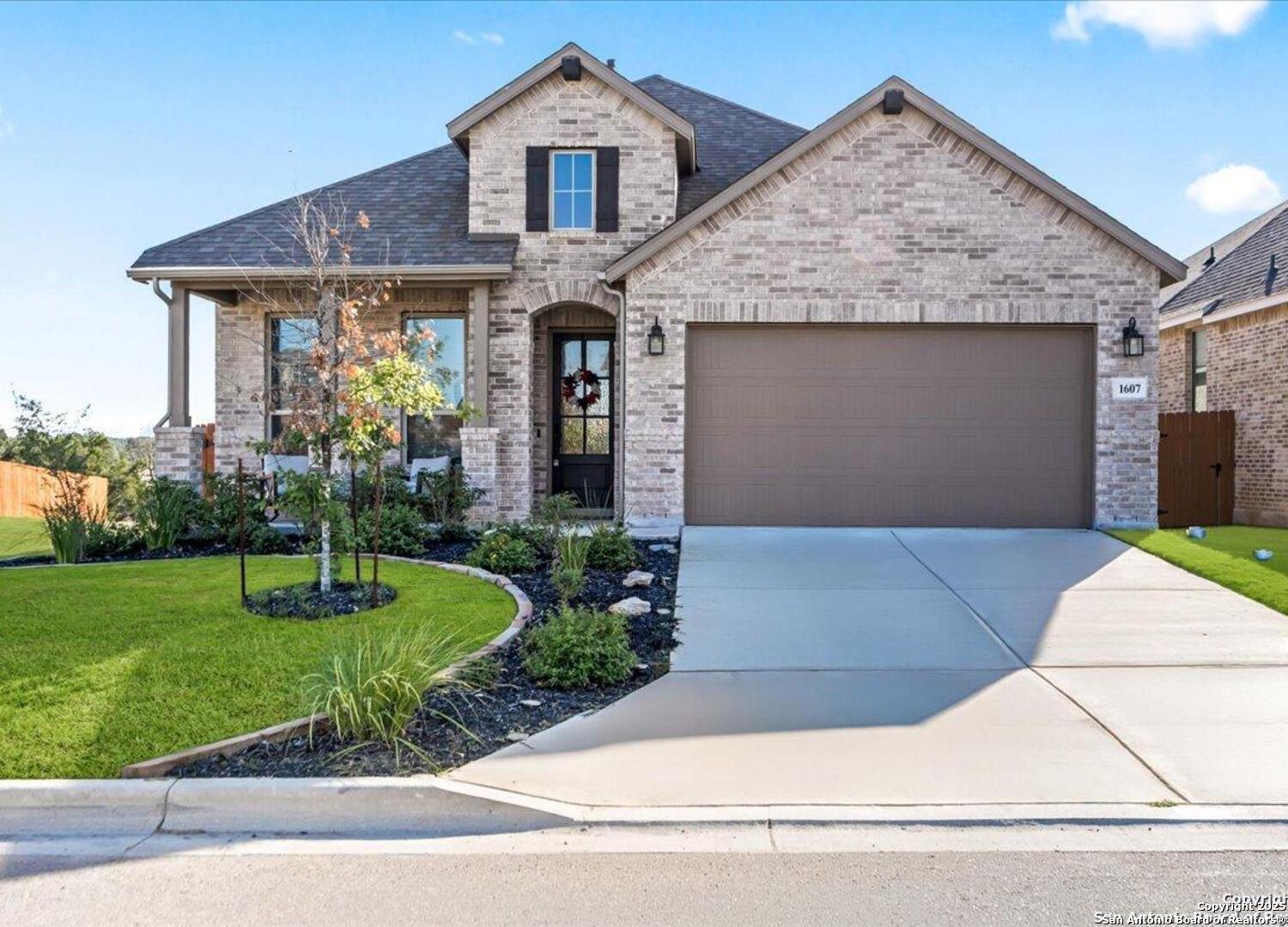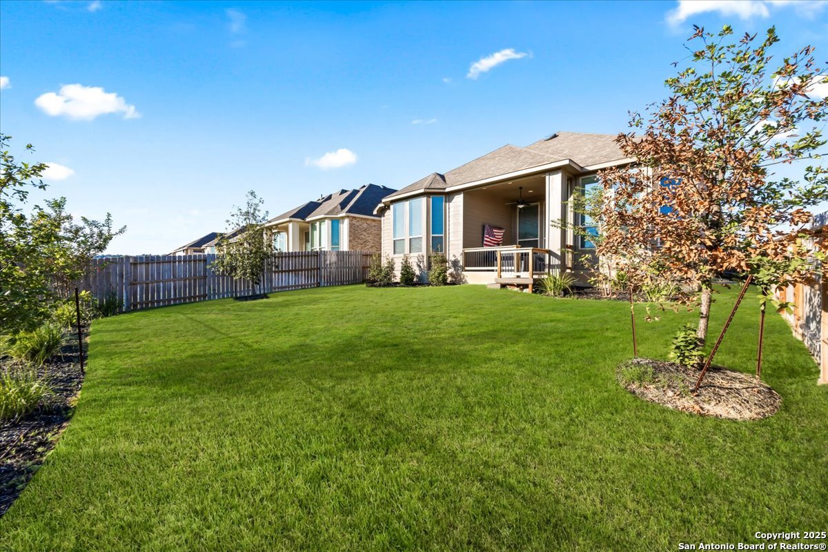 Like-new one-story Highland Home featuring 4 bedrooms and 3 full baths, offering remarkable privacy and elegant upgrades throughout. This immaculate residence backs to open Hill Country views and sits beside an HOA lot that will never be built on, creating a rare sense of seclusion. Inside, enjoy a beautifully upgraded kitchen, a cozy gas fireplace, and an enlarged primary shower and closet designed for ultimate comfort. The private backyard is perfect for relaxing or entertaining. Nestled in the desirable Meyer Ranch community, residents enjoy scenic walking trails, resort-style pools, and glowing community fire pits.