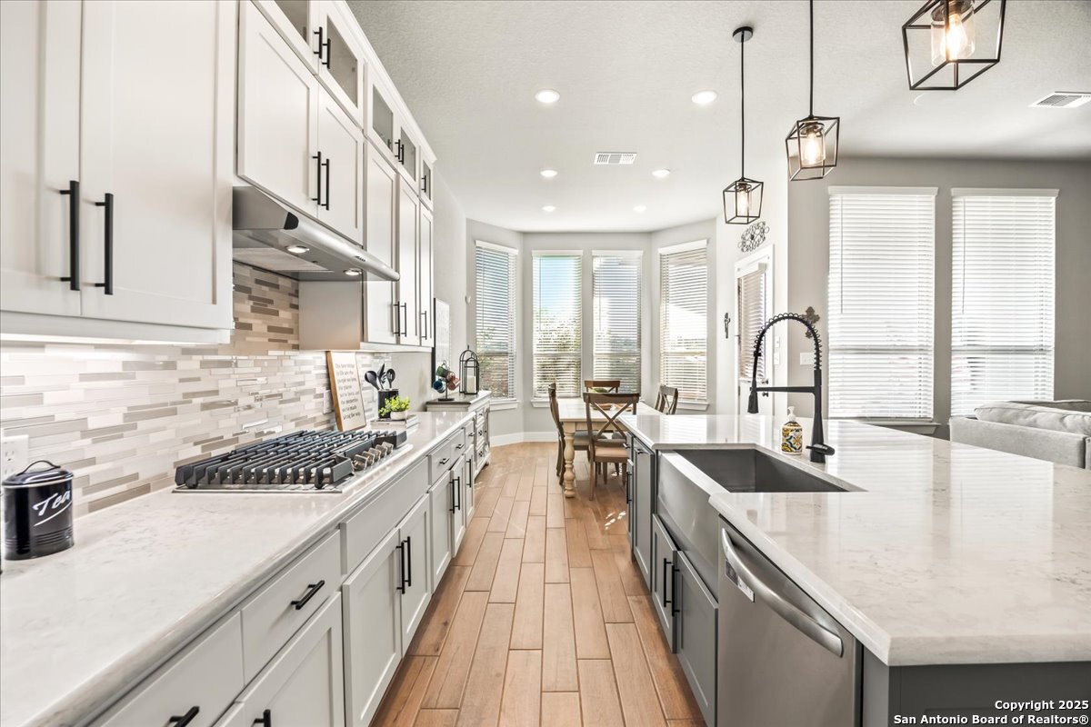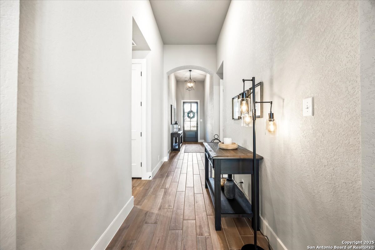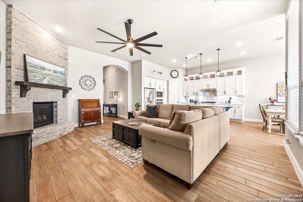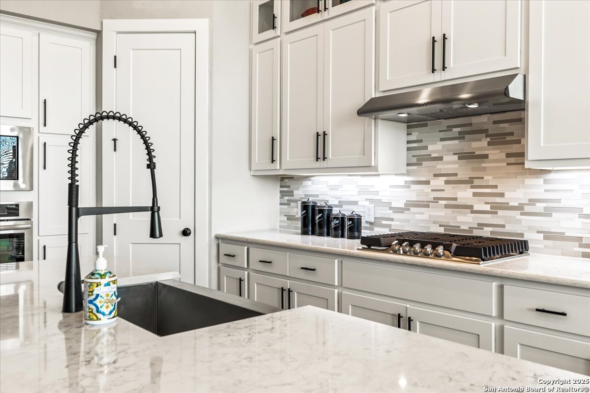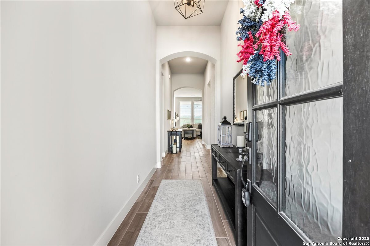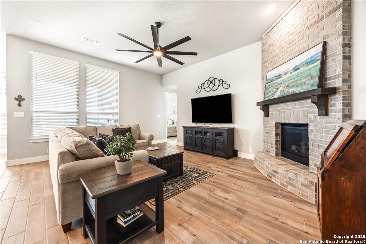 Like-new one-story Highland Home featuring 4 bedrooms and 3 full baths, offering remarkable privacy and elegant upgrades throughout. This immaculate residence backs to open Hill Country views and sits beside an HOA lot that will never be built on, creating a rare sense of seclusion. Inside, enjoy a beautifully upgraded kitchen, a cozy gas fireplace, and an enlarged primary shower and closet designed for ultimate comfort. The private backyard is perfect for relaxing or entertaining. Nestled in the desirable Meyer Ranch community, residents enjoy scenic walking trails, resort-style pools, and glowing community fire pits.