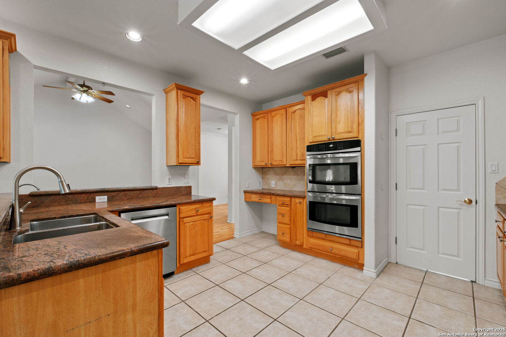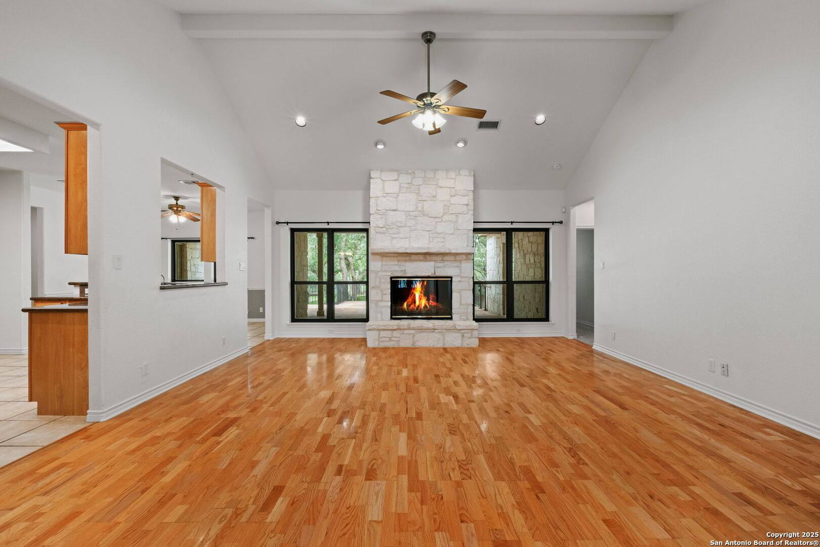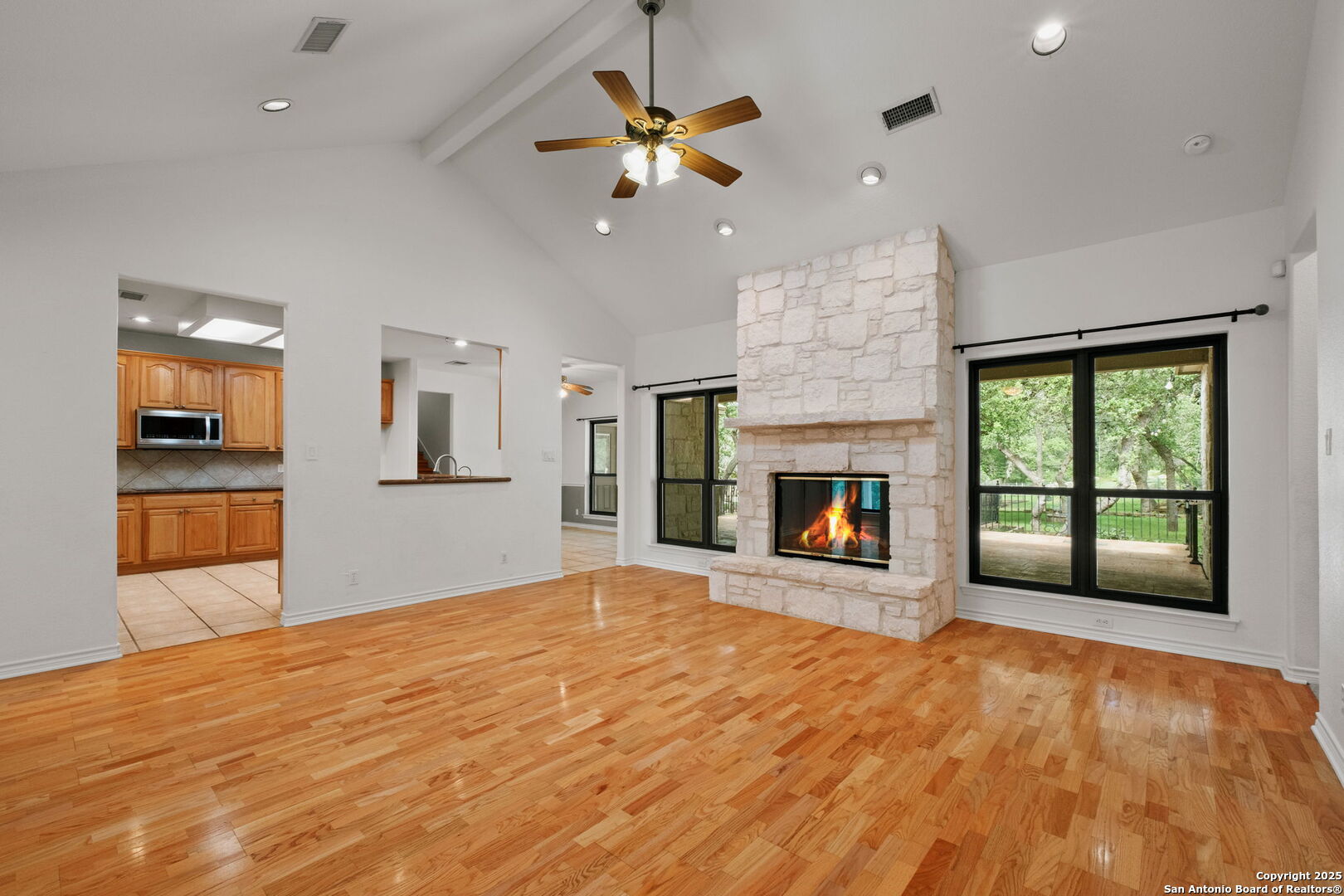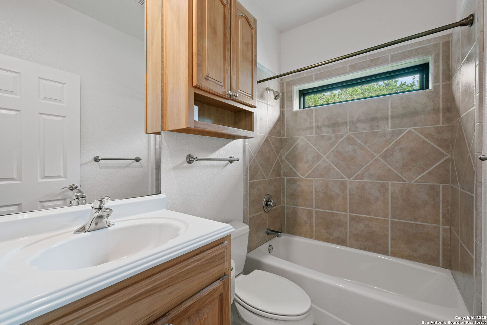 Welcome to 16134 San Cayetano, an exceptional retreat tucked away in the gated community of Retablo Ranch in Helotes, Texas. This meticulously maintained property offers the perfect blend of updated comfort, privacy, and Hill Country charm, all set on a picturesque 3.68-acre lot that backs directly to the breathtaking Government Canyon State Natural Area. Beyond the neighborhood's secure entrance, the property features its own private automatic gate, adding an extra layer of privacy and convenience. The residence has been thoughtfully enhanced with newly installed windows, a recently replaced well pump, and an updated septic system. The home also benefits from three central AC/Heat pump systems and two recently replaced 40 and 50-gallon electric water heaters, ensuring year-round comfort and efficiency. Inside, the home showcases a beautiful open kitchen designed for both daily living and entertaining. Granite countertops complement the sleek stainless steel appliances, which include a double oven and an induction cooktop, perfect for the inspired home chef. The kitchen flows effortlessly into the spacious living and dining areas, creating a warm, inviting space for gatherings. The master suite serves as a luxurious private retreat, complete with a dual sink vanity, large walk-in shower, Jacuzzi tub, and his and hers walk-in closets. Two secondary bedrooms share a generously sized bathroom with dual vanities and a shower-tub combo, while the expansive fourth bedroom includes its own private full bath and walk-in closet, making it ideal for guests or multi-generational living. Above the garage, a large bonus room with rich hardwood floors, a private bathroom with shower, and a balcony offers flexibility for a game room, studio, or home office. Outdoor living shines with a spacious raised stamped and stained concrete back porch, complete with wrought iron railing, perfect for outdoor cooking and entertaining. The 25x30 back deck offers additional space for gatherings or quiet evenings enjoying the Texas sunsets. The oversized two-car garage includes a storage closet, workbench, and dedicated work area for hobbies or projects. A standout feature of the property is the impressive 1,800 square foot detached shop, garage, entertainment space, or potential mother-in-law suite. Complete with its own central AC/Heat and hot water heater, this versatile structure offers endless possibilities and could easily be converted into a secondary home, guest quarters, or private studio. Additional conveniences include a water softener located in the well house and a reverse osmosis system at the kitchen sink. Located within the highly acclaimed Northside Independent School District, this exceptional property offers the best of country living with the convenience of nearby shopping, dining, and schools. Discover your private escape at 16134 San Cayetano, where thoughtful updates, flexible living spaces, and natural beauty come together.