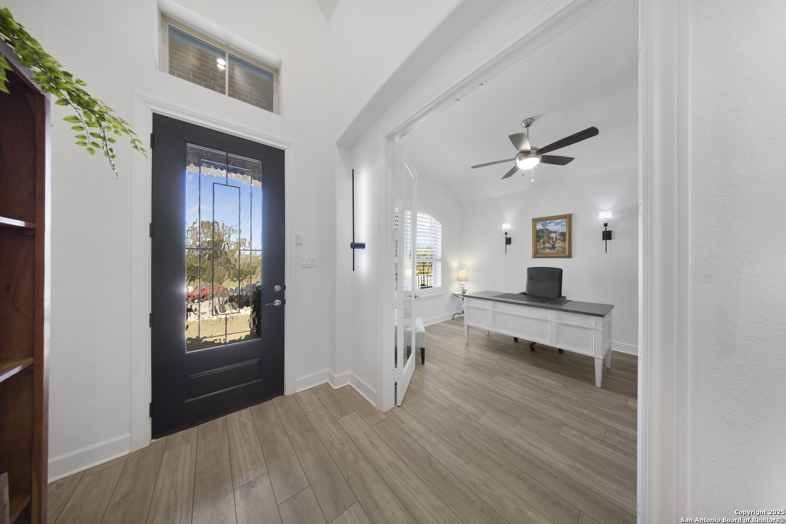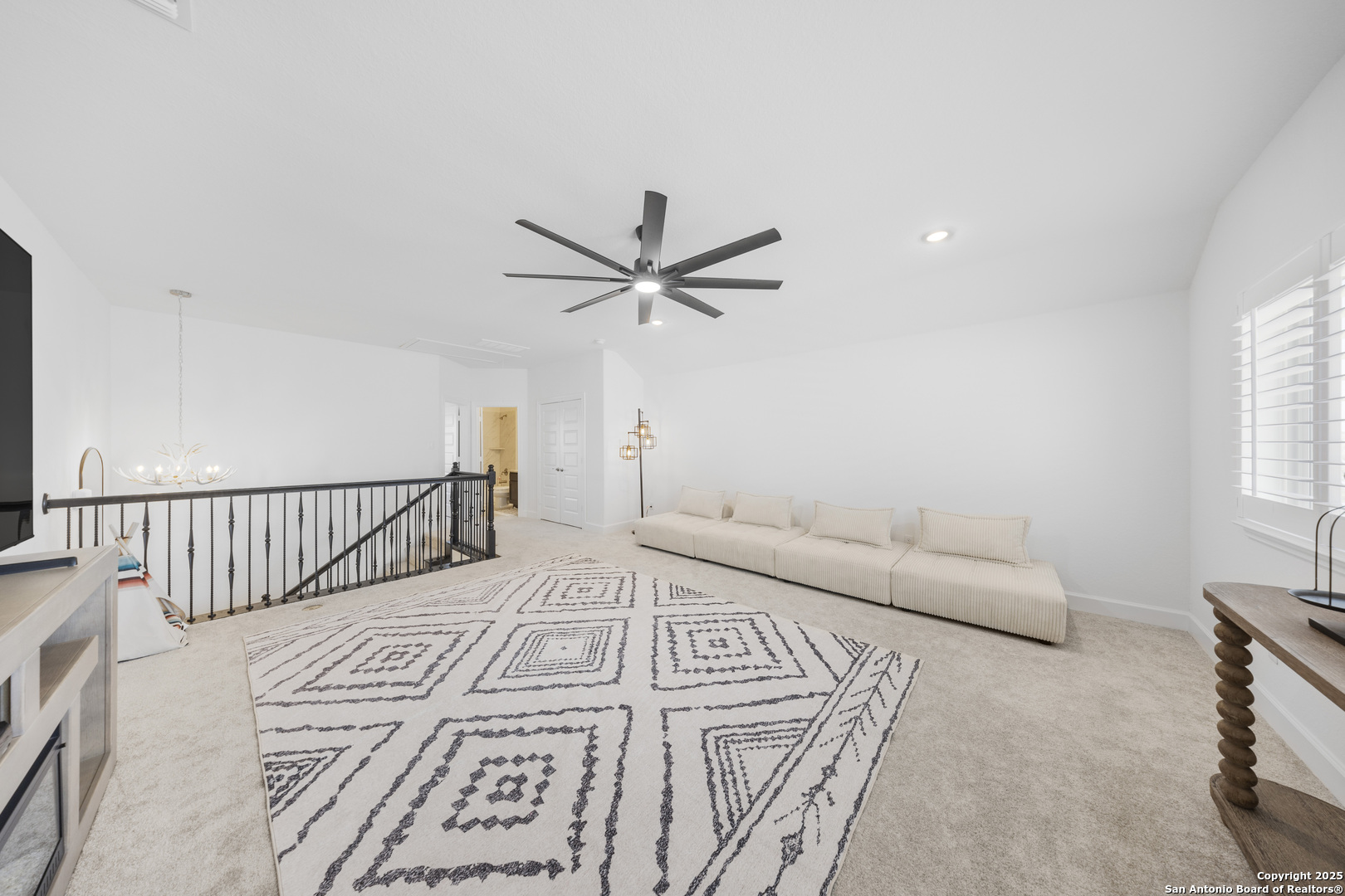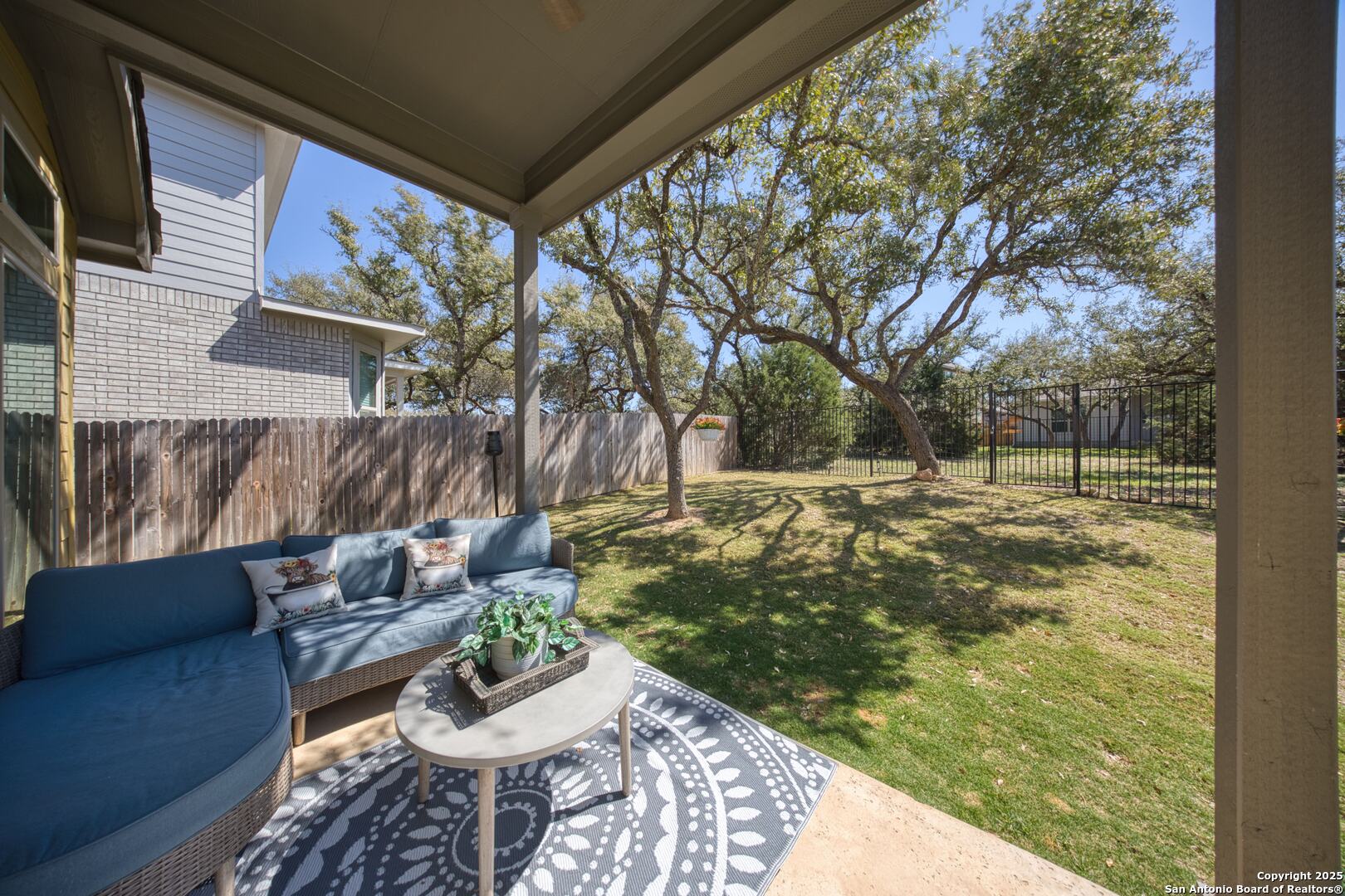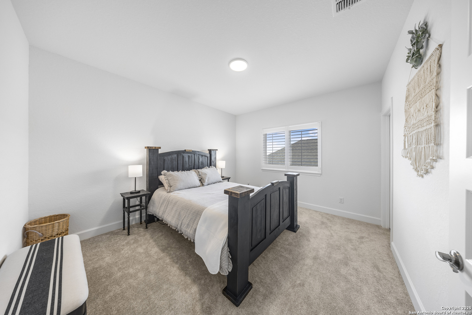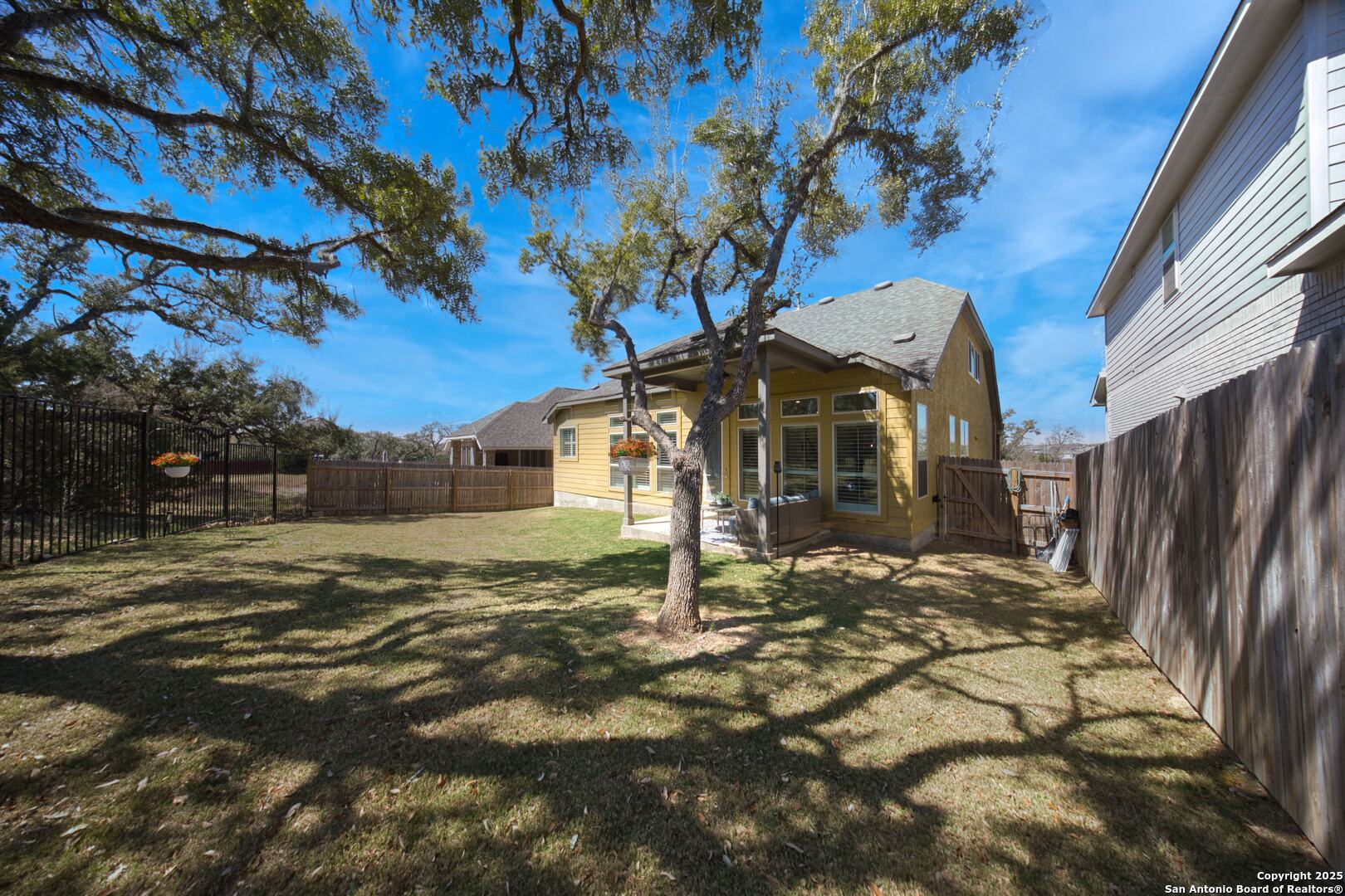 PRICED BELOW MARKET VALUE! This stunning home is move-in ready! Barely two years old and like new, this residence offers a modern touch with an open floor plan, four spacious bedrooms, three bathrooms, high-end finishes, high ceilings, luxury vinyl plank flooring, and builder upgrades. The home features elegant plantation shutters that enhance the windows, allowing for both natural light and privacy. The spacious two-car garage includes high ceilings and an installed garage door screen for added convenience that is unique. Downstairs, you'll find a private study/office with double French doors, a gorgeous kitchen with espresso cabinets, a large island, white Vicostone quartz countertops, and an elegant backsplash. Notably three bedrooms and two full bathrooms on this level. Upstairs, a spacious media room/loft, along with a fourth bedroom and a full bathroom, creates a perfect space for guests or a private retreat. The luxurious primary suite boasts a mudset shower and a freestanding tub, providing a spa-like experience at home. Outside, a covered patio offers an ideal spot for relaxation or entertaining. Located in a fantastic community with a pool and recreation center, this home is conveniently close to Boerne, New Braunfels, and San Antonio, with easy access to shopping, dining, golf courses, and highly desired Comal ISD schools. Come view this property and step into your dream lifestyle with this one-of-a-kind home. Now's your chance to make it yours!