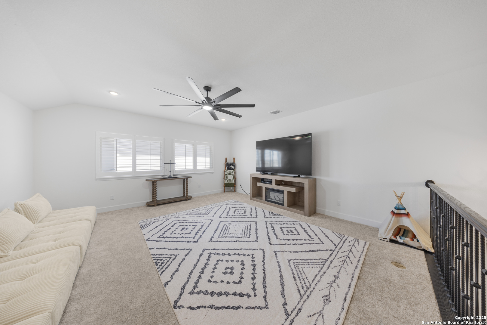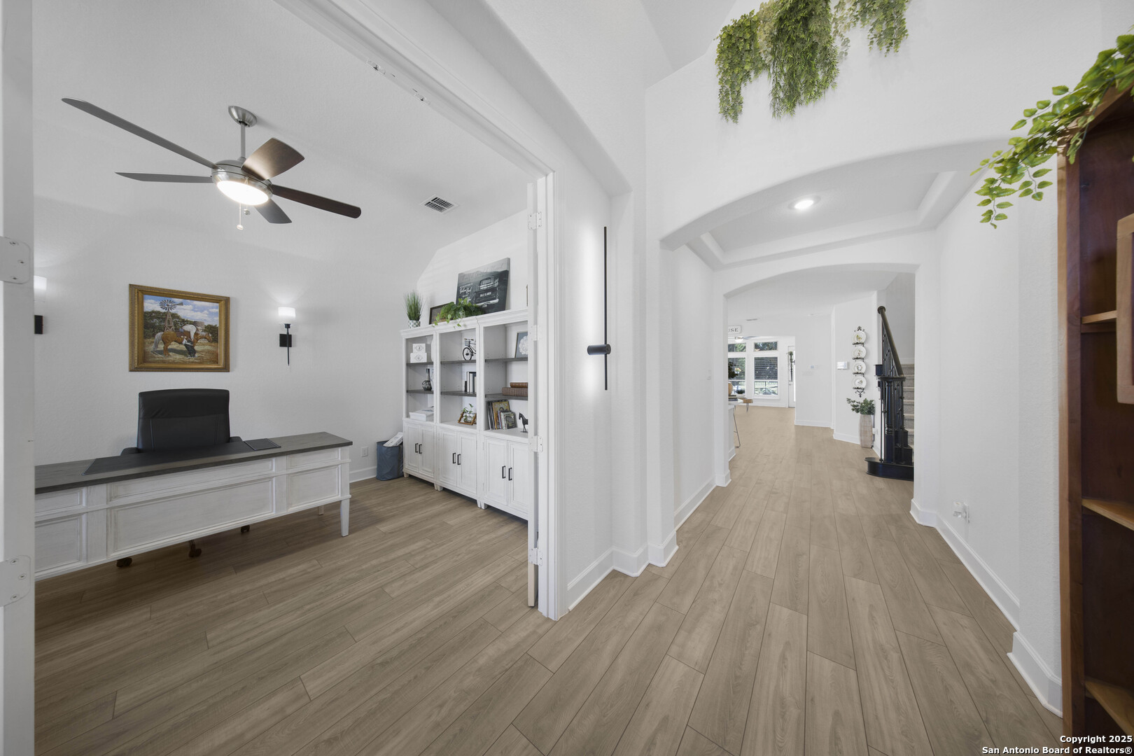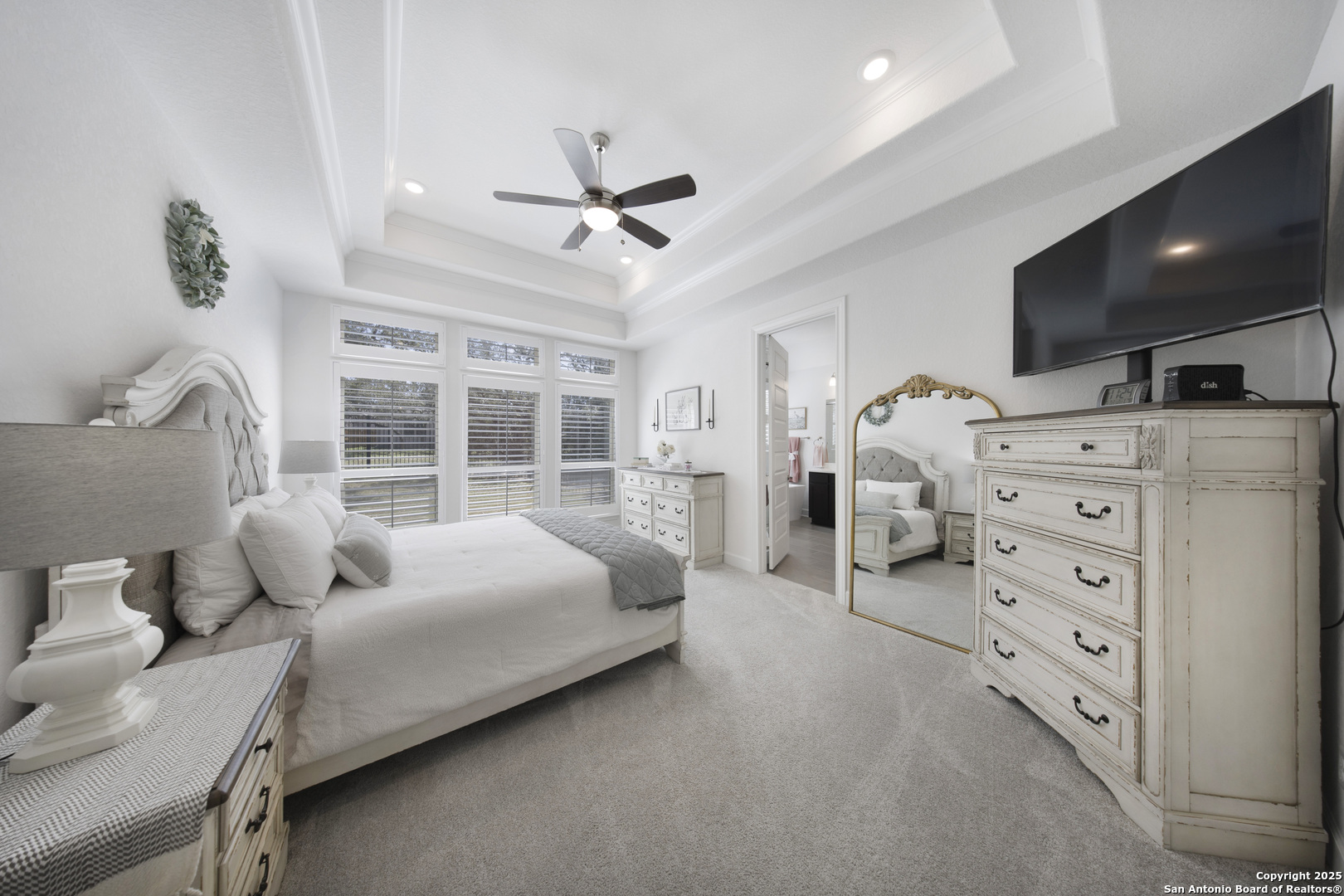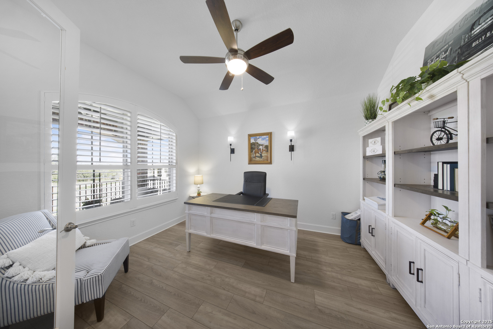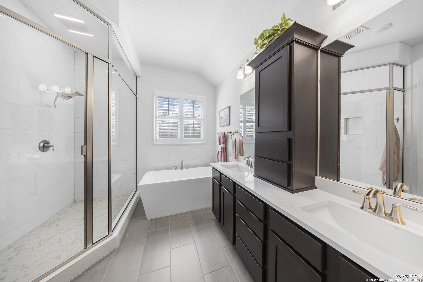 PRICED BELOW MARKET VALUE! This stunning home is move-in ready! Barely two years old and like new, this residence offers a modern touch with an open floor plan, four spacious bedrooms, three bathrooms, high-end finishes, high ceilings, luxury vinyl plank flooring, and builder upgrades. The home features elegant plantation shutters that enhance the windows, allowing for both natural light and privacy. The spacious two-car garage includes high ceilings and an installed garage door screen for added convenience that is unique. Downstairs, you'll find a private study/office with double French doors, a gorgeous kitchen with espresso cabinets, a large island, white Vicostone quartz countertops, and an elegant backsplash. Notably three bedrooms and two full bathrooms on this level. Upstairs, a spacious media room/loft, along with a fourth bedroom and a full bathroom, creates a perfect space for guests or a private retreat. The luxurious primary suite boasts a mudset shower and a freestanding tub, providing a spa-like experience at home. Outside, a covered patio offers an ideal spot for relaxation or entertaining. Located in a fantastic community with a pool and recreation center, this home is conveniently close to Boerne, New Braunfels, and San Antonio, with easy access to shopping, dining, golf courses, and highly desired Comal ISD schools. Come view this property and step into your dream lifestyle with this one-of-a-kind home. Now's your chance to make it yours!