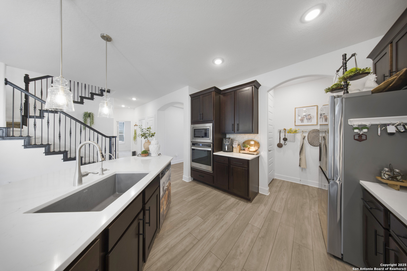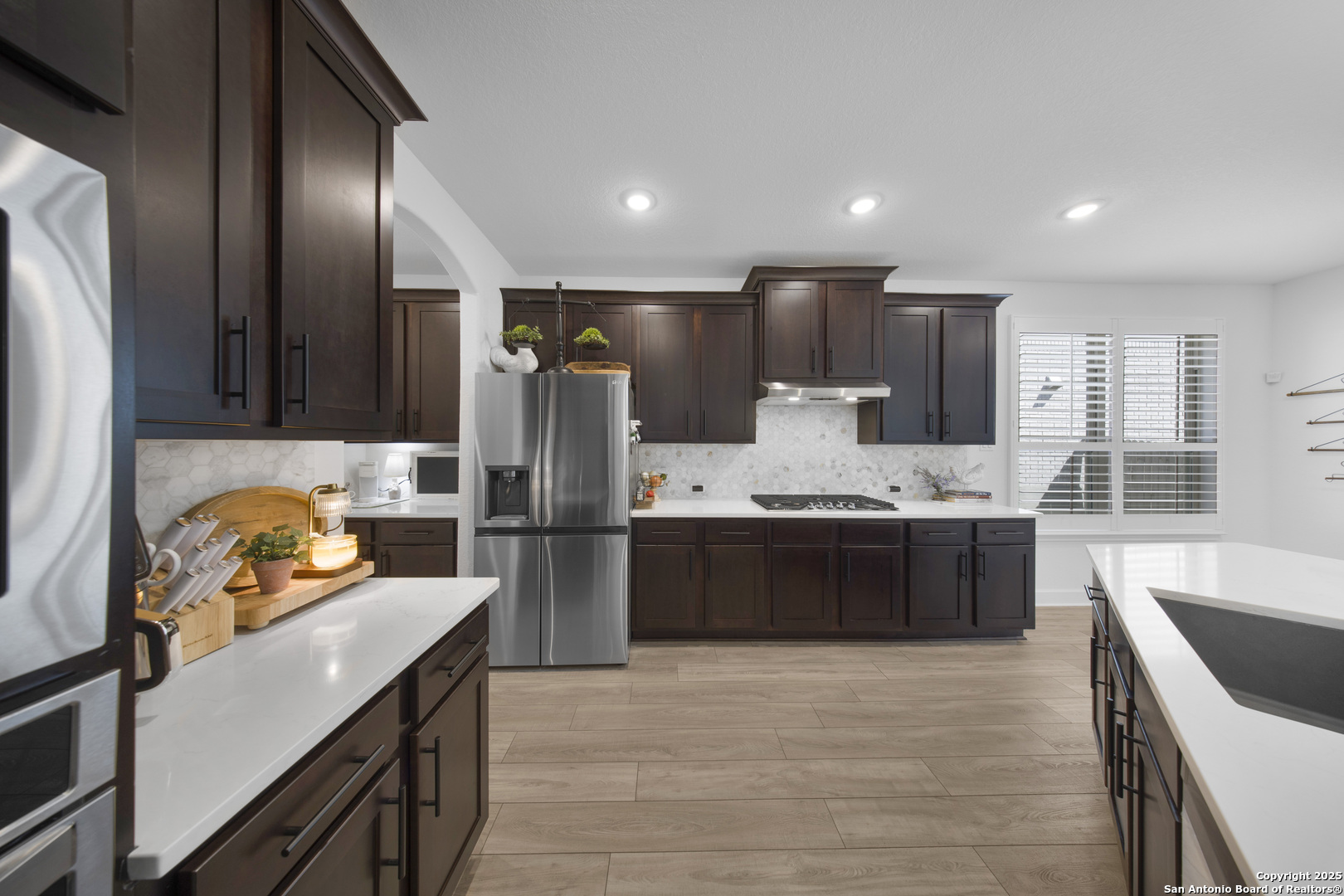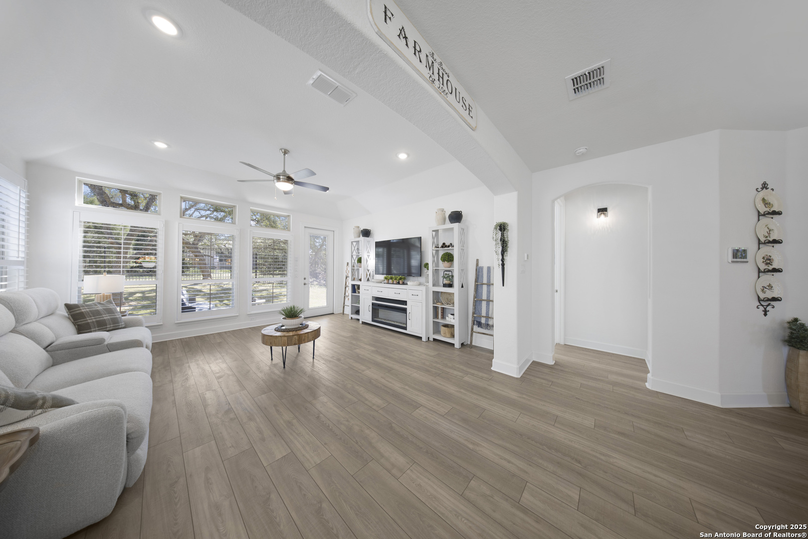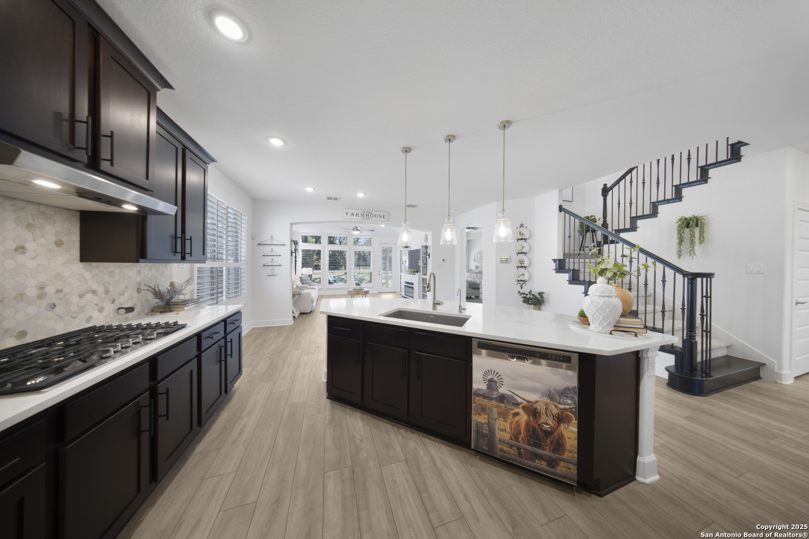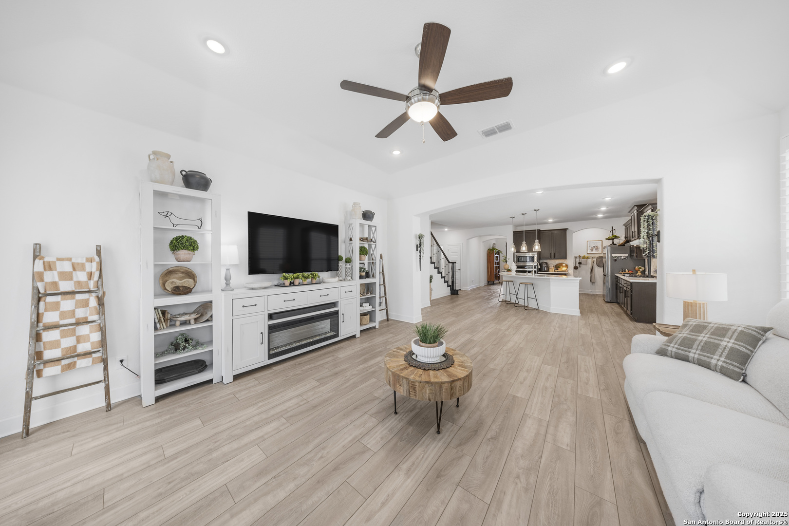 PRICED BELOW MARKET VALUE! This stunning home is move-in ready! Barely two years old and like new, this residence offers a modern touch with an open floor plan, four spacious bedrooms, three bathrooms, high-end finishes, high ceilings, luxury vinyl plank flooring, and builder upgrades. The home features elegant plantation shutters that enhance the windows, allowing for both natural light and privacy. The spacious two-car garage includes high ceilings and an installed garage door screen for added convenience that is unique. Downstairs, you'll find a private study/office with double French doors, a gorgeous kitchen with espresso cabinets, a large island, white Vicostone quartz countertops, and an elegant backsplash. Notably three bedrooms and two full bathrooms on this level. Upstairs, a spacious media room/loft, along with a fourth bedroom and a full bathroom, creates a perfect space for guests or a private retreat. The luxurious primary suite boasts a mudset shower and a freestanding tub, providing a spa-like experience at home. Outside, a covered patio offers an ideal spot for relaxation or entertaining. Located in a fantastic community with a pool and recreation center, this home is conveniently close to Boerne, New Braunfels, and San Antonio, with easy access to shopping, dining, golf courses, and highly desired Comal ISD schools. Come view this property and step into your dream lifestyle with this one-of-a-kind home. Now's your chance to make it yours!