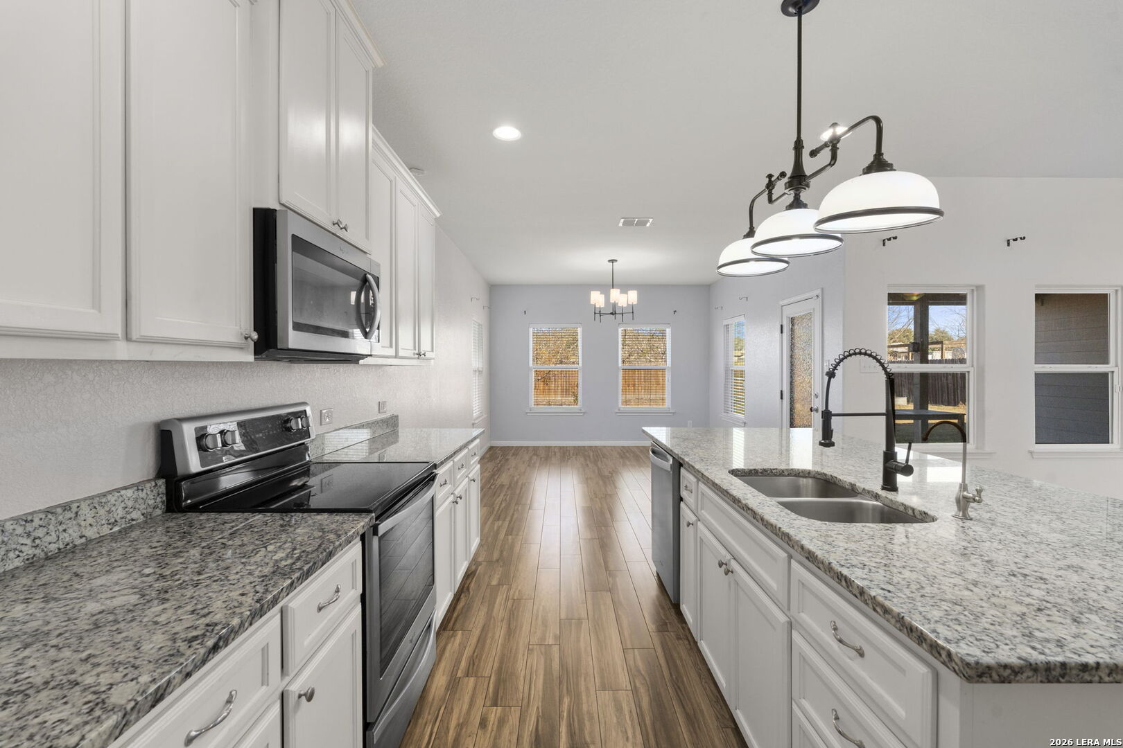 Discover the comfort and space you've been looking for at 162 Lost Maples Way, a beautifully designed 1,974 sq ft single story home in the Marion Park community, located within a few miles from Randolph AFB Set on a spacious 0.19-acre lot with no HOA, this home offers a peaceful, small-town feel while remaining just minutes from I-35, I-10. Inside, the open concept layout creates a bright and welcoming atmosphere, featuring 3 bedrooms and 2 full bathrooms with high ceilings and durable wood look tile flooring throughout the main living areas and wet spaces. Plush carpeting in the bedrooms and closets adds warmth and comfort where it matters most. The kitchen is designed for both everyday living and entertaining, complete with an oversized island, white cabinetry, granite countertops, a walk in pantry, and a generously sized dining area. The private primary suite serves as a retreat, offering double walk in closets, dual vanities, a relaxing garden tub, and a full tile walk in shower. Each secondary bedroom is thoughtfully sized and includes its own closet, providing ample storage throughout the home. Additional features include an attached 2-car garage, an in-ground sprinkler system, and access to high-speed fiber internet. With modern finishes, an open floor plan, and the freedom of no HOA and Marion ISD, this home delivers affordable luxury in a location that's hard to beat.