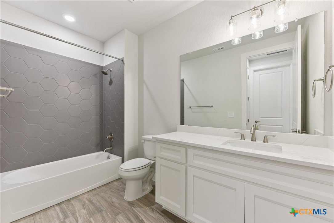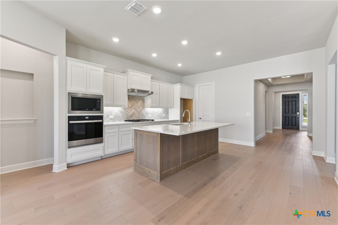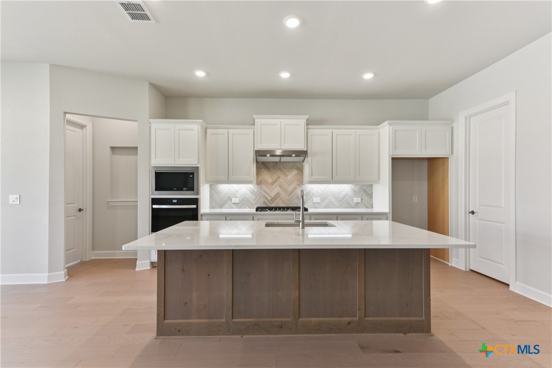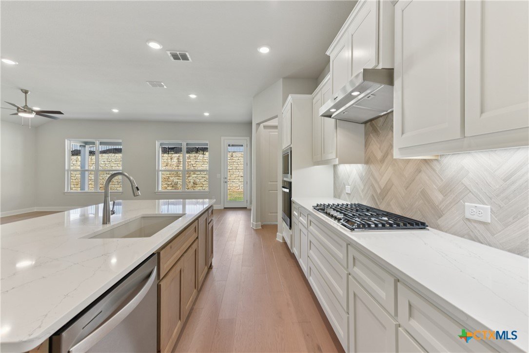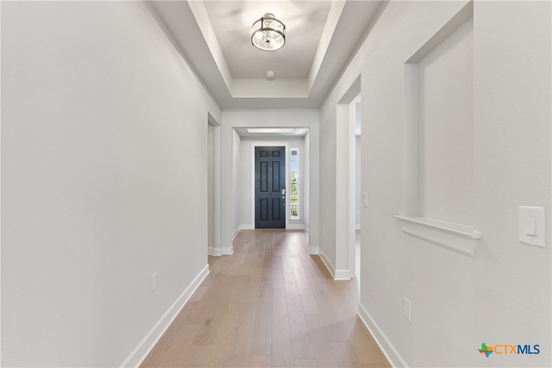 Tulane plan with upgraded kitchen, quartz countertops, hardwood flooring throughout, tray ceilings in entry, 4' garage extension, enlarged covered patio
