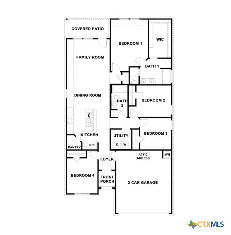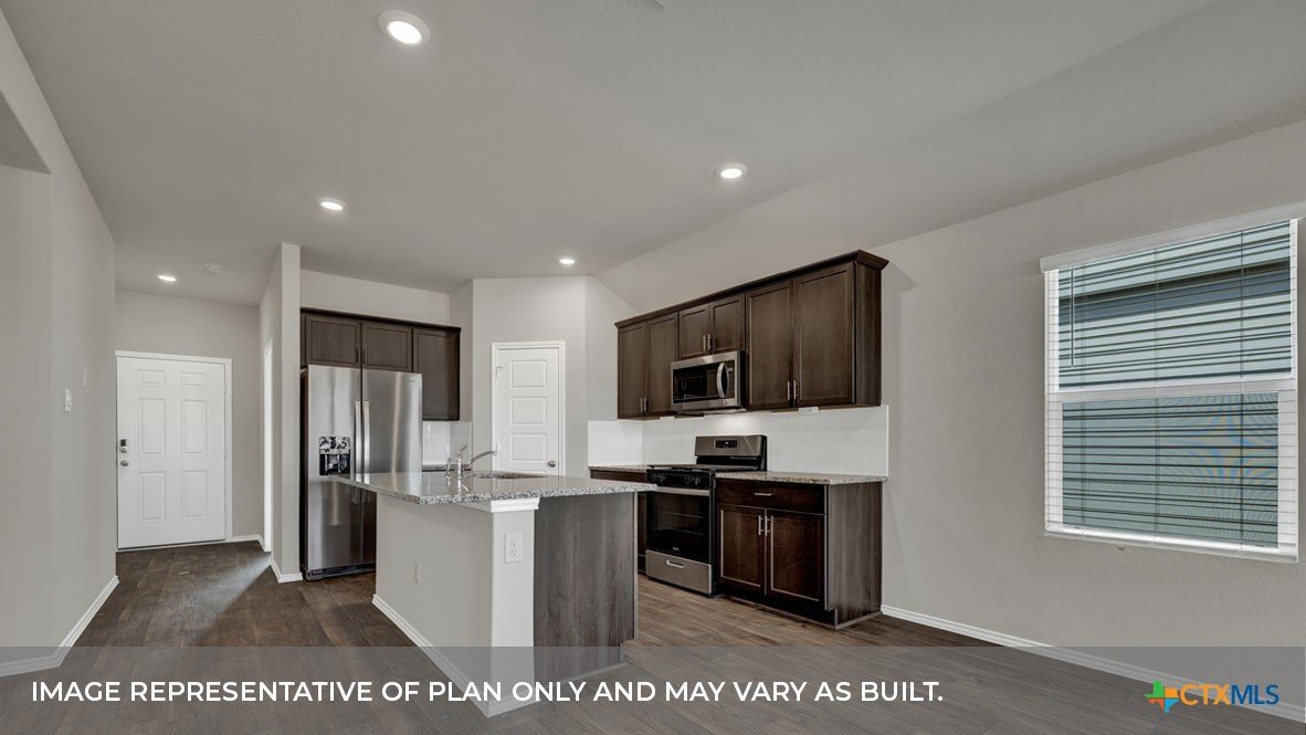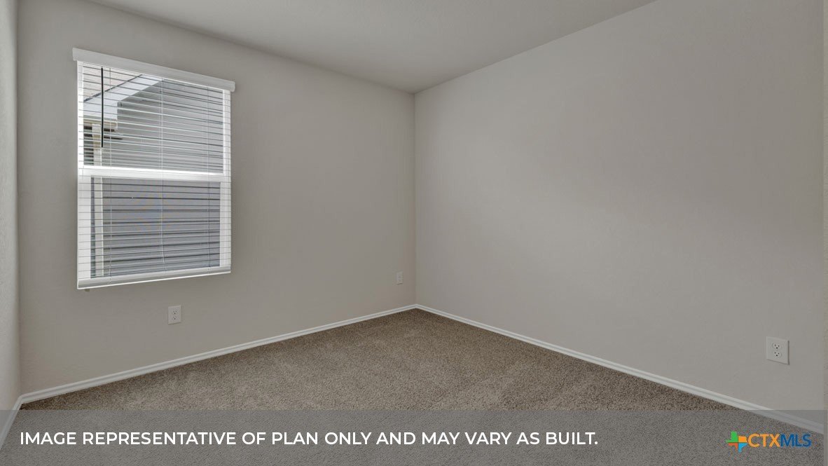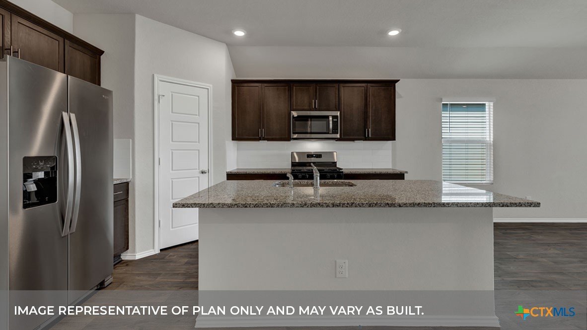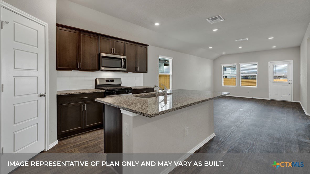 MOVE IN READY. DOES NOT SHARE BACKYARD FENCE WITH NEIGHBOR. Check out our Dalton floorplan, one of our one story options at Saengerhalle Meadows in New Braunfels, TX. This home is perfect for growing families or homeowners that need extra space. Inside this 1,537 square foot home, you will find 4 bedrooms, 2 bathrooms and a 2-car garage. Our homes in Saengerhalle Meadows feature farmhouse exteriors. Step inside the home from the covered entryway and walk through the foyer to the kitchen, dining, and family room. The open concept design allows for conversations to easily flow between spaces while you prepare your meals and relax at the end of your day. The kitchen includes granite countertops, an island with an undermount sink, a corner pantry closet, stainless-steel appliances and 36’’ upper cabinets. Off the family room is the primary bedroom, with its own private bathroom. This relaxing bathroom space features a 5’ walk in shower, double sink vanity, private toilet area with a door, and a walk-in closet. Two additional bedrooms, a full bathroom, and utility room are down the hall from the kitchen. Our secondary bathrooms include a shower/tub combination and extra shelving for storage or décor. Each secondary bedroom features a closet with shelving. The last additional bedroom is located at the front of the home, off the foyer. The Dalton includes vinyl flooring throughout the common areas of the home, and carpet in the bedrooms. All our new homes feature a covered back patio, full sod, an irrigation system in the front and back yard, and a 6’ privacy fence around the back yard. This home includes our America’s Smart Home base package, which includes the Amazon Echo Pop, Front Doorbell, Front Door Deadbolt Lock, Home Hub, Thermostat, and Deako® Smart Switches.