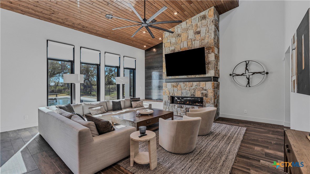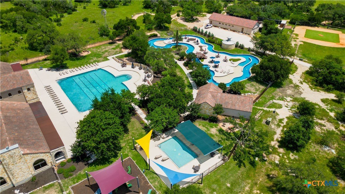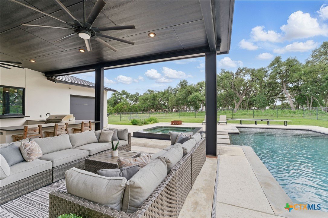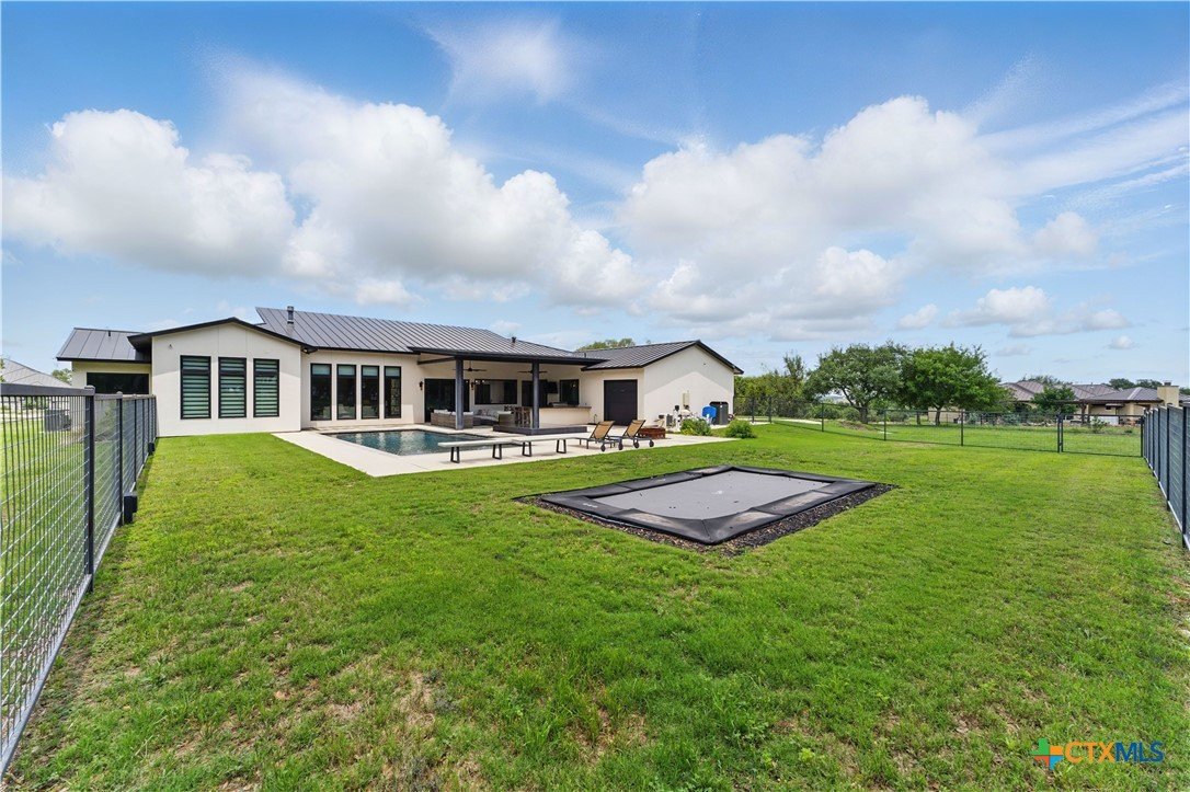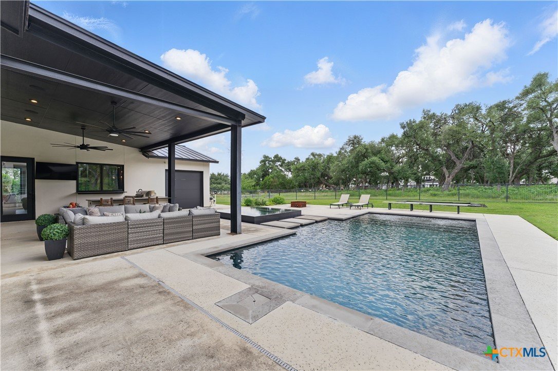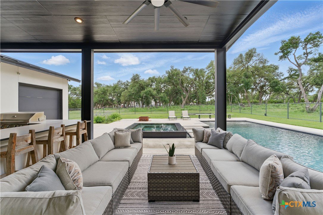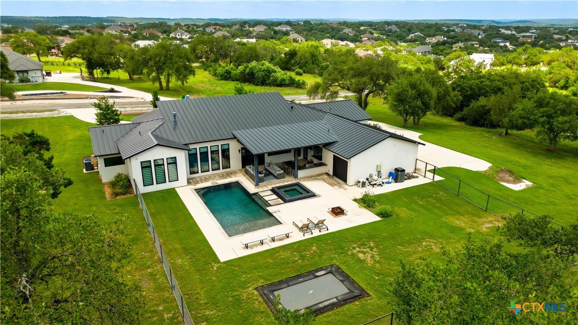 Welcome to 1621 Vintage Way, an absolutely stunning home on 2 acres in Vintage Oaks, "behind the gates". This 4 bedroom, 3.5 bath home, 3700+ sq ft defines New Braunfels Hill Country luxury living with custom wood beams and ceilings to the stone and steel accents. As you enter into this home through the steel pivot door, the entryway is a work of art alone with the stone walls and custom lighting features. The living/dining and kitchen space is perfect for everyday living with views of the back yard, patio and pool. Beyond the kitchen is a large game room with a wet bar and the powder bath, it also accesses the extra 1 car garage, perfect for the golf cart or workshop space. On the other side of the kitchen are 2 guest bedrooms with a jack-n-Jill bath, the laundry room and drop zone for coats and backpacks. On the other side of the house is the master suite, the office and another guestroom with it's own bath. The master suite has a custom ceiling with wood beams with steel accents, the luxurious master bath has his and her vanities, a walk in glassed shower and a soaker tub with an electric fireplace perfect for relaxing. The master closet would be hard to fill up! Head out to the back yard and you'll find a pool and hot tub, outdoor kitchen, fire pit and in-ground trampoline! Sprinkler system, beautiful landscaping with circular driveway, 2 car oversized garage with bump out that can hold a suburban type vehicle, plus an additional single car garage. Vintage Oaks neighborhood features a club house with resort style swimming pool plus lazy river pool, 7800+ sq ft fitness club, playground, tennis courts, baseball field, a soccer field, 5 miles of jogging/walking trails.