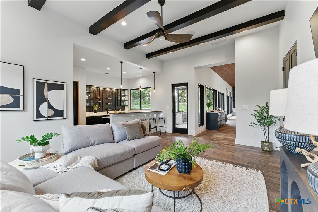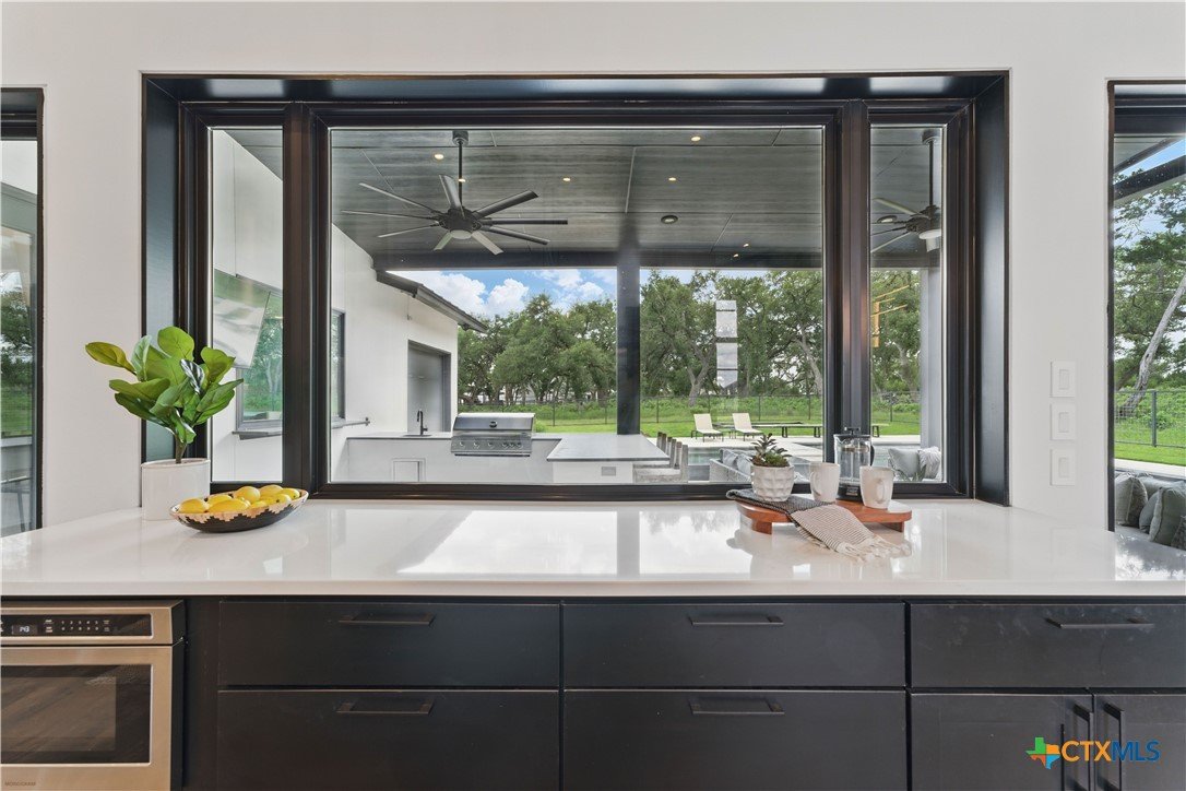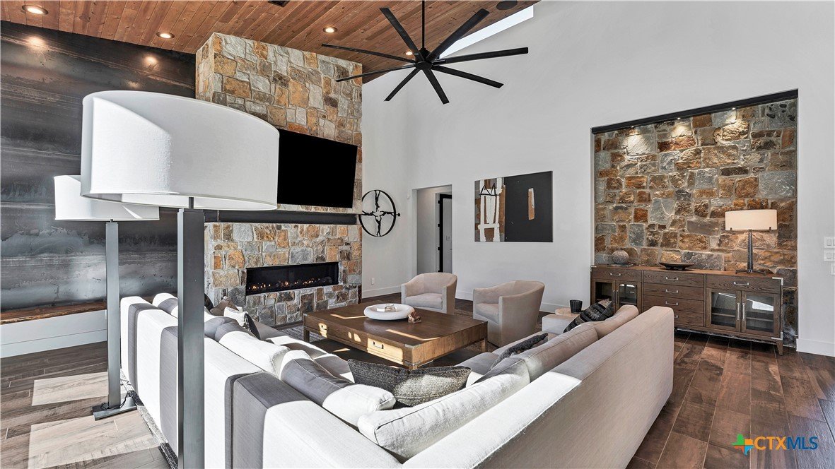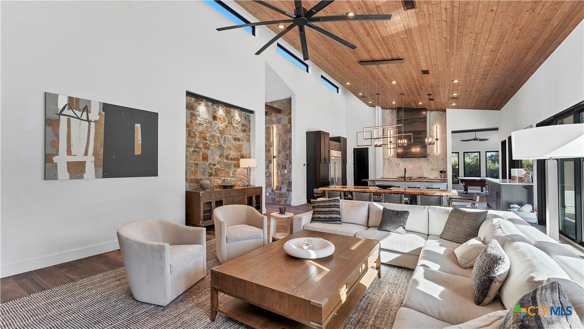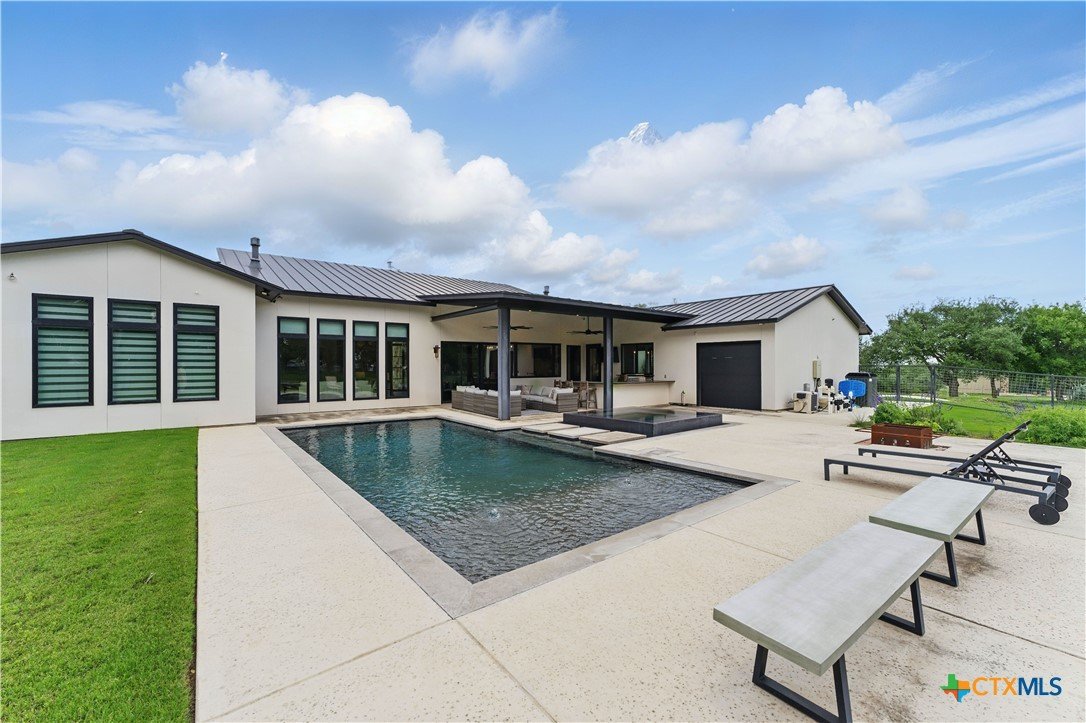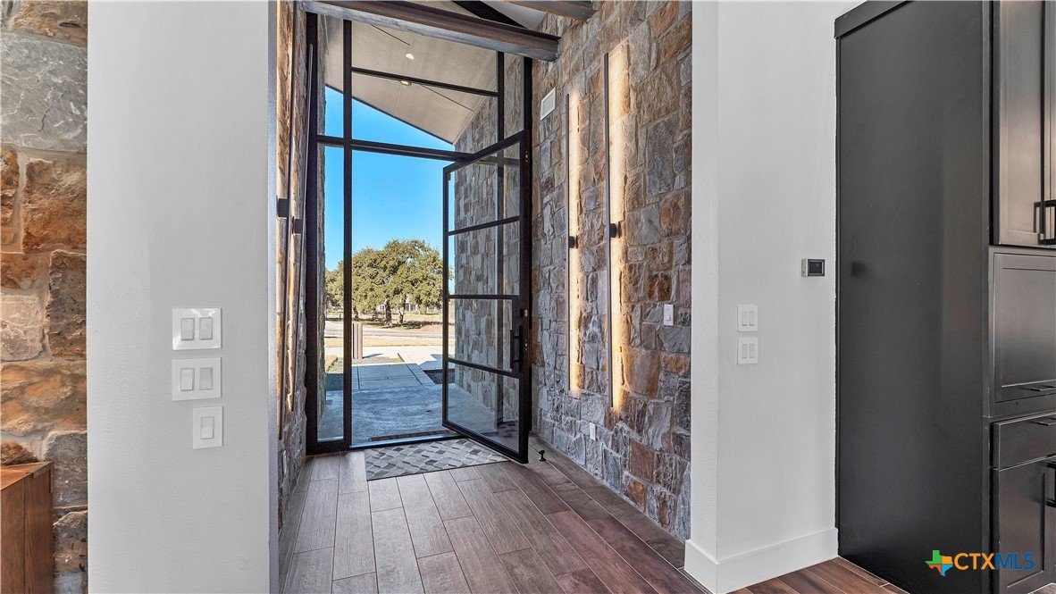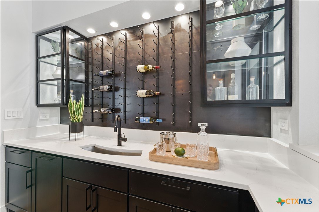 Welcome to 1621 Vintage Way, an absolutely stunning home on 2 acres in Vintage Oaks, "behind the gates". This 4 bedroom, 3.5 bath home, 3700+ sq ft defines New Braunfels Hill Country luxury living with custom wood beams and ceilings to the stone and steel accents. As you enter into this home through the steel pivot door, the entryway is a work of art alone with the stone walls and custom lighting features. The living/dining and kitchen space is perfect for everyday living with views of the back yard, patio and pool. Beyond the kitchen is a large game room with a wet bar and the powder bath, it also accesses the extra 1 car garage, perfect for the golf cart or workshop space. On the other side of the kitchen are 2 guest bedrooms with a jack-n-Jill bath, the laundry room and drop zone for coats and backpacks. On the other side of the house is the master suite, the office and another guestroom with it's own bath. The master suite has a custom ceiling with wood beams with steel accents, the luxurious master bath has his and her vanities, a walk in glassed shower and a soaker tub with an electric fireplace perfect for relaxing. The master closet would be hard to fill up! Head out to the back yard and you'll find a pool and hot tub, outdoor kitchen, fire pit and in-ground trampoline! Sprinkler system, beautiful landscaping with circular driveway, 2 car oversized garage with bump out that can hold a suburban type vehicle, plus an additional single car garage. Vintage Oaks neighborhood features a club house with resort style swimming pool plus lazy river pool, 7800+ sq ft fitness club, playground, tennis courts, baseball field, a soccer field, 5 miles of jogging/walking trails.