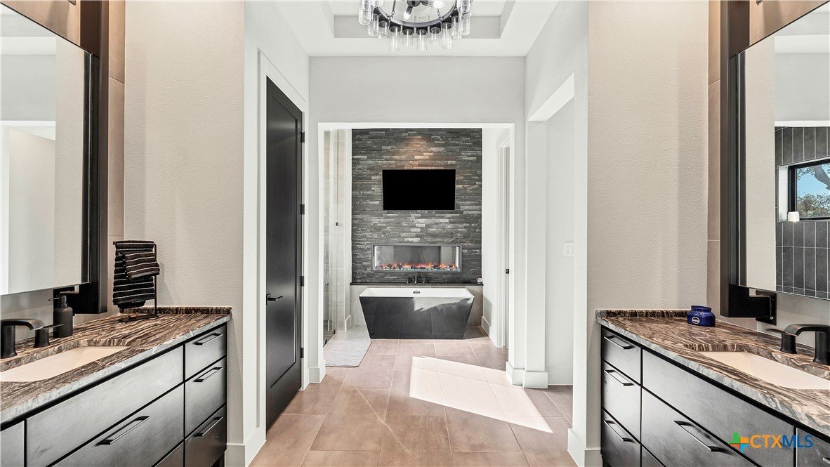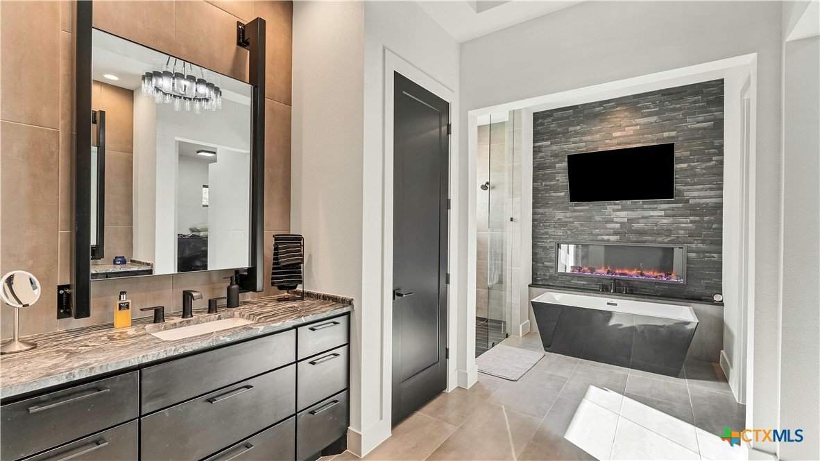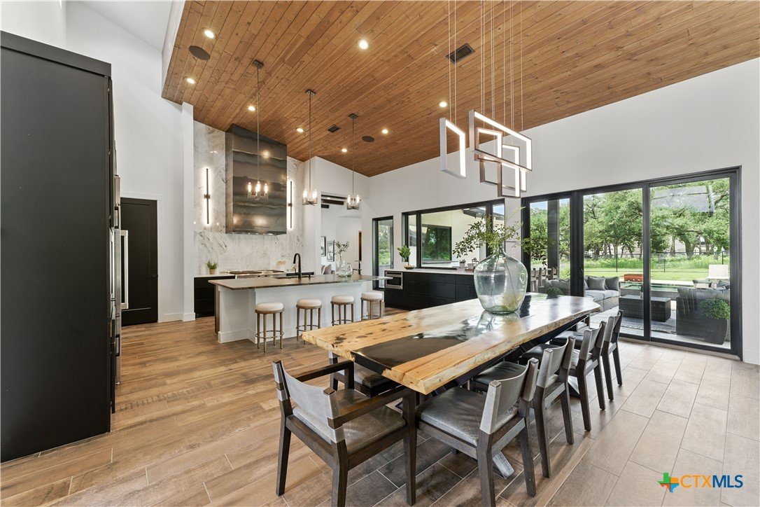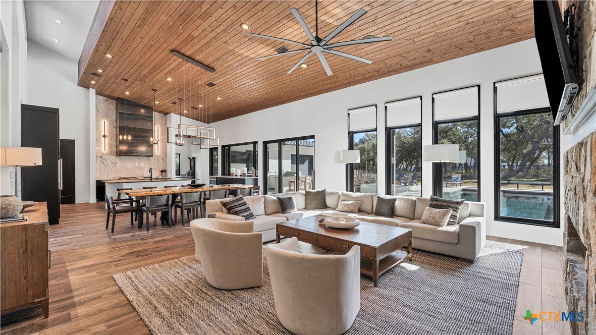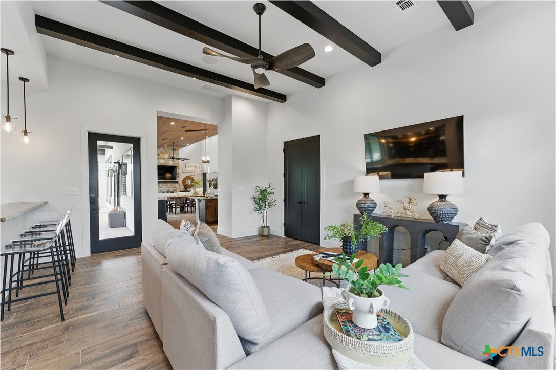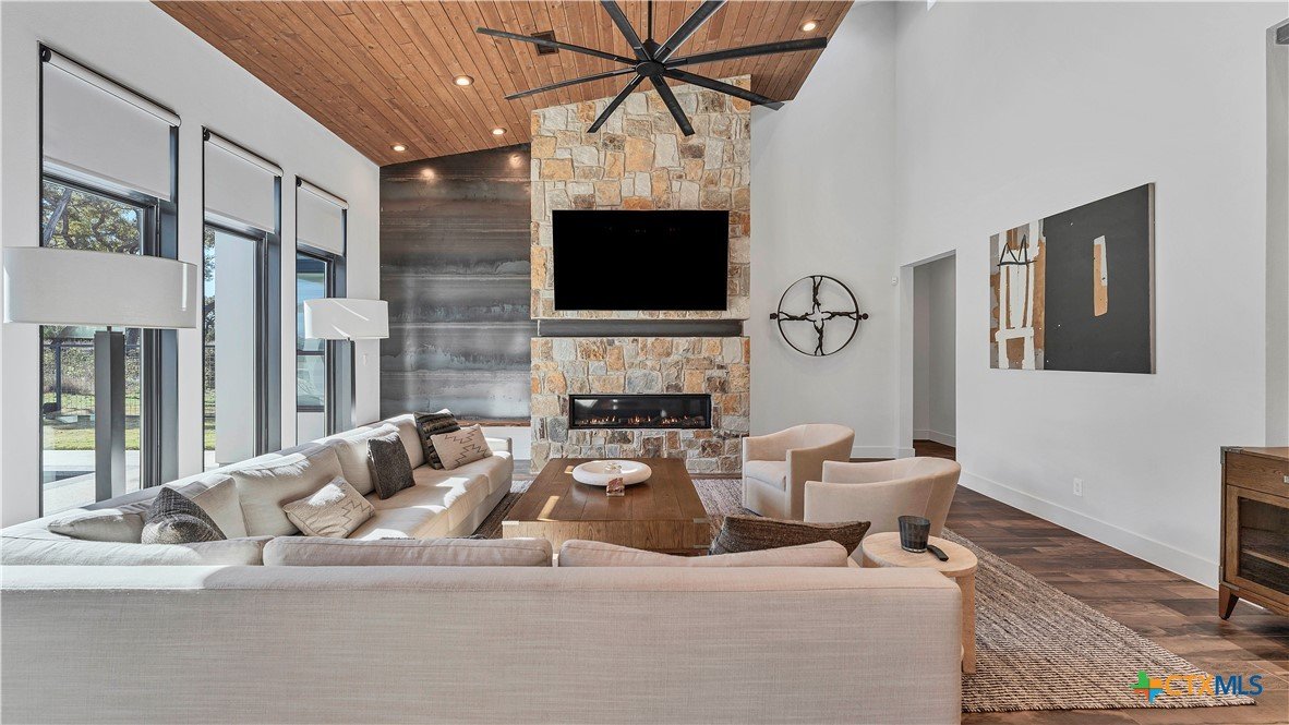 Welcome to 1621 Vintage Way, an absolutely stunning home on 2 acres in Vintage Oaks, "behind the gates". This 4 bedroom, 3.5 bath home, 3700+ sq ft defines New Braunfels Hill Country luxury living with custom wood beams and ceilings to the stone and steel accents. As you enter into this home through the steel pivot door, the entryway is a work of art alone with the stone walls and custom lighting features. The living/dining and kitchen space is perfect for everyday living with views of the back yard, patio and pool. Beyond the kitchen is a large game room with a wet bar and the powder bath, it also accesses the extra 1 car garage, perfect for the golf cart or workshop space. On the other side of the kitchen are 2 guest bedrooms with a jack-n-Jill bath, the laundry room and drop zone for coats and backpacks. On the other side of the house is the master suite, the office and another guestroom with it's own bath. The master suite has a custom ceiling with wood beams with steel accents, the luxurious master bath has his and her vanities, a walk in glassed shower and a soaker tub with an electric fireplace perfect for relaxing. The master closet would be hard to fill up! Head out to the back yard and you'll find a pool and hot tub, outdoor kitchen, fire pit and in-ground trampoline! Sprinkler system, beautiful landscaping with circular driveway, 2 car oversized garage with bump out that can hold a suburban type vehicle, plus an additional single car garage. Vintage Oaks neighborhood features a club house with resort style swimming pool plus lazy river pool, 7800+ sq ft fitness club, playground, tennis courts, baseball field, a soccer field, 5 miles of jogging/walking trails.