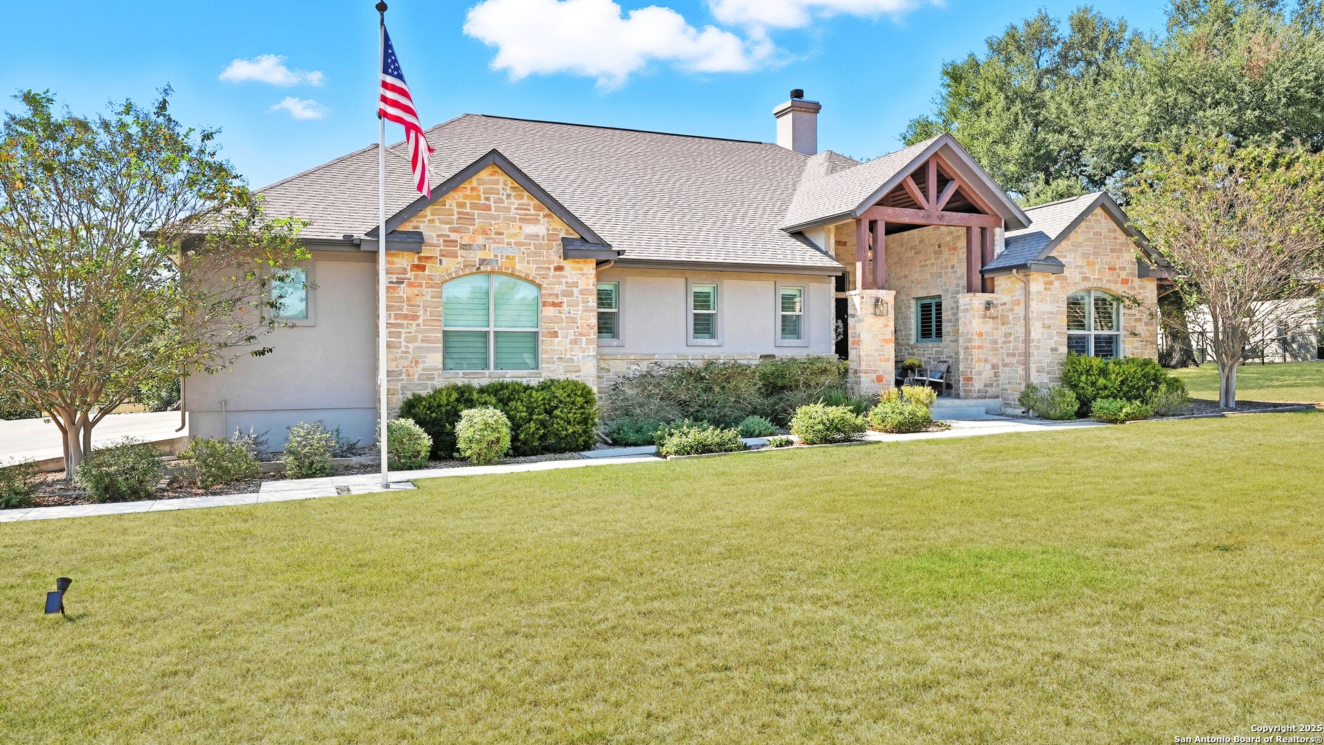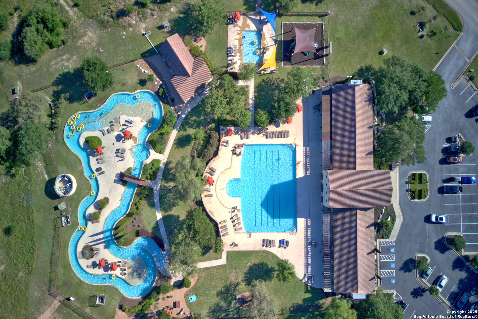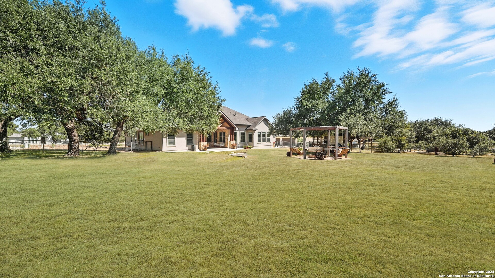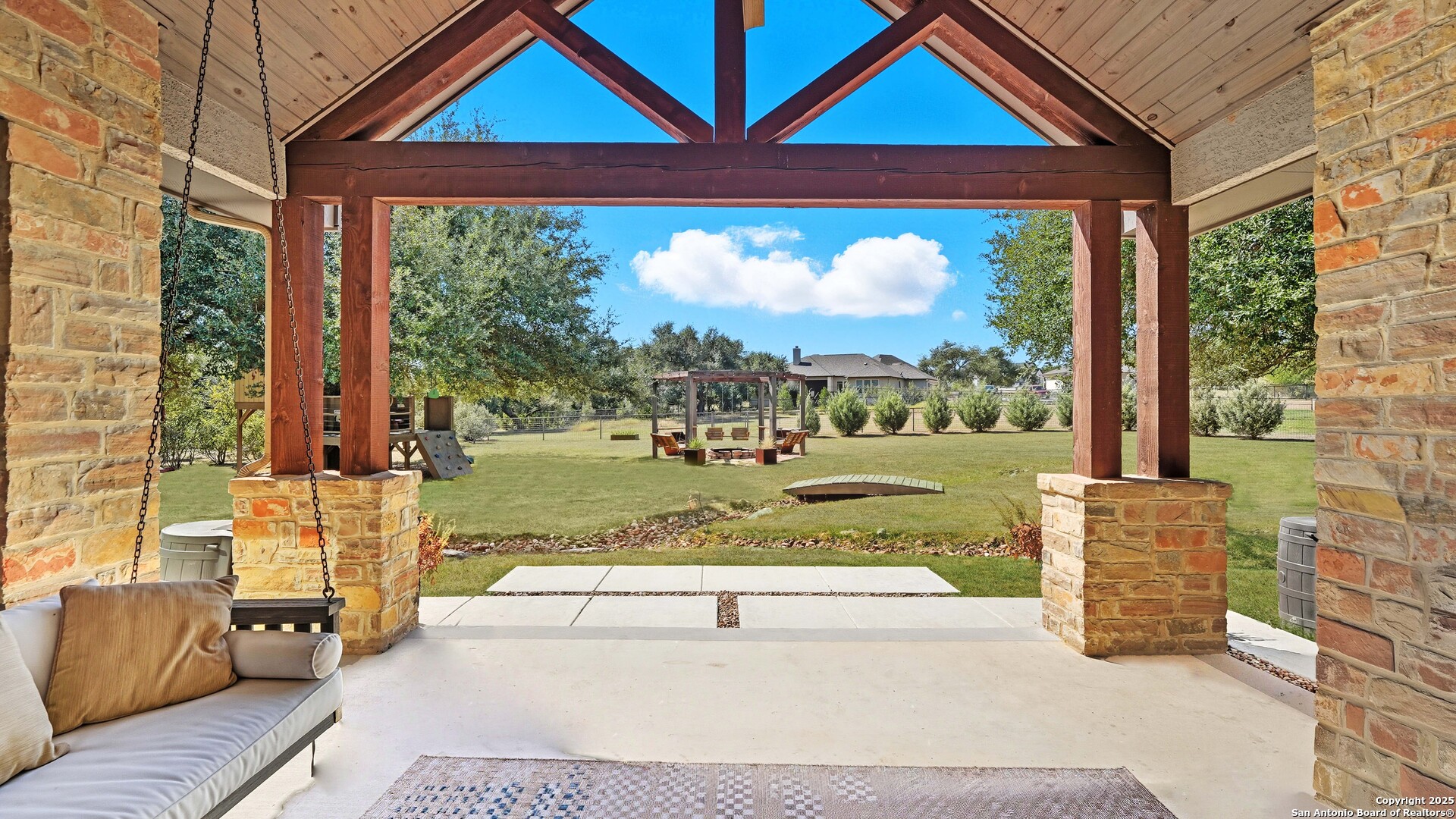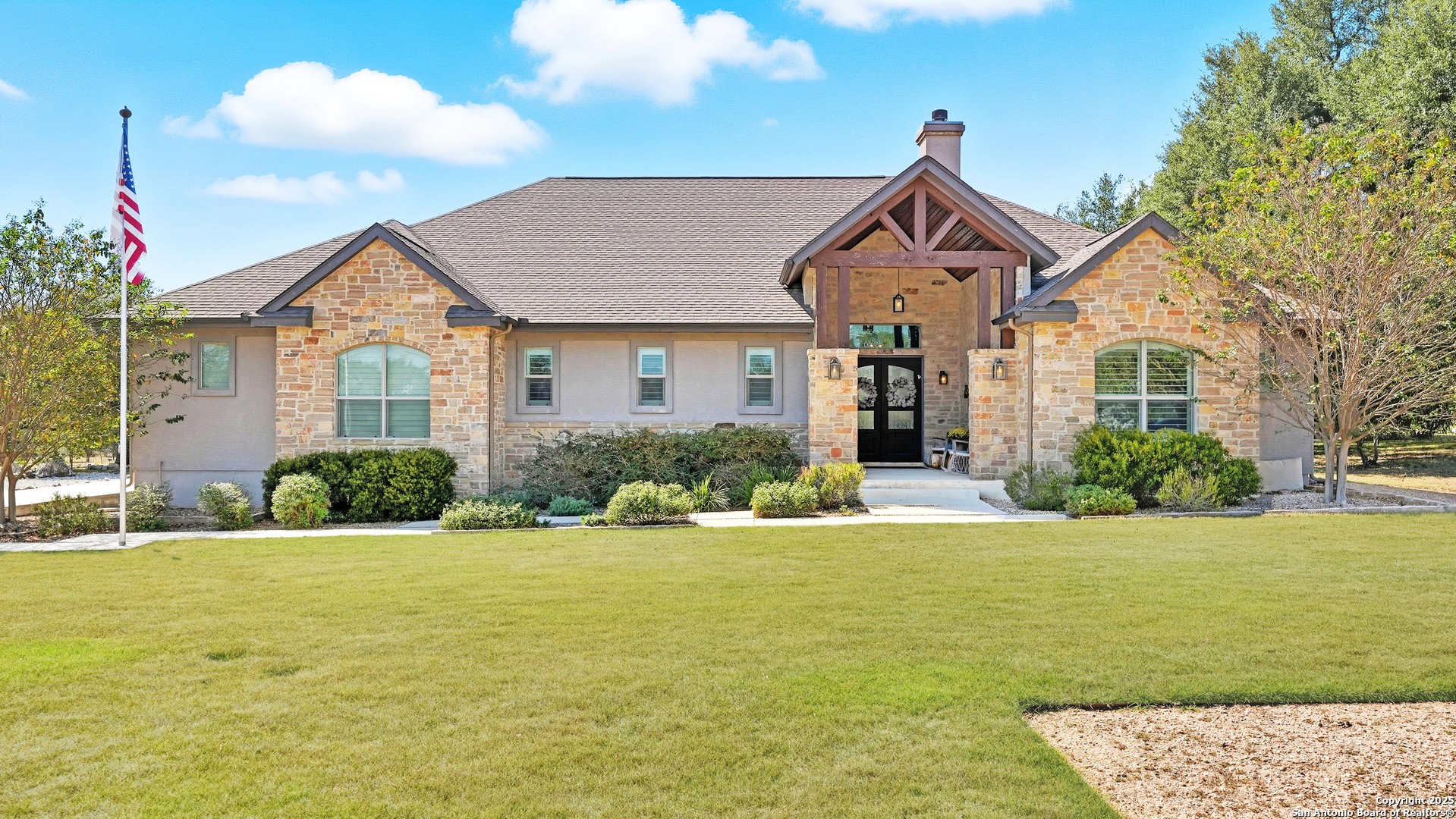 Hill Country Charm Meets Modern Luxury in Vintage Oaks! Welcome home to this stunning custom-built residence by River Hills Custom Homes (2016), perfectly nestled among the oaks in the highly sought-after Vintage Oaks community. This 4-bedroom, 3.5-bathroom home offers a thoughtful open-concept floor plan with additional flex space - ideal for a home office, media room, or play area. Step inside to a bright and spacious living room featuring large picture windows, a gorgeous stone fireplace, and hand-textured walls. The gourmet kitchen is a chef's dream, complete with custom soft-close cabinetry, lighted upper cabinets, a large granite island, glass tile backsplash, and premium KitchenAid appliances including a gas cooktop and oven. The private primary suite is a true retreat - showcasing vaulted ceilings with wood beams, abundant natural light, and custom barn doors that open to a spa-like bathroom with a soaking tub, separate shower, dual vanities, and two generous sized closets. Additional highlights include high ceilings, plantation shutters, electric shades, floating built-in shelves, a water softener, and surround sound speakers extending to the back patio, primary bathroom, and flex room. The oversized utility room offers plenty of storage and a convenient mud area just off the garage. Outdoor living shines here - enjoy cool Hill Country evenings on the expansive covered patio with stone accents and a vaulted ceiling. The property features mature live oak trees, easy-care landscaping, a cozy firepit seating area, and even a charming treehouse! The partially fenced lot includes a pasture gate allowing wildlife to roam freely. Practical touches abound - gutters, rain collection barrels, metal planters (all convey), a three-car side-entry garage with insulated LiftMaster door, and attic storage with vaulted, partially decked space. Even holiday lights can be a breeze with soffit outlets and an interior switch in the pantry. Living in Vintage Oaks means enjoying resort-style amenities - multiple pools, a stunning clubhouse, state-of-the-art fitness center with classes, walking trails, sports courts, and a beautiful park hosting outdoor concerts and fireworks. Don't miss this Hill Country gem - the perfect blend of luxury, comfort, and Texas Hill Country living.