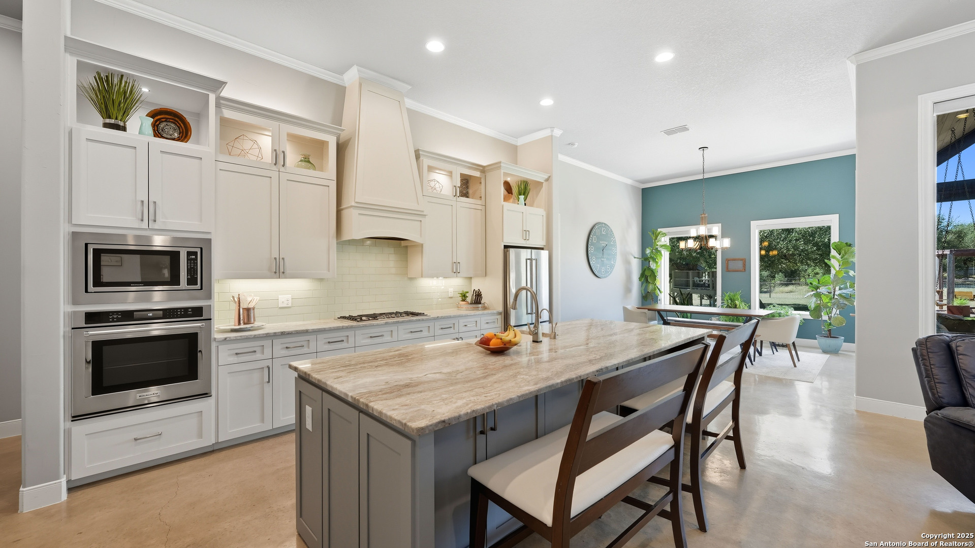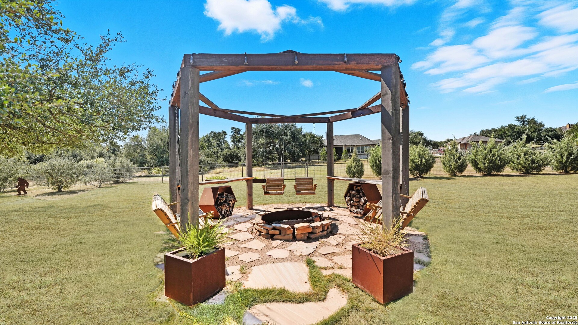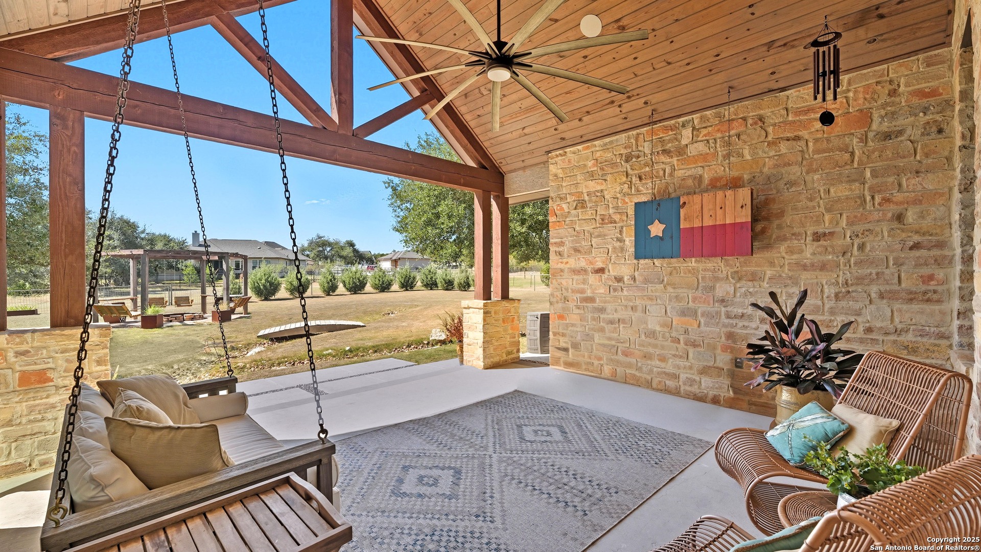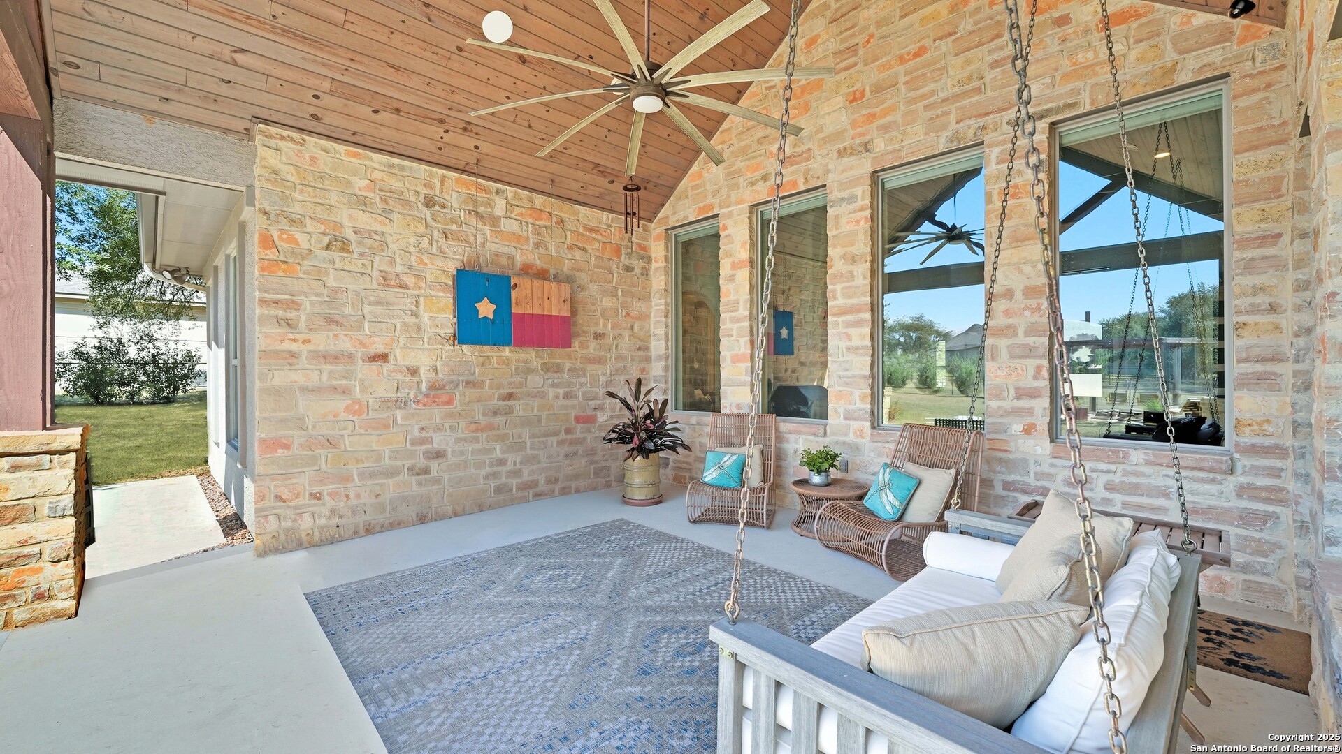 Hill Country Charm Meets Modern Luxury in Vintage Oaks! Welcome home to this stunning custom-built residence by River Hills Custom Homes (2016), perfectly nestled among the oaks in the highly sought-after Vintage Oaks community. This 4-bedroom, 3.5-bathroom home offers a thoughtful open-concept floor plan with additional flex space - ideal for a home office, media room, or play area. Step inside to a bright and spacious living room featuring large picture windows, a gorgeous stone fireplace, and hand-textured walls. The gourmet kitchen is a chef's dream, complete with custom soft-close cabinetry, lighted upper cabinets, a large granite island, glass tile backsplash, and premium KitchenAid appliances including a gas cooktop and oven. The private primary suite is a true retreat - showcasing vaulted ceilings with wood beams, abundant natural light, and custom barn doors that open to a spa-like bathroom with a soaking tub, separate shower, dual vanities, and two generous sized closets. Additional highlights include high ceilings, plantation shutters, electric shades, floating built-in shelves, a water softener, and surround sound speakers extending to the back patio, primary bathroom, and flex room. The oversized utility room offers plenty of storage and a convenient mud area just off the garage. Outdoor living shines here - enjoy cool Hill Country evenings on the expansive covered patio with stone accents and a vaulted ceiling. The property features mature live oak trees, easy-care landscaping, a cozy firepit seating area, and even a charming treehouse! The partially fenced lot includes a pasture gate allowing wildlife to roam freely. Practical touches abound - gutters, rain collection barrels, metal planters (all convey), a three-car side-entry garage with insulated LiftMaster door, and attic storage with vaulted, partially decked space. Even holiday lights can be a breeze with soffit outlets and an interior switch in the pantry. Living in Vintage Oaks means enjoying resort-style amenities - multiple pools, a stunning clubhouse, state-of-the-art fitness center with classes, walking trails, sports courts, and a beautiful park hosting outdoor concerts and fireworks. Don't miss this Hill Country gem - the perfect blend of luxury, comfort, and Texas Hill Country living.