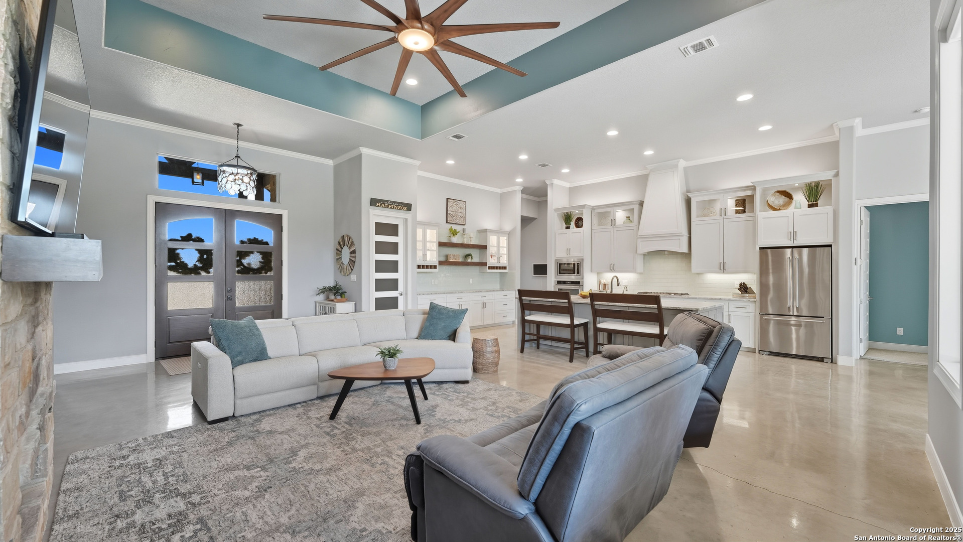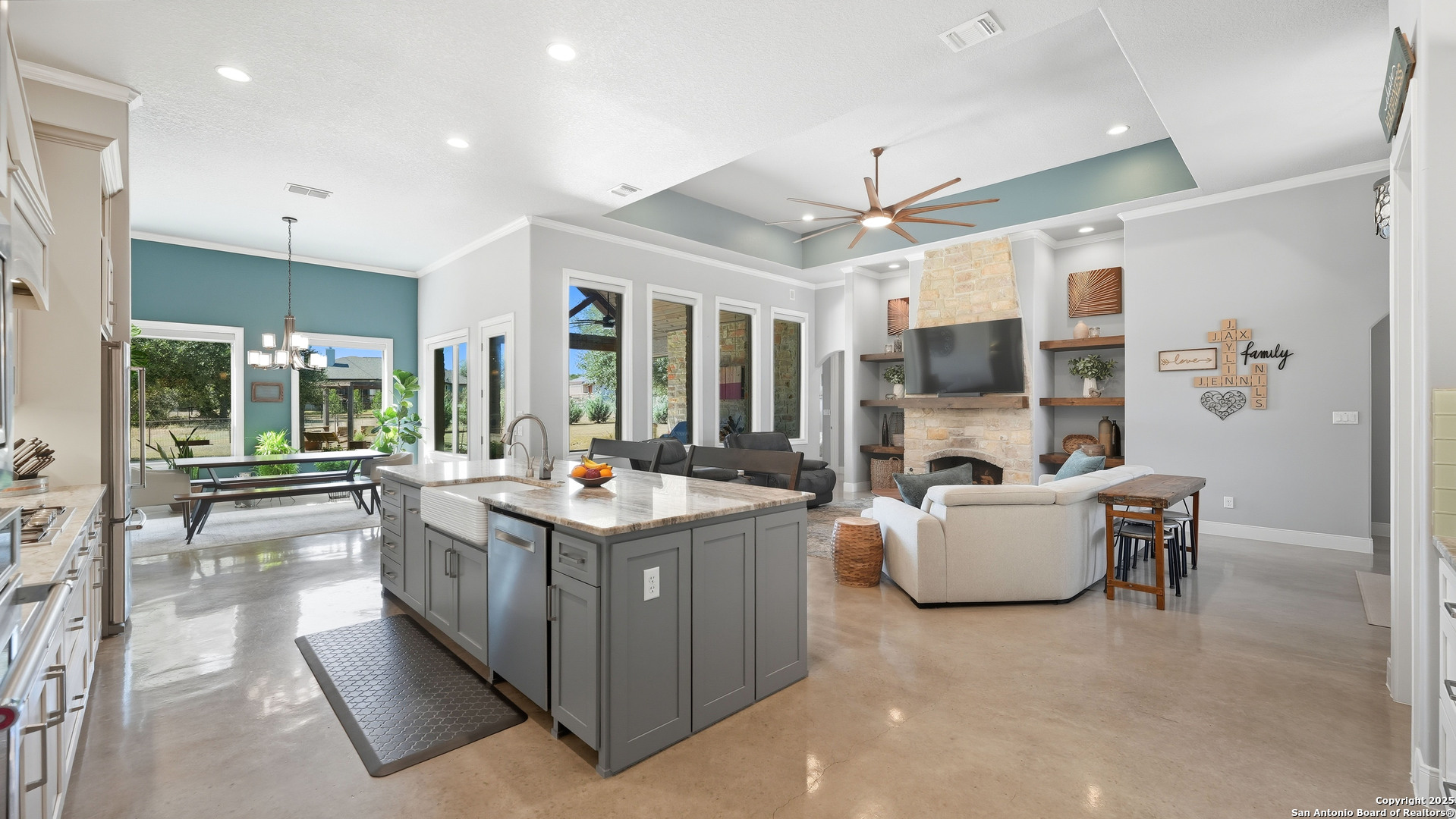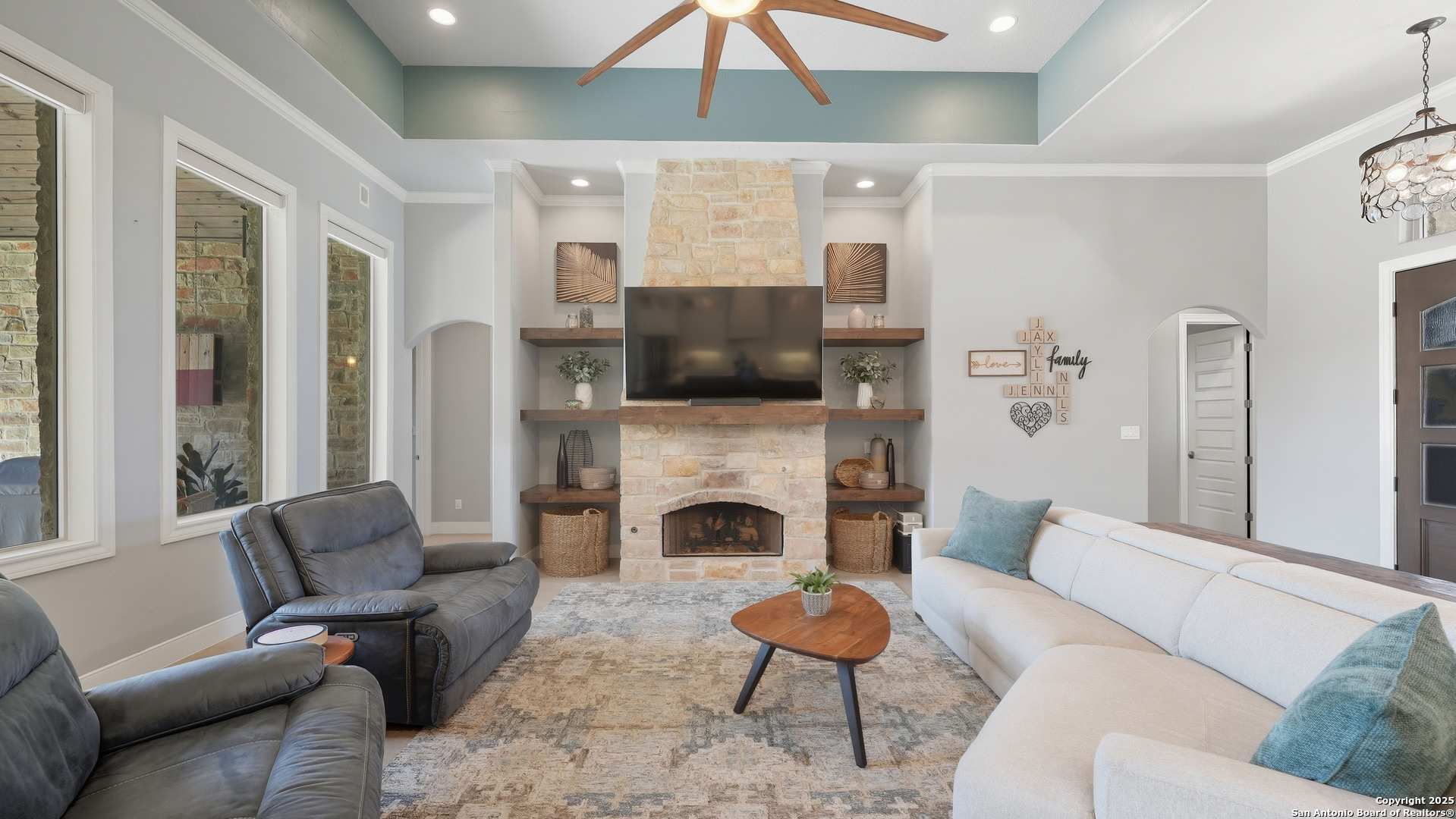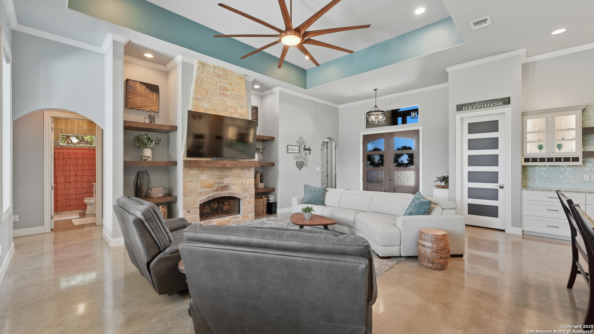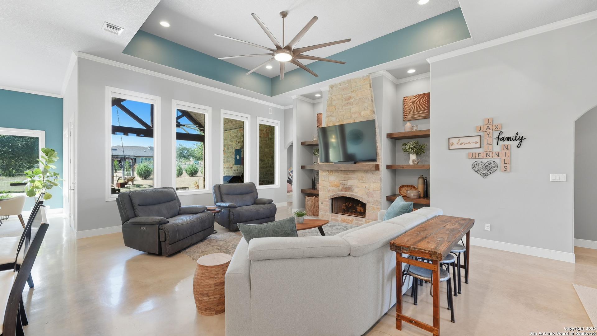Hill Country Charm Meets Modern Luxury in Vintage Oaks! Welcome home to this stunning custom-built residence by River Hills Custom Homes (2016), perfectly nestled among the oaks in the highly sought-after Vintage Oaks community. This 4-bedroom, 3.5-bathroom home offers a thoughtful open-concept floor plan with additional flex space - ideal for a home office, media room, or play area. Step inside to a bright and spacious living room featuring large picture windows, a gorgeous stone fireplace, and hand-textured walls. The gourmet kitchen is a chef's dream, complete with custom soft-close cabinetry, lighted upper cabinets, a large granite island, glass tile backsplash, and premium KitchenAid appliances including a gas cooktop and oven. The private primary suite is a true retreat - showcasing vaulted ceilings with wood beams, abundant natural light, and custom barn doors that open to a spa-like bathroom with a soaking tub, separate shower, dual vanities, and two generous sized closets. Additional highlights include high ceilings, plantation shutters, electric shades, floating built-in shelves, a water softener, and surround sound speakers extending to the back patio, primary bathroom, and flex room. The oversized utility room offers plenty of storage and a convenient mud area just off the garage. Outdoor living shines here - enjoy cool Hill Country evenings on the expansive covered patio with stone accents and a vaulted ceiling. The property features mature live oak trees, easy-care landscaping, a cozy firepit seating area, and even a charming treehouse! The partially fenced lot includes a pasture gate allowing wildlife to roam freely. Practical touches abound - gutters, rain collection barrels, metal planters (all convey), a three-car side-entry garage with insulated LiftMaster door, and attic storage with vaulted, partially decked space. Even holiday lights can be a breeze with soffit outlets and an interior switch in the pantry. Living in Vintage Oaks means enjoying resort-style amenities - multiple pools, a stunning clubhouse, state-of-the-art fitness center with classes, walking trails, sports courts, and a beautiful park hosting outdoor concerts and fireworks. Don't miss this Hill Country gem - the perfect blend of luxury, comfort, and Texas Hill Country living.