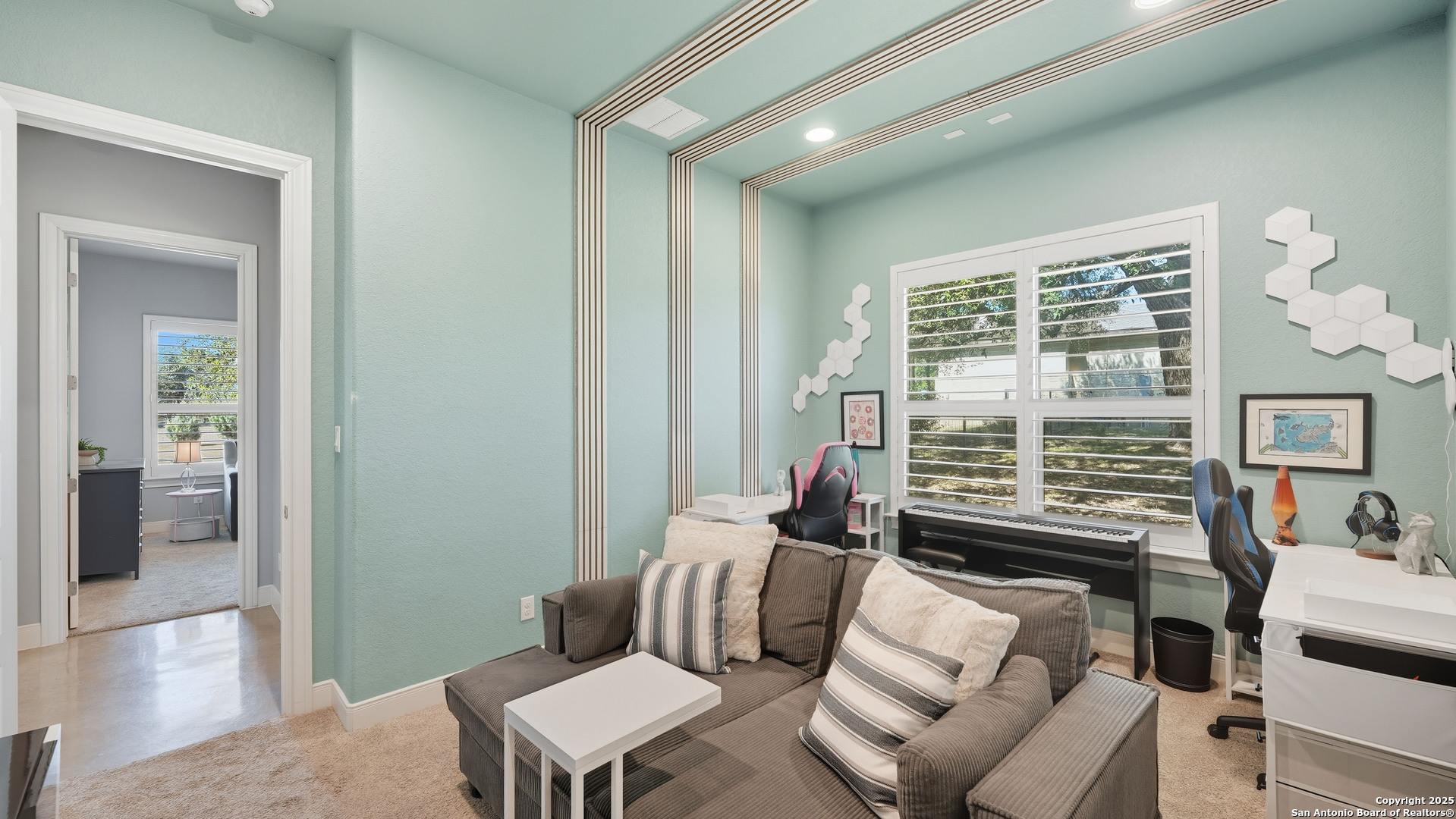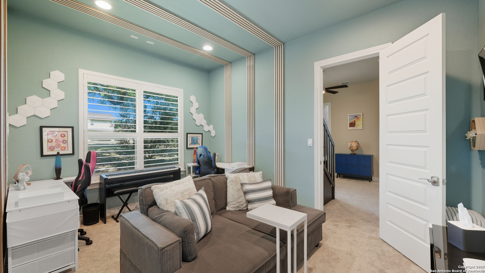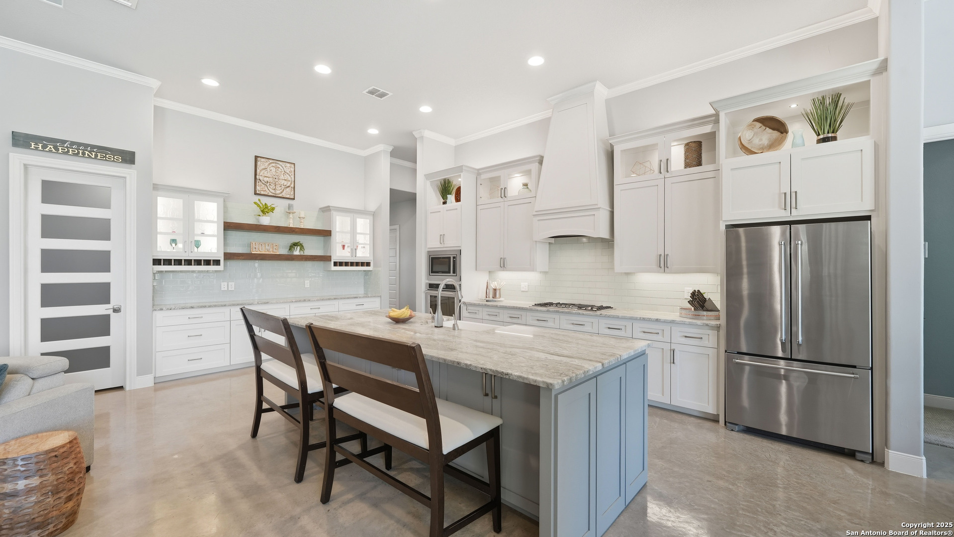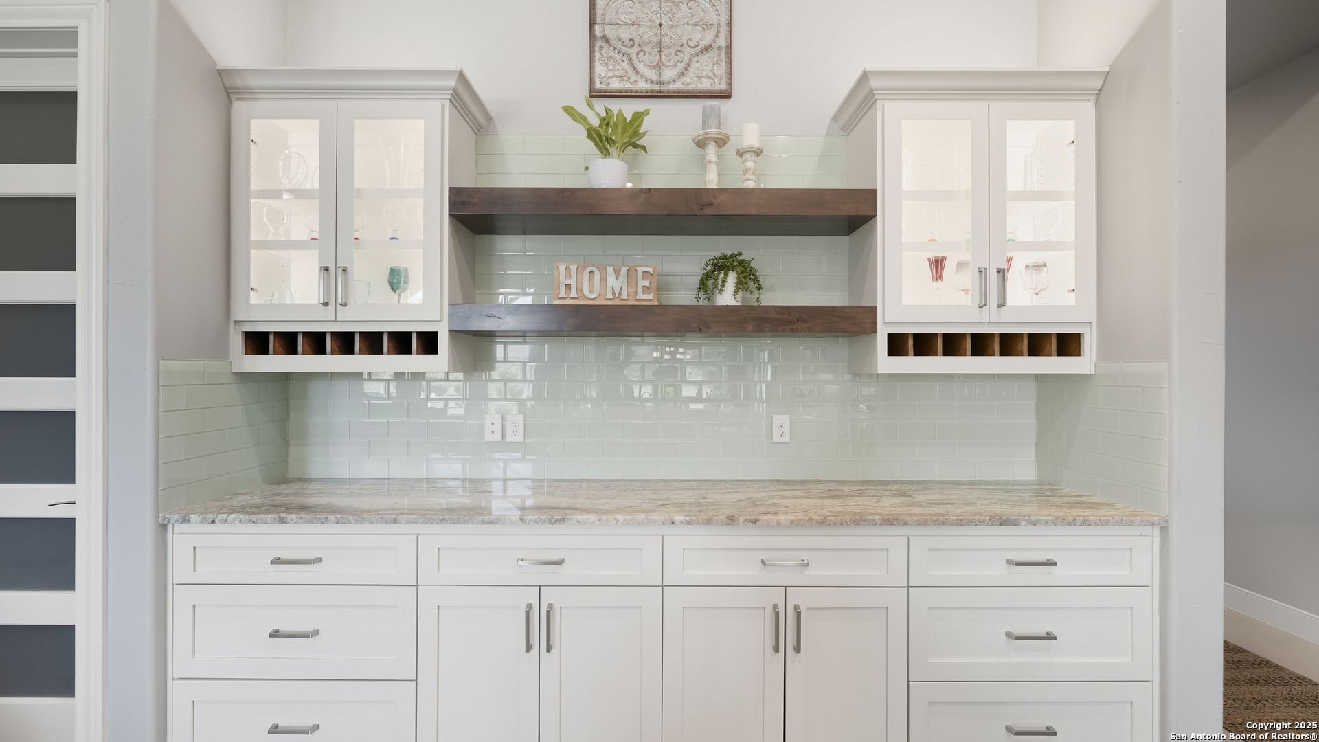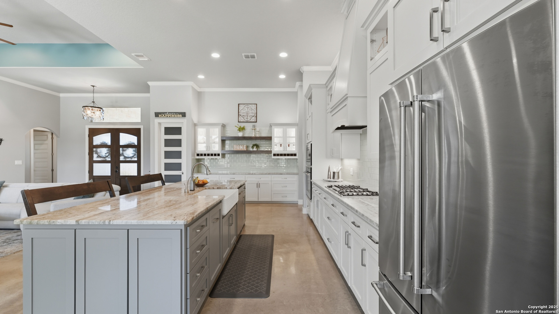 Hill Country Charm Meets Modern Luxury in Vintage Oaks! Welcome home to this stunning custom-built residence by River Hills Custom Homes (2016), perfectly nestled among the oaks in the highly sought-after Vintage Oaks community. This 4-bedroom, 3.5-bathroom home offers a thoughtful open-concept floor plan with additional flex space - ideal for a home office, media room, or play area. Step inside to a bright and spacious living room featuring large picture windows, a gorgeous stone fireplace, and hand-textured walls. The gourmet kitchen is a chef's dream, complete with custom soft-close cabinetry, lighted upper cabinets, a large granite island, glass tile backsplash, and premium KitchenAid appliances including a gas cooktop and oven. The private primary suite is a true retreat - showcasing vaulted ceilings with wood beams, abundant natural light, and custom barn doors that open to a spa-like bathroom with a soaking tub, separate shower, dual vanities, and two generous sized closets. Additional highlights include high ceilings, plantation shutters, electric shades, floating built-in shelves, a water softener, and surround sound speakers extending to the back patio, primary bathroom, and flex room. The oversized utility room offers plenty of storage and a convenient mud area just off the garage. Outdoor living shines here - enjoy cool Hill Country evenings on the expansive covered patio with stone accents and a vaulted ceiling. The property features mature live oak trees, easy-care landscaping, a cozy firepit seating area, and even a charming treehouse! The partially fenced lot includes a pasture gate allowing wildlife to roam freely. Practical touches abound - gutters, rain collection barrels, metal planters (all convey), a three-car side-entry garage with insulated LiftMaster door, and attic storage with vaulted, partially decked space. Even holiday lights can be a breeze with soffit outlets and an interior switch in the pantry. Living in Vintage Oaks means enjoying resort-style amenities - multiple pools, a stunning clubhouse, state-of-the-art fitness center with classes, walking trails, sports courts, and a beautiful park hosting outdoor concerts and fireworks. Don't miss this Hill Country gem - the perfect blend of luxury, comfort, and Texas Hill Country living.