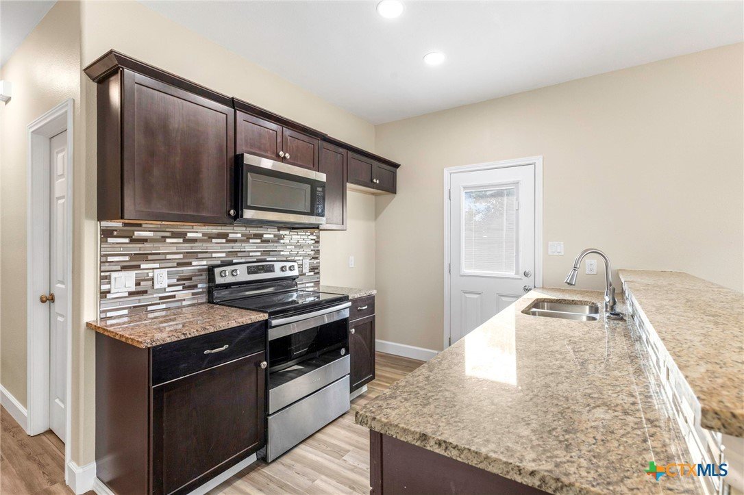 Welcome to 1628 Armstrong, a charming 3-bedroom, 2-bath home perfectly situated on a corner lot in Luling, TX. This inviting residence features granite countertops, stainless steel appliances, and custom bathroom cabinets with single vanities, granite counters, and tub/shower combos in both bathrooms. The open layout offers high ceilings, abundant natural light, and durable laminate flooring throughout—no carpet to worry about. Outside, enjoy pad parking, a privacy-fenced backyard with a storage shed, and plenty of space for relaxing or entertaining. Conveniently located for easy commuting to San Antonio, Austin, and Seguin, you’ll appreciate the quick access to major highways while still enjoying a small-town atmosphere. Nearby Seguin offers fun attractions like the beautiful Guadalupe River, historic downtown square, local breweries, and the famous world’s largest pecan statue—perfect for a quirky day trip. An assumable interest rate of just 3.875% is available—ask the agent for details.