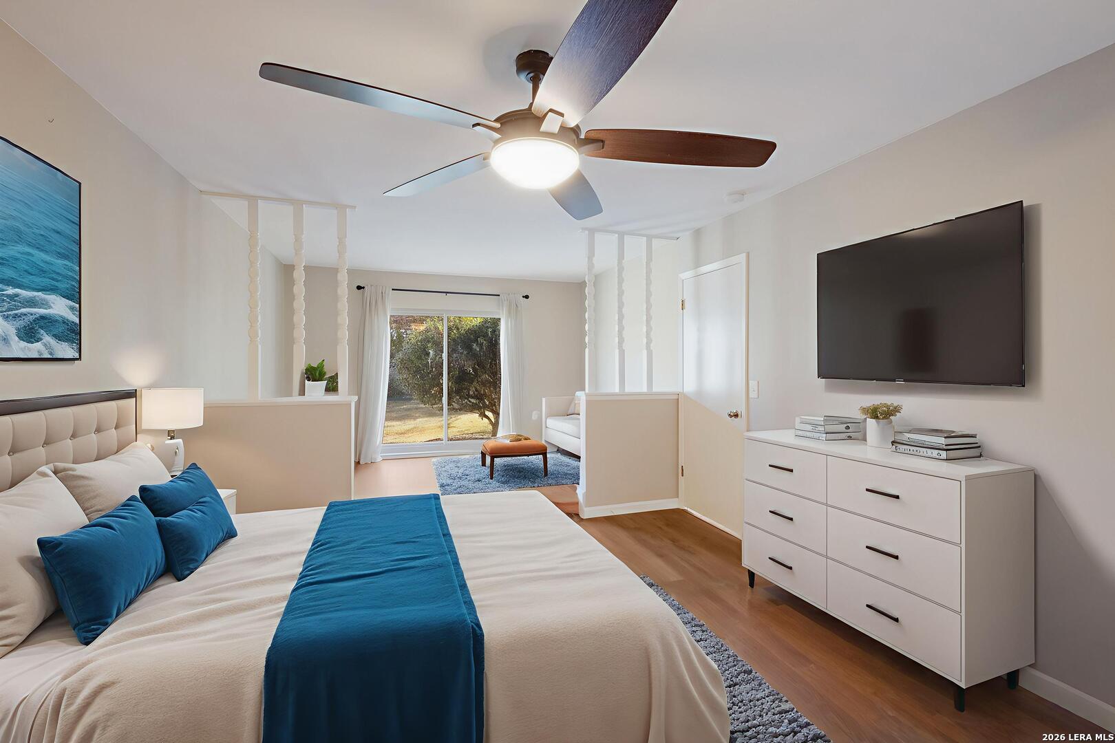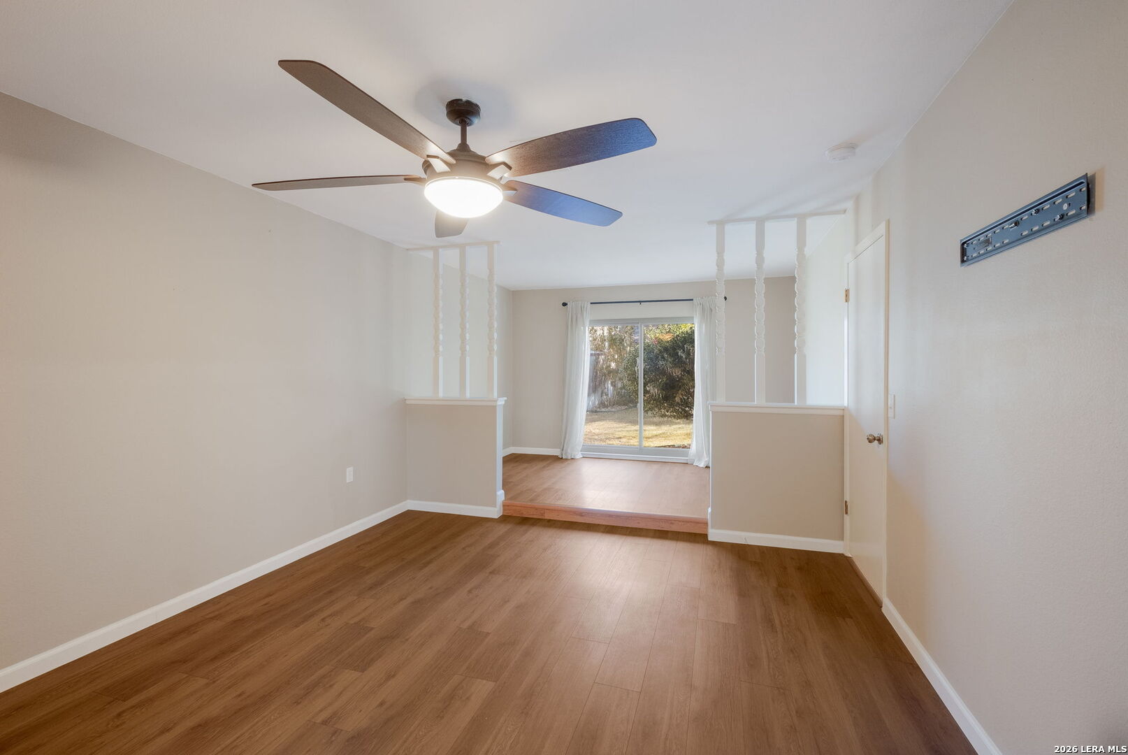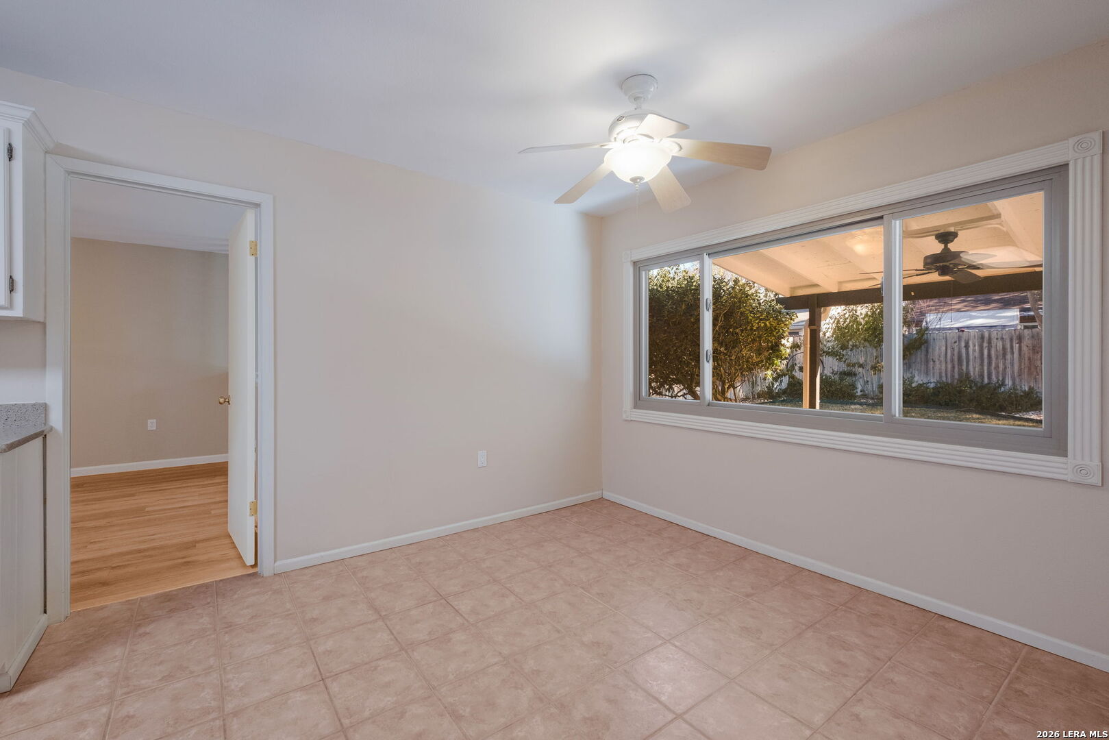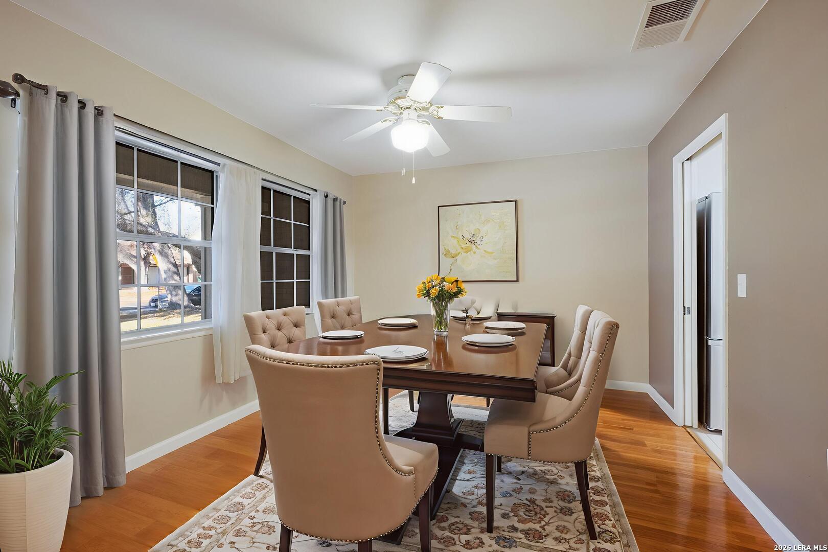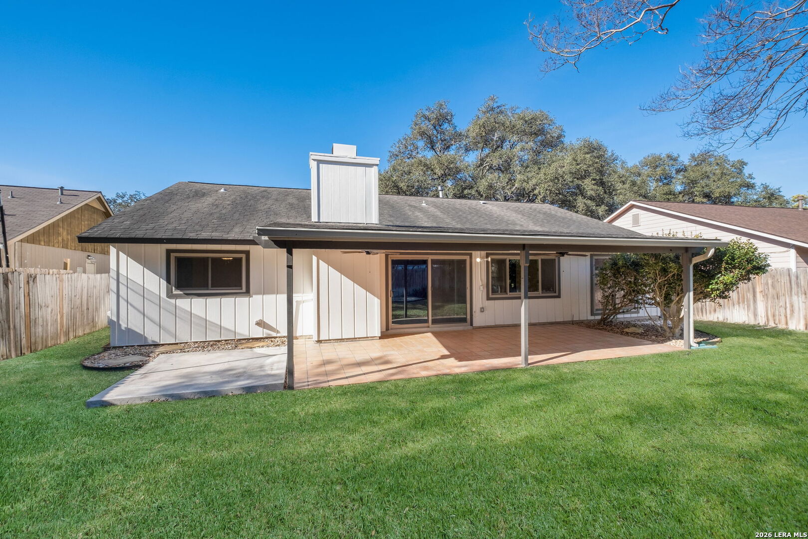Come see this beautiful home featuring Renewal by Andersen windows and NO HOA! This move-in ready property offers vaulted ceilings in the living room, wood floors, and an open, light-filled layout designed for versatility, comfort, and functionality. There's two dining areas include a sunny breakfast nook and a formal dining room that can easily serve as a home office or additional living space-perfect for today's flexible lifestyle. Separated from the other bedrooms, the spacious primary suite features two closets and a dedicated sitting area or private office space, ideal for remote work, reading, or relaxing. Step outside to a beautifully manicured backyard with mature landscaping, a large covered patio, and an extended concrete pad ideal for grilling, entertaining, or adding a hot tub. Don't forget the mature trees in the front yard providing excellent curb appeal! Conveniently located with quick access to Loop 1604, I-35, and Hwy 281, and close to Randolph AFB, Fort Sam Houston. With flexible living spaces, outdoor entertaining areas, and no HOA, this home offers outstanding value in today's market.