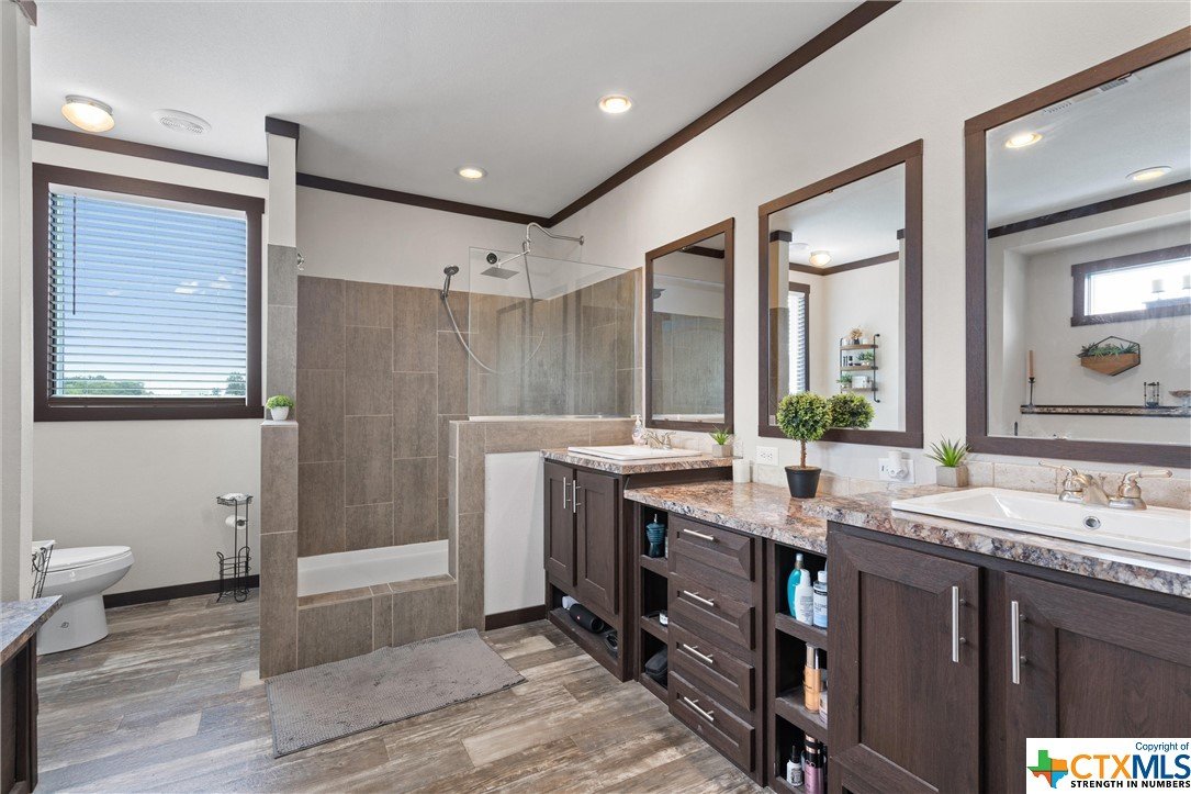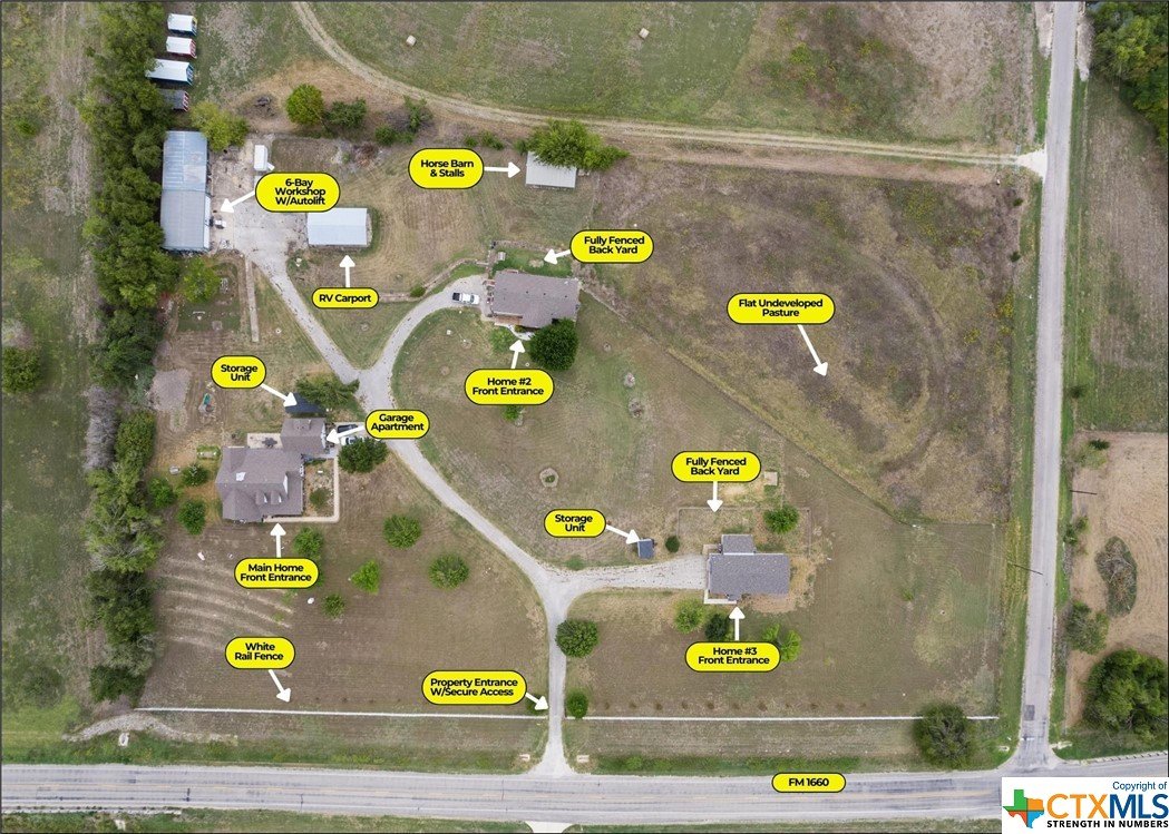 6.2 acre corner lot with NO zoning or restrictions -- 644 ft of frontage along FM 1660 and 435 ft. of frontage along CR 405 -- Currently there is 1 custom home with a garage apartment & 2 manufactured homes on 6.2 acres (2 parcels). Plus a 6-bay workshop with an auto-lift, an RV carport, a horse barn & stalls, 2 storage units and a beautiful white rail fence bordering FM 1660 -- The main house has 3br/2ba, 2210 sf, with a 1br/1ba garage apartment (separate entrance), a wrap-around porch and a covered back patio -- Home #2 has 4br/2ba, 1800 sf and a large covered front porch -- Home #3 has 3br/2ba, 1484 sf and a spacious covered back deck -- Each home is separated with its own driveway, as well as separate mailing addresses, utility meters and septic tanks -- Located less than 5 miles from the Samsung mega plant, and ripe for future growth & development, the possibilities are truly endless for this property and likely very profitable -- Buyer to independently verify all information including but not limited to taxes, schools, square footage, lot size, restrictions, zoning and development.