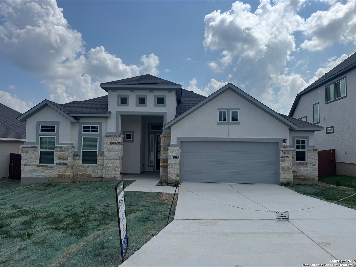 Welcome to the Mia! This stunning one-story home features 3 bedrooms, 2.5 baths, a formal dining room, breakfast area, and a versatile game room-all on one level! The impressive kitchen offers ample cabinet space and an oversized island, overlooking a vaulted family room with large windows for natural light. The master bath boasts dual vanities and a grand walk-in closet. The multi-functional game room can serve as a media room or even a craft space. Designed for both style and function!. Meyer Ranch is located in New Braunfels in the Hill Country right off Hwy 46. HOME IS UNDER CONSTRUCTION, est. completion late summer. **Some photos are REPRESENTATIVE of the floorplan**