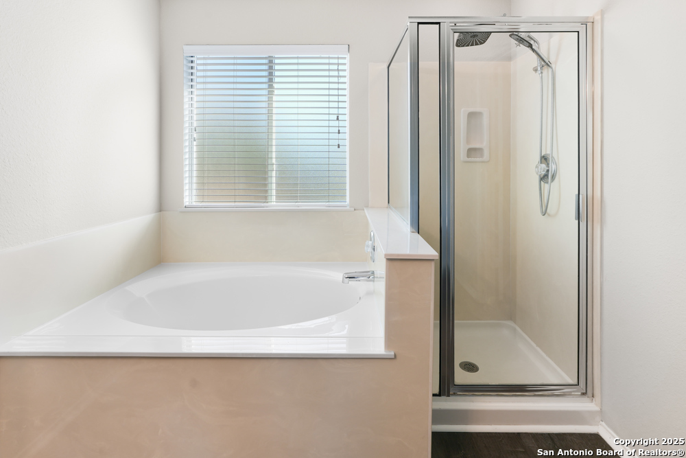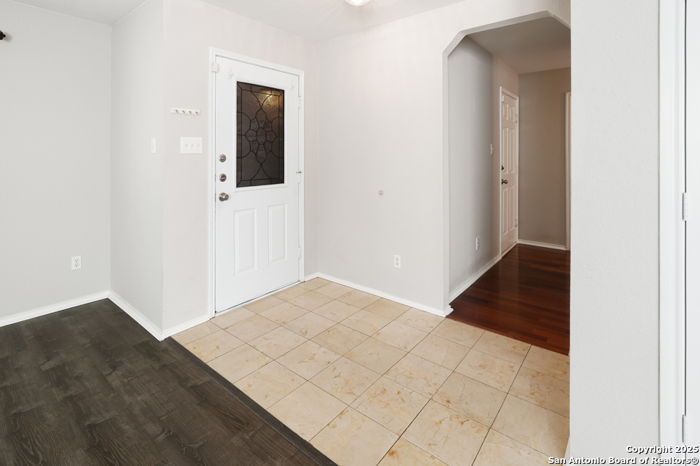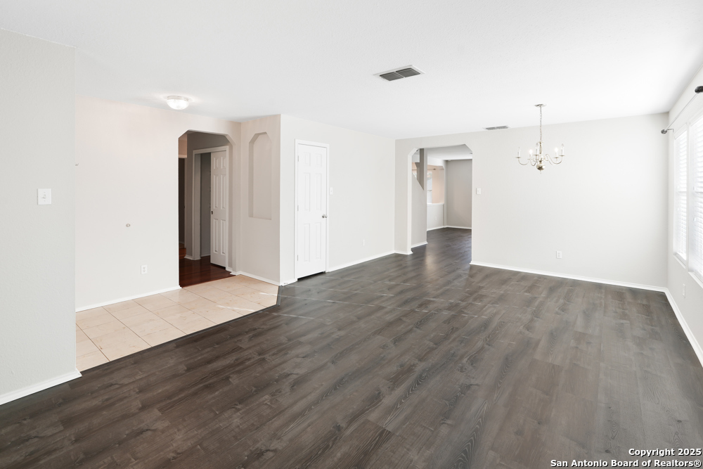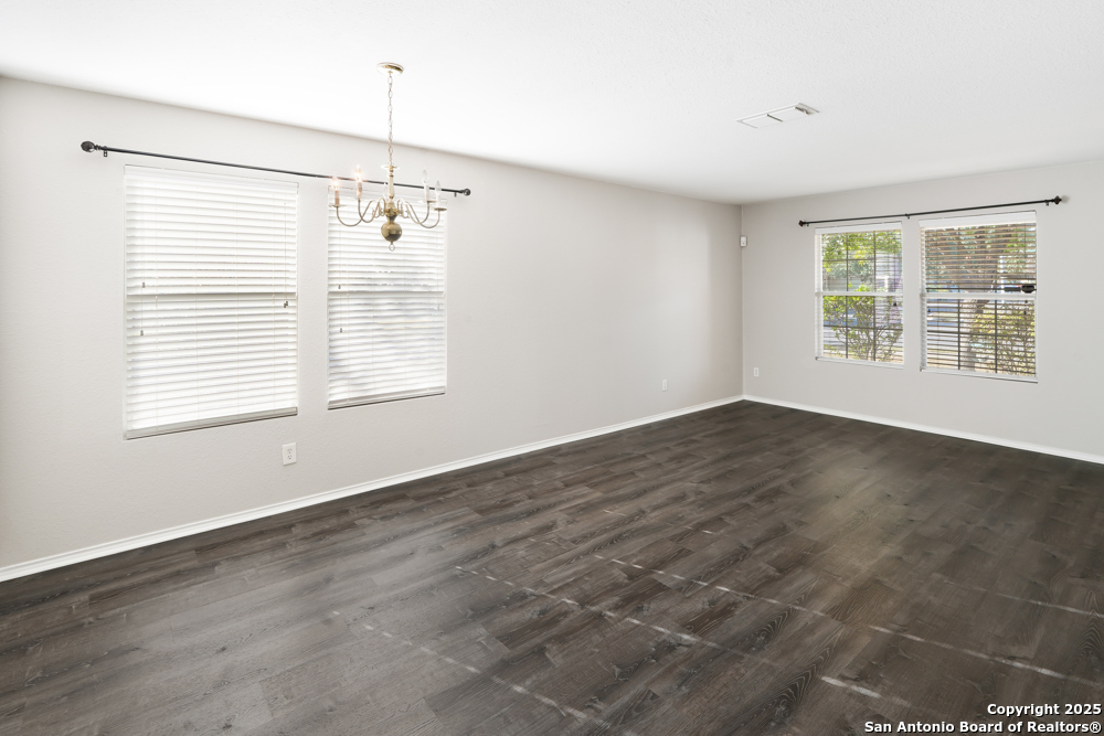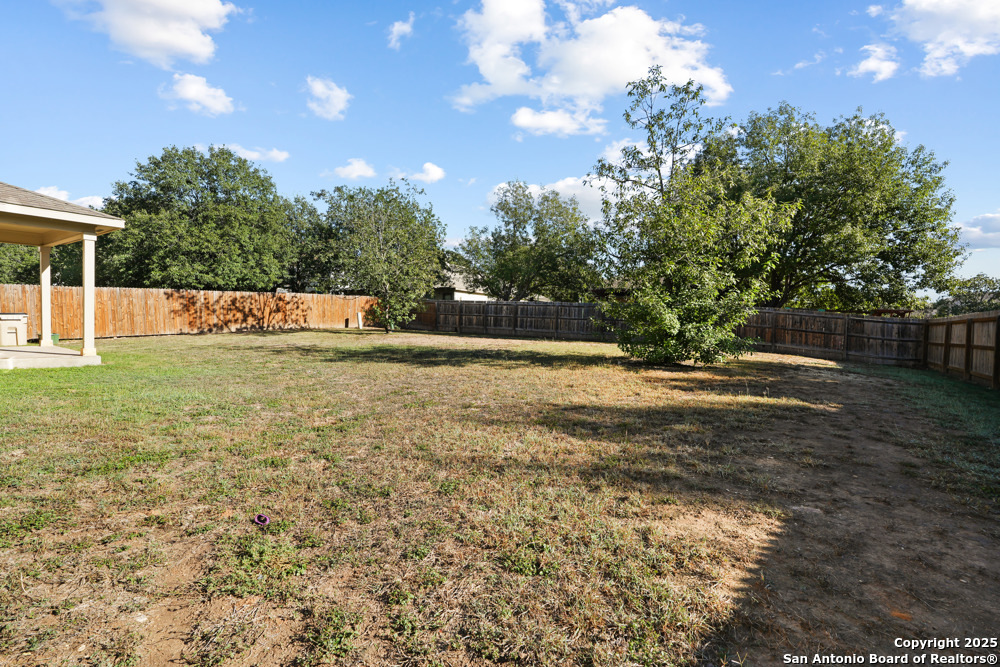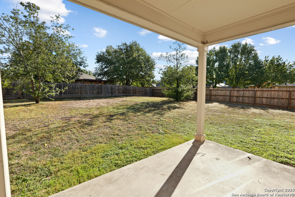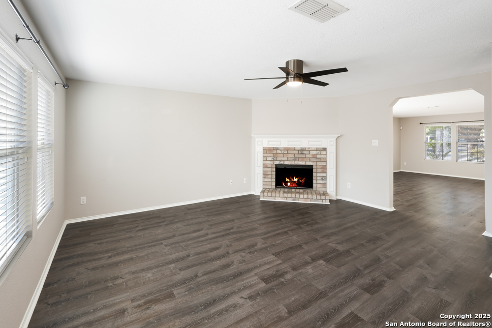 This spacious two-story, 5-bed/3-bath corner-lot home welcomes you with an open floor plan that blends comfort and gathering space. A formal dining and living room set the stage for holidays and celebrations, while the inviting family room features wood-vinyl flooring, a brick fireplace, and a ceiling fan that keeps the space cozy year-round. The bright kitchen offers white cabinetry, stainless steel appliances-including a refrigerator-recessed lighting, generous counter space, and a stylish backsplash. A first-floor bedroom with a full bath provides a perfect setup for guests or a mother-in-law suite. Upstairs, the spacious master retreat feels serene with a recessed ceiling, ceiling fan, abundant natural light, and a large walk-in closet. The ensuite bath includes a garden tub, separate shower, and double vanity for a spa-like start to your day. Step outside to an oversized backyard with a covered patio and privacy fence-ideal for weekend cookouts and unwinding with family and friends. Conveniently located near major highways, Randolph Air Force Base, shopping, and dining, this move-in-ready home offers both comfort and convenience in a prime location.