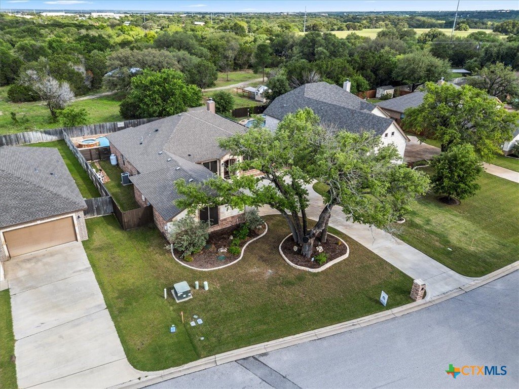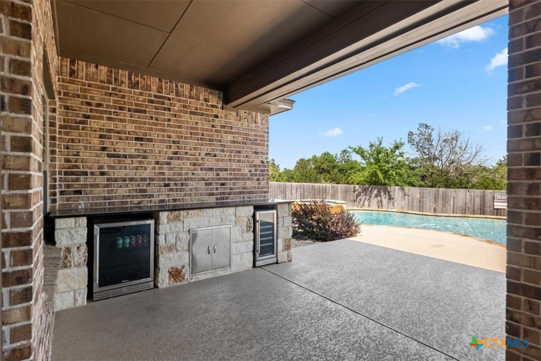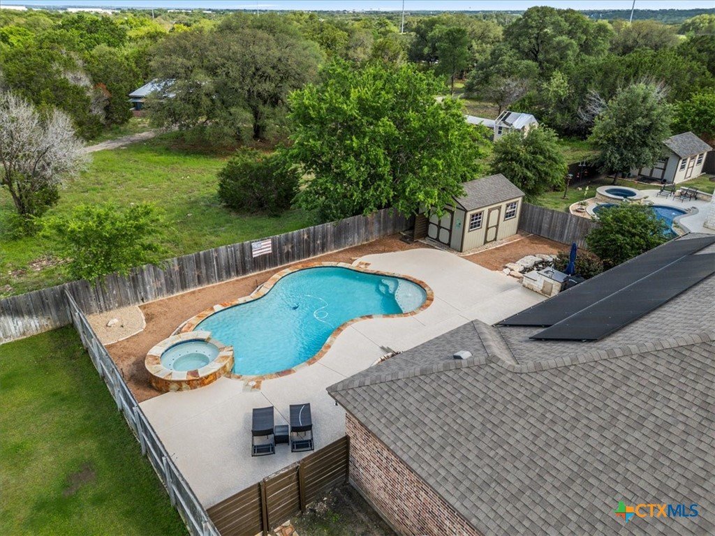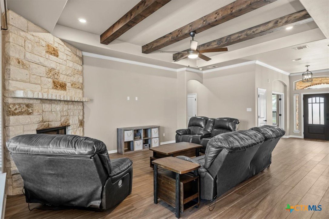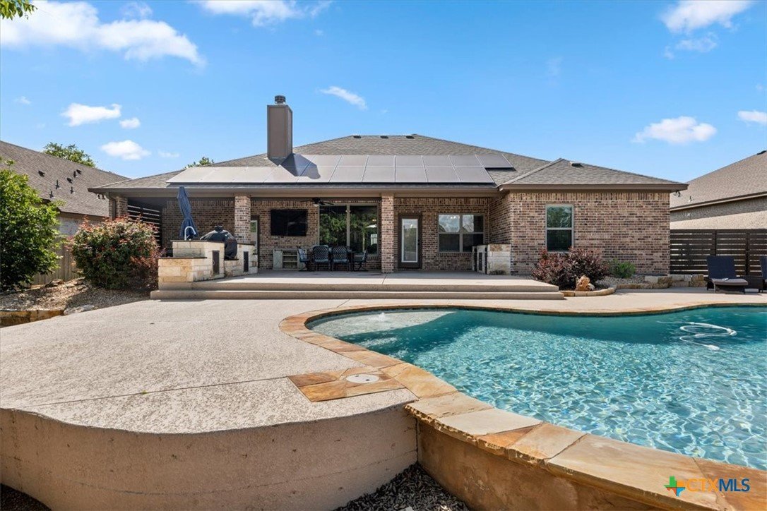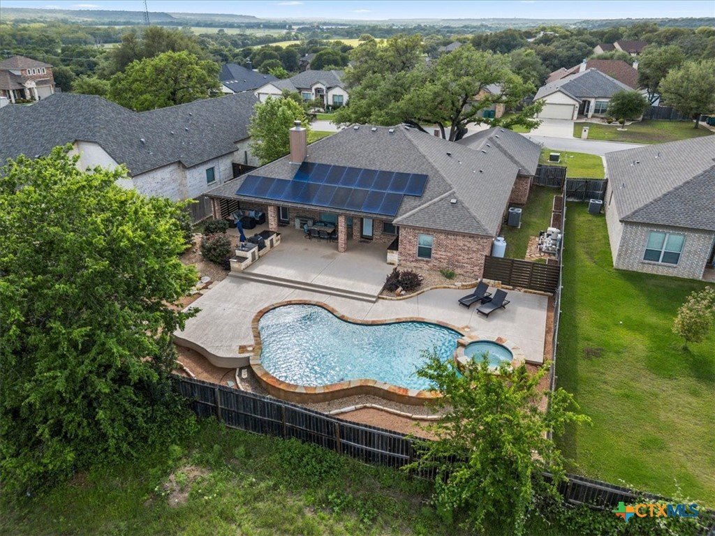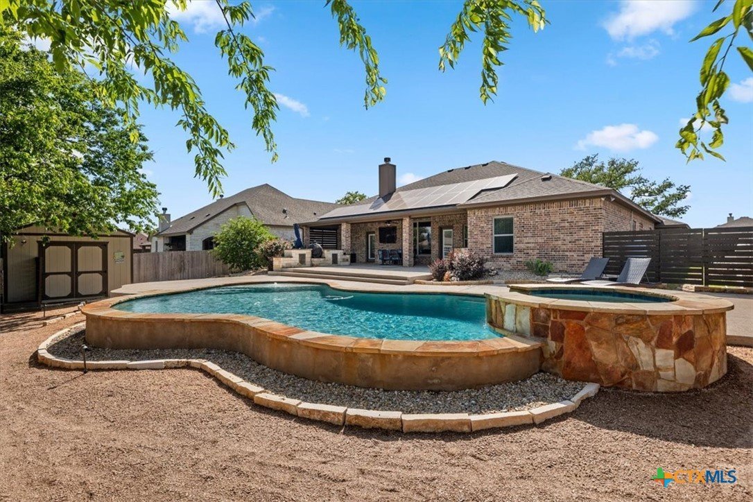 Welcome to your private Central Texas retreat in the desirable Highland Estates, located within Belton ISD and just minutes from Belton Lake. This beautifully crafted Carothers-built home offers 4 spacious bedrooms, 2.5 baths, and a thoughtfully designed layout that blends comfort, elegance, and functionality. Step inside to an inviting open-concept floorplan, where the foyer is flanked by a dedicated study and formal dining area—perfect for both work and entertaining. The living room impresses with soaring beamed ceilings, a cozy wood-burning fireplace, and expansive views of the backyard oasis. The primary suite is a true sanctuary, featuring a massive walk-in closet and direct access to the back deck—ideal for enjoying quiet mornings or evening relaxation. Secondary bedrooms are generously sized and share a well-appointed bathroom with a double vanity. Outdoors, the home truly shines. The backyard backs to a private 4-acre property, offering rare peace and privacy. Designed for entertaining, the space includes a large deck, covered seating area, outdoor kitchen, and multiple beverage refrigerators. The luxurious heated pool and spa feature a stunning waterfall, creating a resort-style atmosphere right at home. Low-maintenance landscaping ensures you can spend more time enjoying and less time working. Additional highlights include a 3-car garage with a finished epoxy floor and ample storage. This is more than a home—it’s a Central Texas haven where comfort, privacy, and outdoor living come together seamlessly.