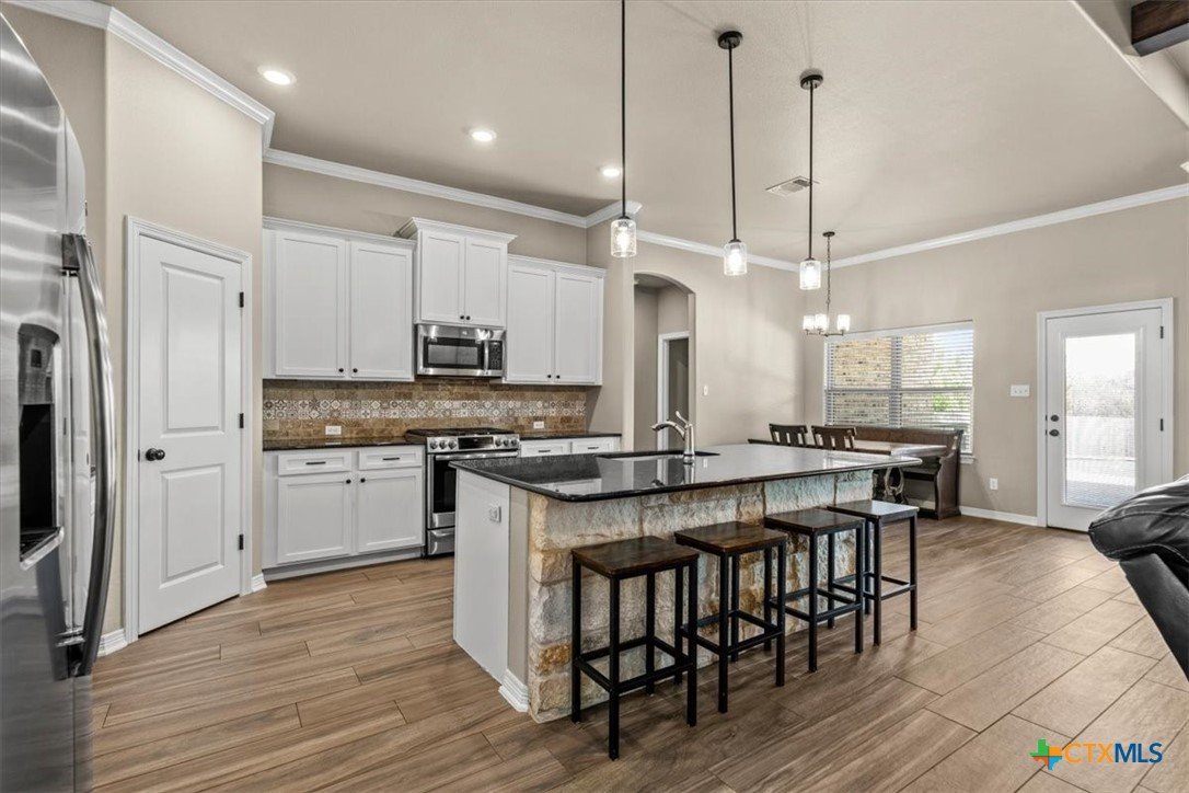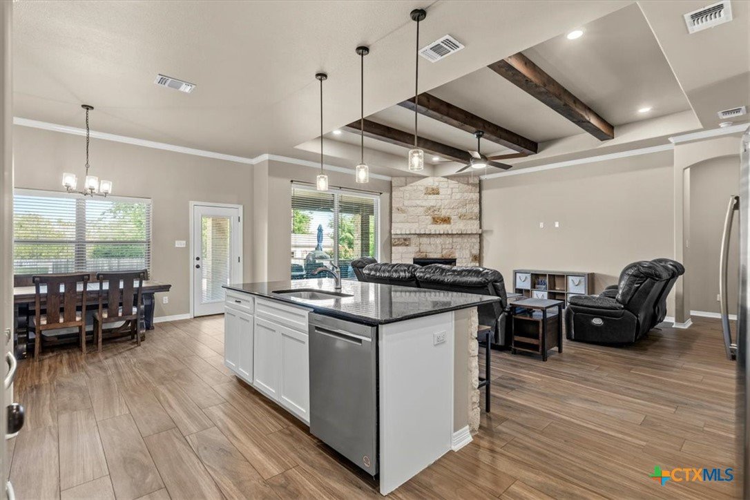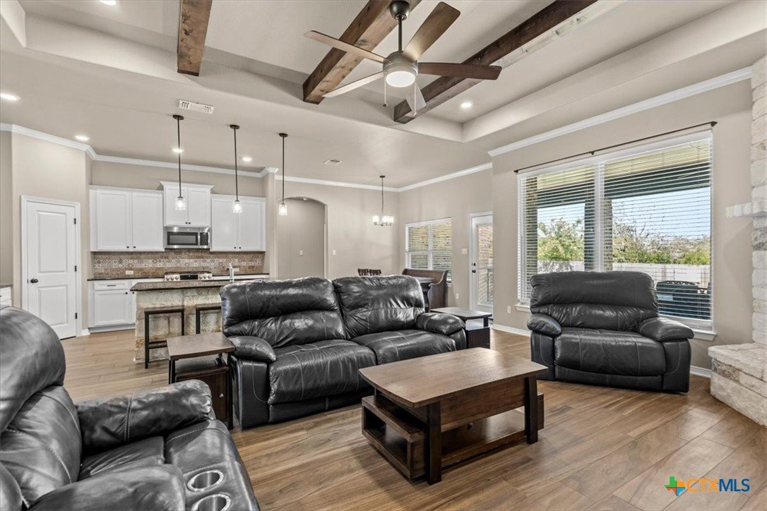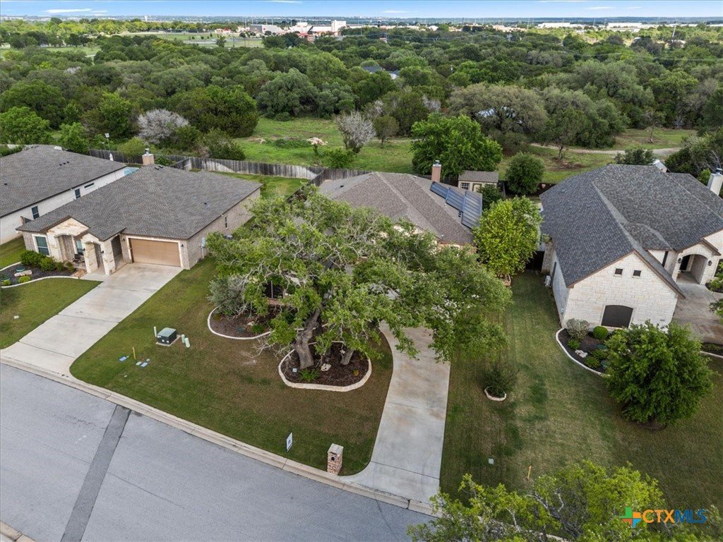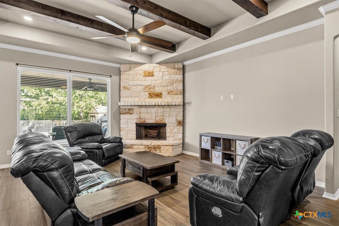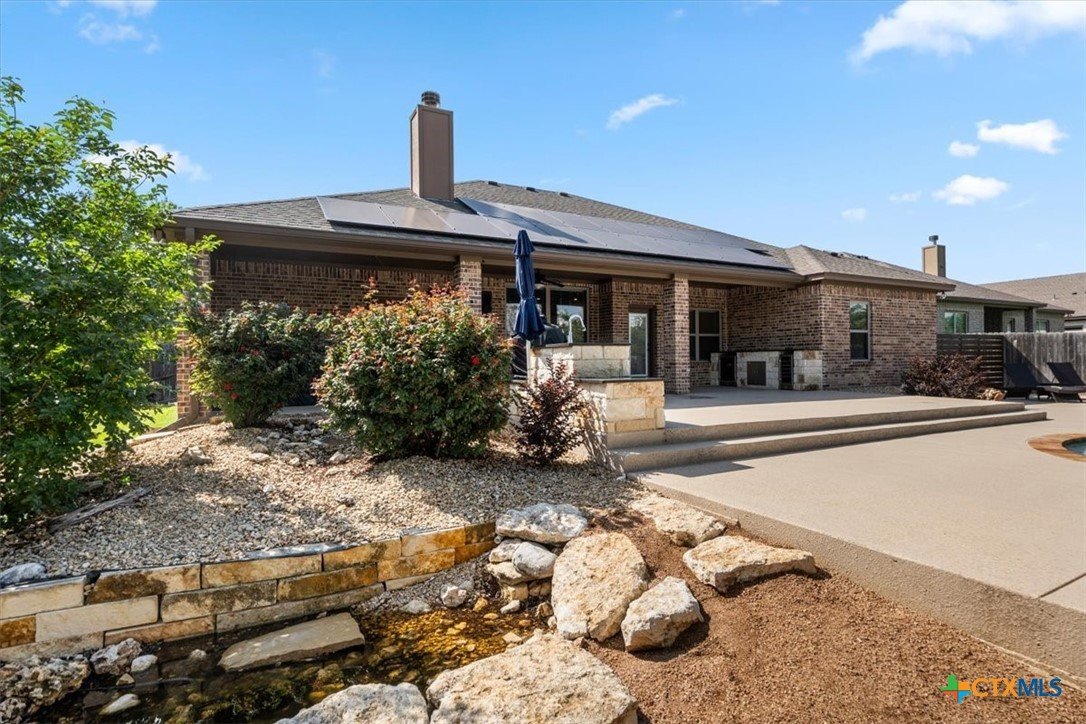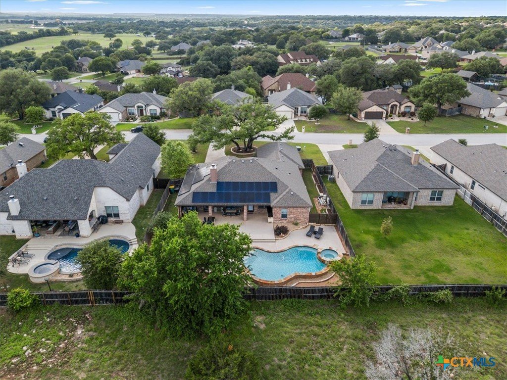 Welcome to your private Central Texas retreat in the desirable Highland Estates, located within Belton ISD and just minutes from Belton Lake. This beautifully crafted Carothers-built home offers 4 spacious bedrooms, 2.5 baths, and a thoughtfully designed layout that blends comfort, elegance, and functionality. Step inside to an inviting open-concept floorplan, where the foyer is flanked by a dedicated study and formal dining area—perfect for both work and entertaining. The living room impresses with soaring beamed ceilings, a cozy wood-burning fireplace, and expansive views of the backyard oasis. The primary suite is a true sanctuary, featuring a massive walk-in closet and direct access to the back deck—ideal for enjoying quiet mornings or evening relaxation. Secondary bedrooms are generously sized and share a well-appointed bathroom with a double vanity. Outdoors, the home truly shines. The backyard backs to a private 4-acre property, offering rare peace and privacy. Designed for entertaining, the space includes a large deck, covered seating area, outdoor kitchen, and multiple beverage refrigerators. The luxurious heated pool and spa feature a stunning waterfall, creating a resort-style atmosphere right at home. Low-maintenance landscaping ensures you can spend more time enjoying and less time working. Additional highlights include a 3-car garage with a finished epoxy floor and ample storage. This is more than a home—it’s a Central Texas haven where comfort, privacy, and outdoor living come together seamlessly.