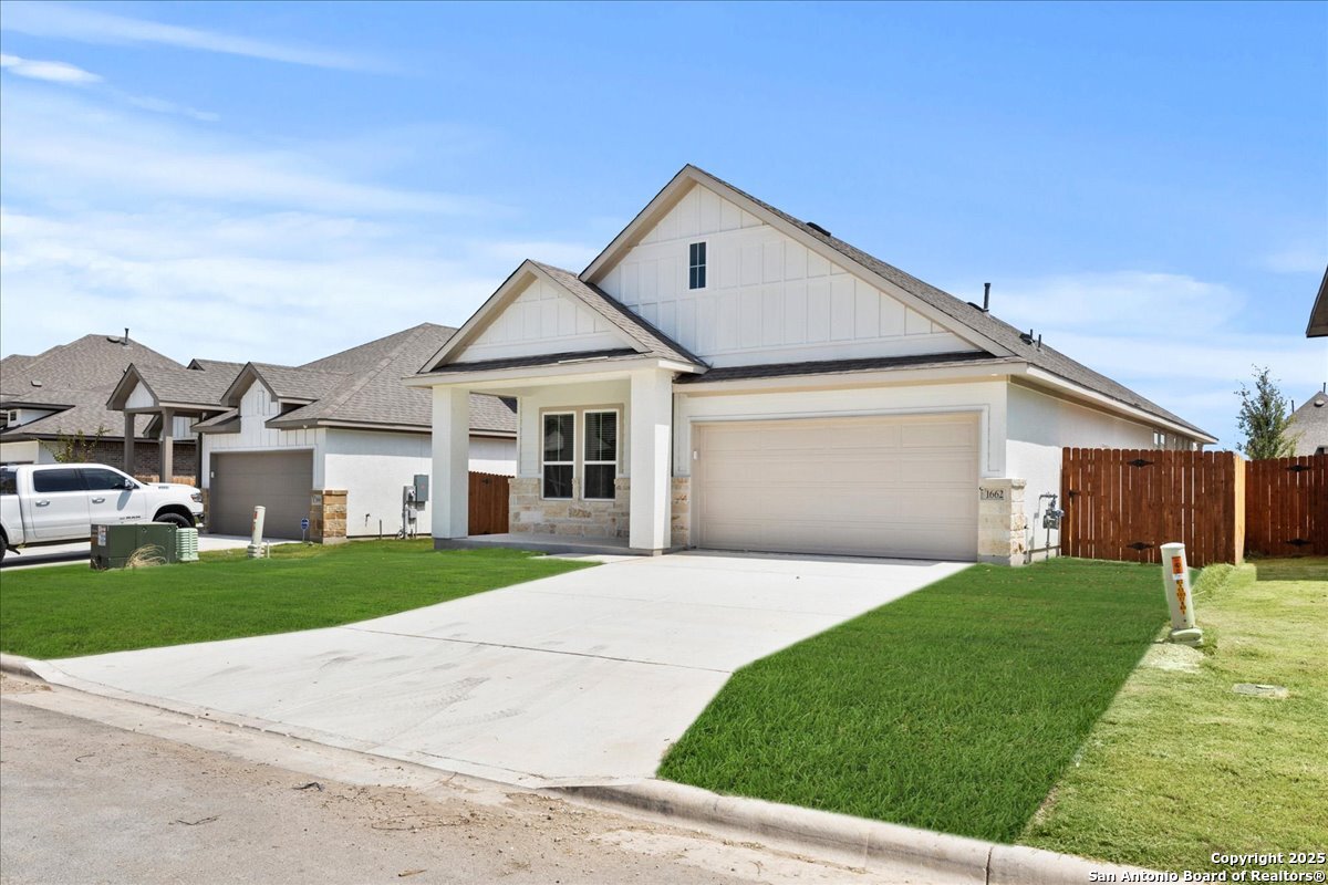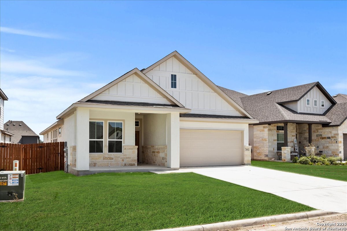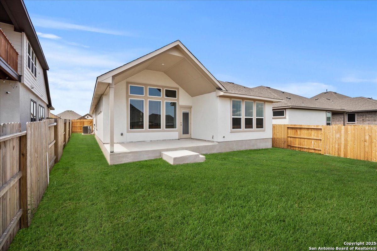 MOVE IN READY!!! Welcome to the AVA by Chesmar Homes- a beautifully designed single-story home that perfectly blends style and versatility. From the moment you step inside, you're greeted by an open-concept layout anchored by a spacious family room with a vaulted ceiling that extends seamlessly to the covered outdoor patio. An electric fireplace adds warmth and charm. The heart of the home is the expansive kitchen, featuring a large island that overlooks both the dining area and family room-ideal for gatherings and everyday living. The luxurious primary suite is thoughtfully tucked away for privacy and showcases a tray ceiling, dual vanities, a spacious walk-in shower, and a massive walk-in closet built for two. Two secondary bedrooms share a full bath in a separate wing, offering both comfort and privacy for family or guests. A versatile flex room offers endless possibilities-use it as a study, playroom, or home gym. The 2-car garage includes a 3-foot extension, providing extra space for storage, tools, or recreational gear.
