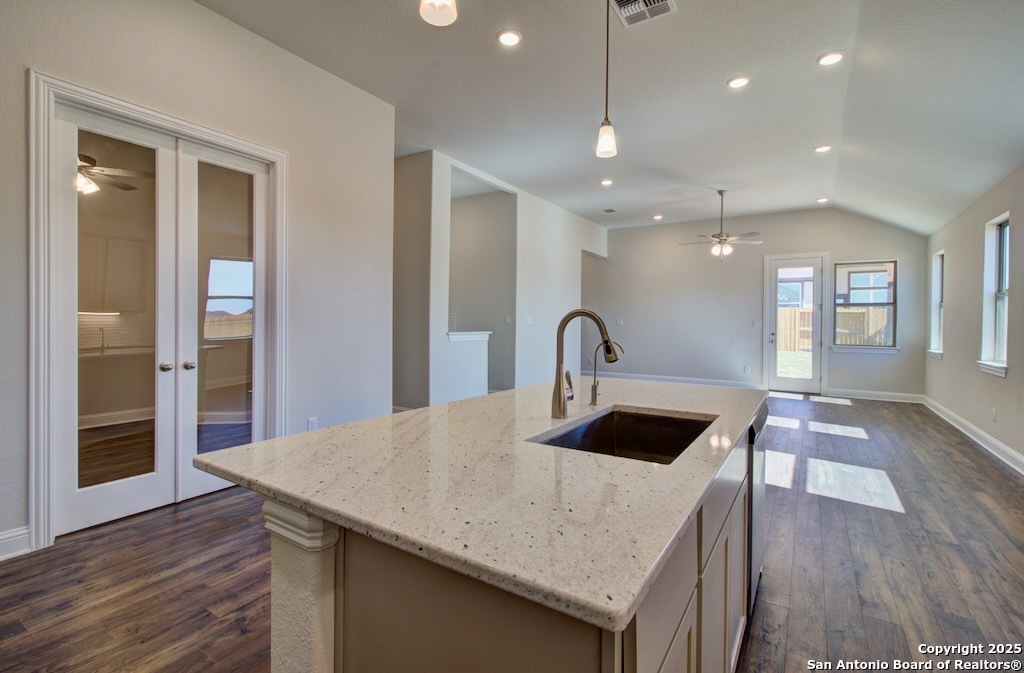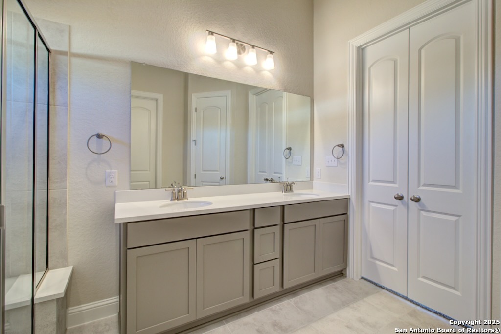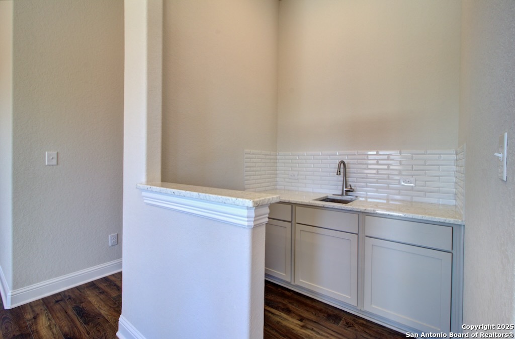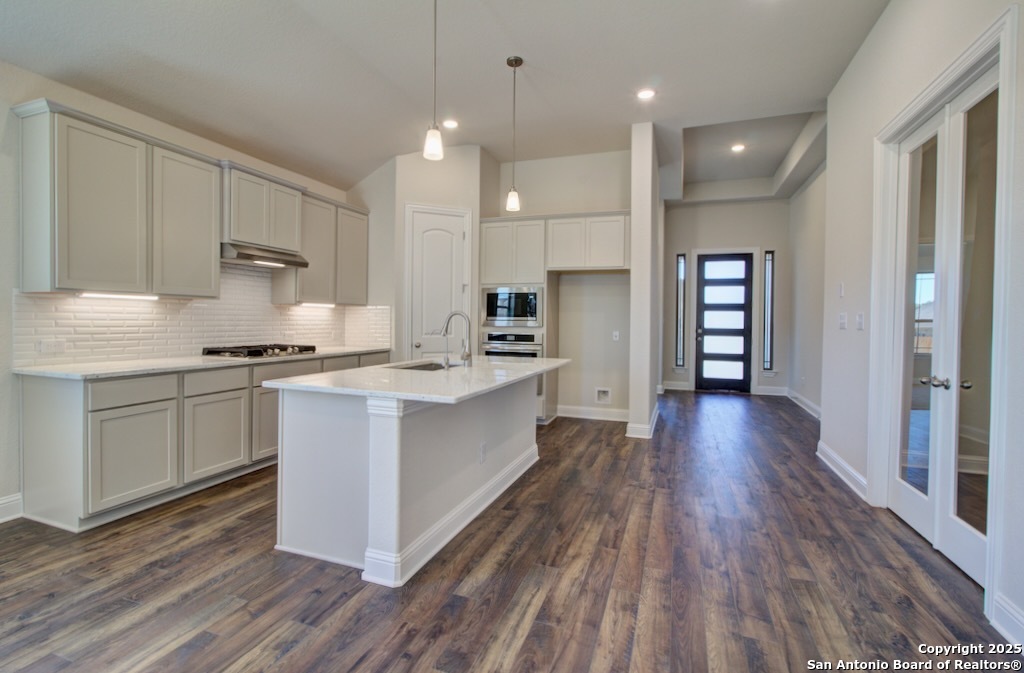 This beautifully designed four bedroom, three bathroom home offers modern features and timeless appeal. The exterior showcases a blend of brick and stone with elegant trim for lasting curb appeal. Inside, the open floor plan includes an upgraded kitchen layout with a built in oven, microwave, gas cooktop, and vent hood. The kitchen also features designer backsplash tile, granite countertops, and stylish cabinetry for a refined finish. The spacious great room connects seamlessly to the dining area, creating an inviting space for everyday living and entertaining. A private study offers flexibility for a home office or reading space. The owner's suite provides a relaxing retreat with an enlarged ceramic tile shower that measures sixty inches by forty two inches, complemented by marble accents and satin nickel fixtures. Additional upgrades include Revwood flooring, brushed nickel lighting, and a wet bar with granite countertops and matching cabinetry. Enjoy outdoor living on the extended covered patio, ideal for gatherings or quiet evenings. With its thoughtful layout and designer finishes, this home combines comfort, elegance, and functionality in one beautiful package. Reside in Meyer Ranch featuring award winning amenities!