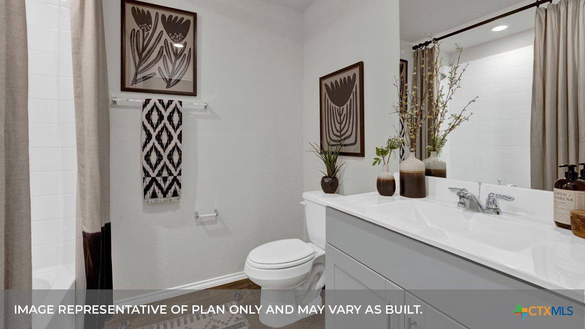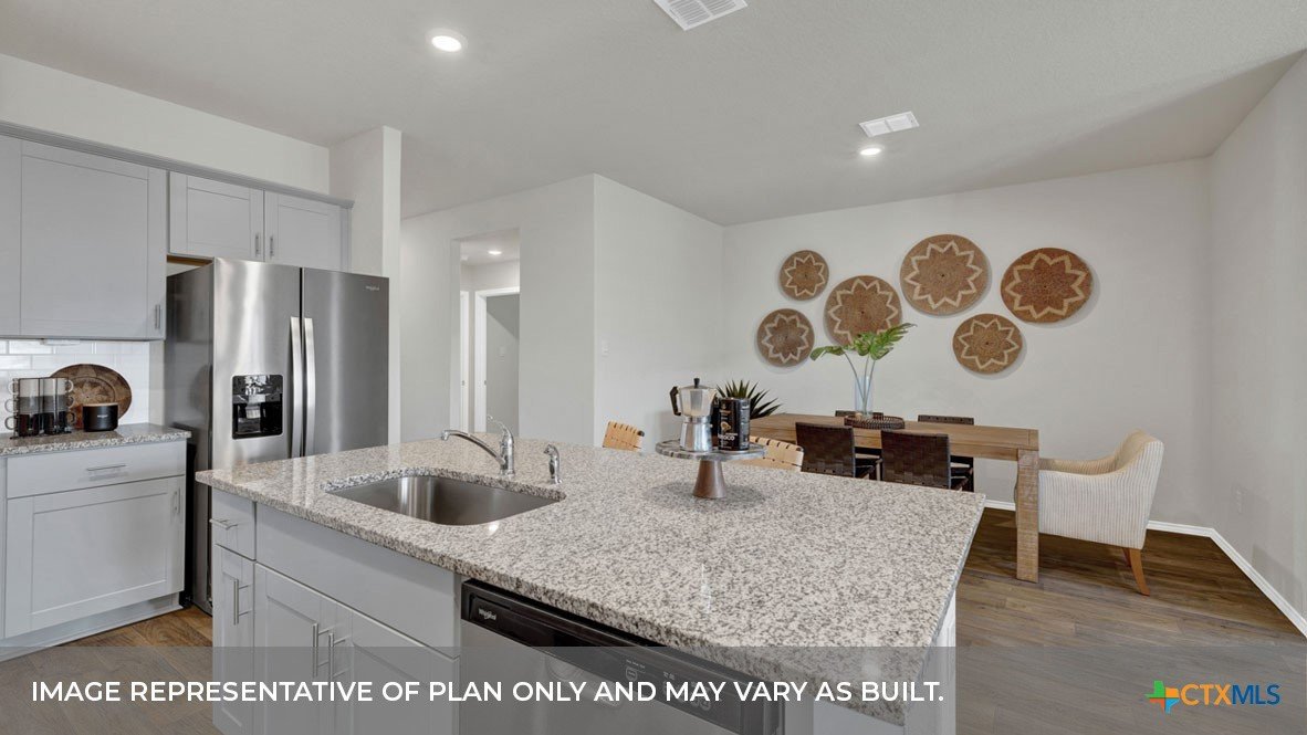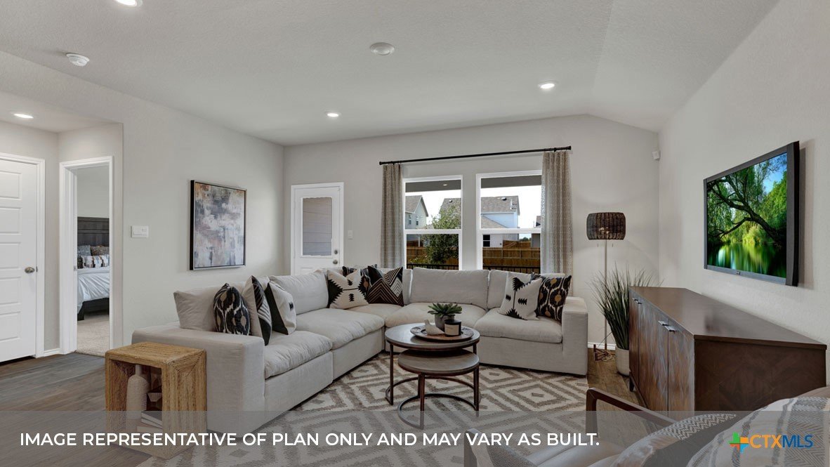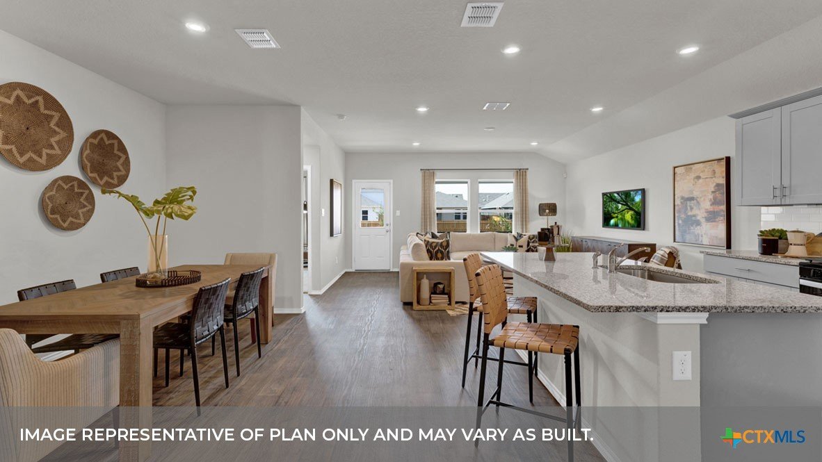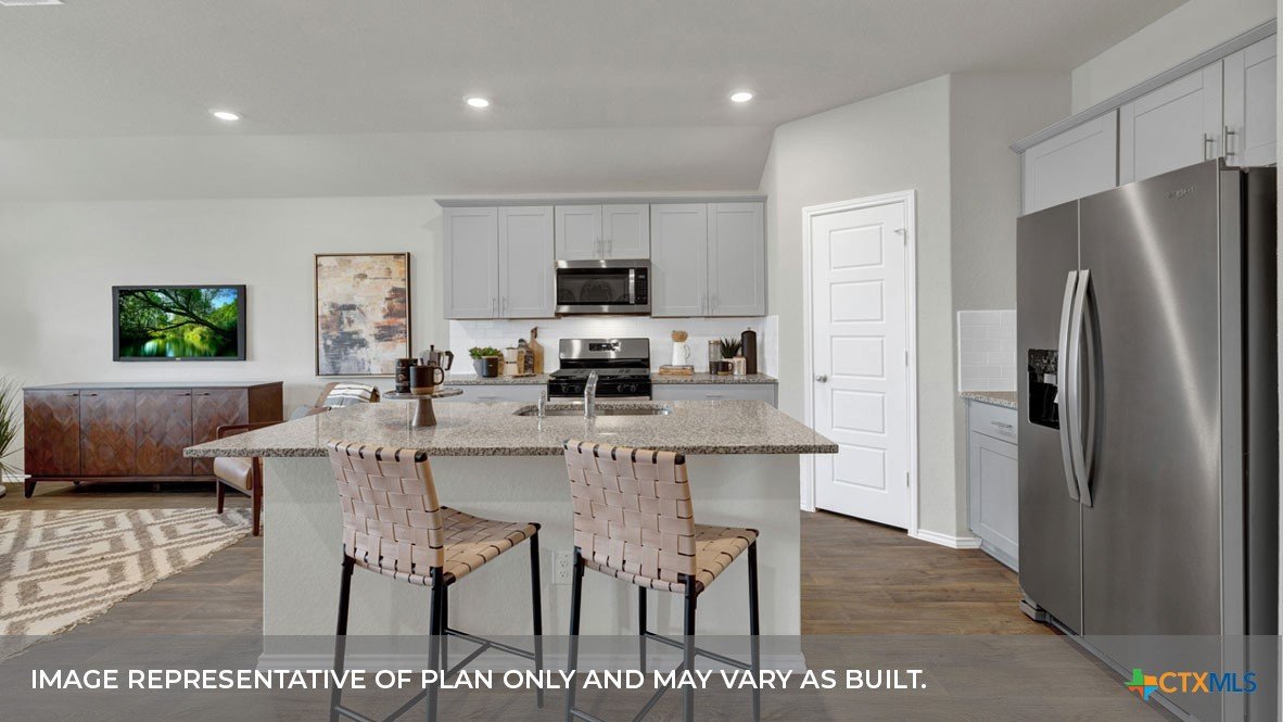 MOVE IN READY! FORMER MODEL HOME! INCLUDES REFRIGERATOR AND WASHER DRYER IN ADDITION TO THE STANDARD APPLIANCE PACAKGE. Check out our Harris floorplan, our largest one-story plan available at Saengerhalle Meadows in New Braunfels, TX. Perfect for roommates or larger families, this 4-bedroom, 2.5-bathroom, 2 car garage home offers 1,816 square feet of comfortable living space. Our homes in Saengerhalle Meadows feature farmhouse. At the front of the home, off the foyer, you have two secondary bedrooms and a full bathroom, which includes a shower/tub combination. Moving through the foyer, down a small hall, you will find the half bathroom, utility room and another secondary bedroom. All secondary bedrooms feature a closet with shelving. Whether you use these rooms as an office, child’s room or guest room, there is plenty of space for work, sleep, and play. Making your way through the house, you’ll walk into the heart of the home, the living area. Built as an open concept, move easily between the kitchen, dining, and family room. The L-shaped kitchen includes granite countertops, a large island with an undermount sink, a corner pantry closet, stainless-steel appliances and 36’’ upper cabinets. The primary bedroom is located off the family room. This spacious bedroom will be your oasis at the end of a long day. Enjoy the private bathroom, which features a 5’ walk in shower, double vanity, separate door for the toilet and an oversized walk-in closet. The Harris includes vinyl flooring throughout the common areas of the home, and carpet in the bedrooms. All our new homes feature a covered back patio, full sod, an irrigation system in the front and back yard, and a 6’ privacy fence around the back yard. This home includes our America’s Smart Home base package, which includes the Front Doorbell, Front Door Deadbolt Lock, Home Hub, Thermostat, and Deako® Smart Switches.