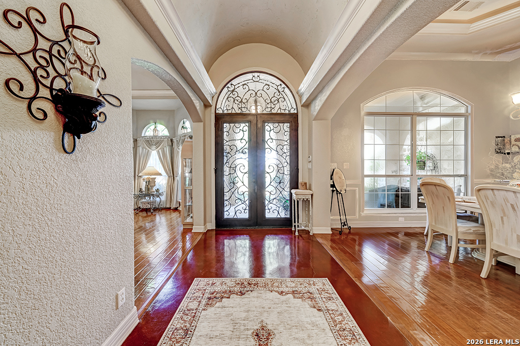 A Tuscan-Inspired Masterpiece in River Crossing! Surrounded by a canopy of centuries-old oaks, this 4,051 sq. ft. single-story home on 1.03 acres redefines Hill Country elegance. From the moment you step through the ornate iron doors, every detail tells a story of craftsmanship and luxury. The stone-and-stucco exterior sets a timeless tone, while inside, sweeping living spaces, brick-inspired tile, and warm textures evoke the charm of Tuscany with modern sophistication. The chef's kitchen is nothing short of extraordinary, featuring deluxe stainless steel appliances, and expansive working island. Multiple living and dining spaces, including a media room and office, create effortless flow for entertaining or quiet retreat. The primary suite is a sanctuary of its own, offering a coffee bar, spa-style en suite bath, and tranquil garden views that invite relaxation. Outdoors, the lush landscape feels like a private resort. A fully decked attic above the garage adds storage, while new upgrades, including a roof, gutters, AC unit, and tankless water heater, ensure peace of mind. With thoughtful additions like a central vacuum, water softener with dual reverse osmosis faucets, fireplace that can be wood burning or gas, a temperature controlled storage and gas and water hookups ready for an outdoor kitchen, this residence seamlessly blends luxury and practicality. Enjoy an active lifestyle with the neighborhood park just a short walk away-complete with pickle ball, basketball, and tennis courts and quick drive to the Guadalupe River with private access for River Crossing residents only. Additionally, you have the opportunity to join the prestigious River Crossing Country Club that includes a championship golf course, resort style pool, state of the art fitness center and fine dining at its best. Meticulously designed, impeccably maintained, and surrounded by natural beauty, this home is truly a rare find.