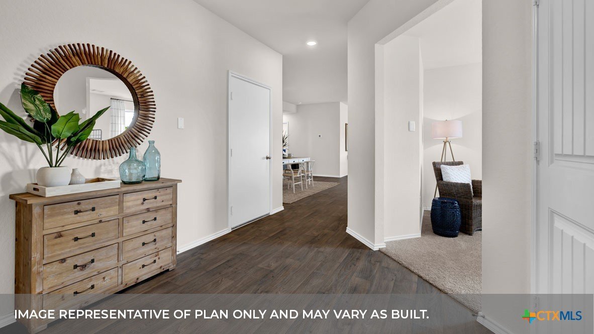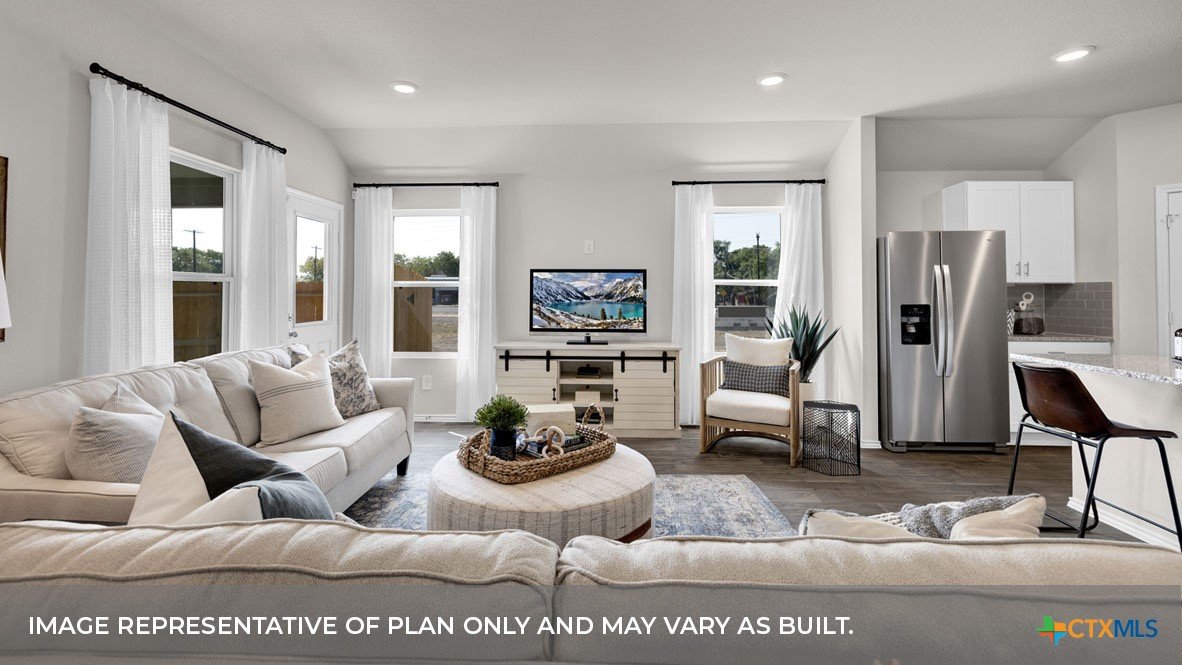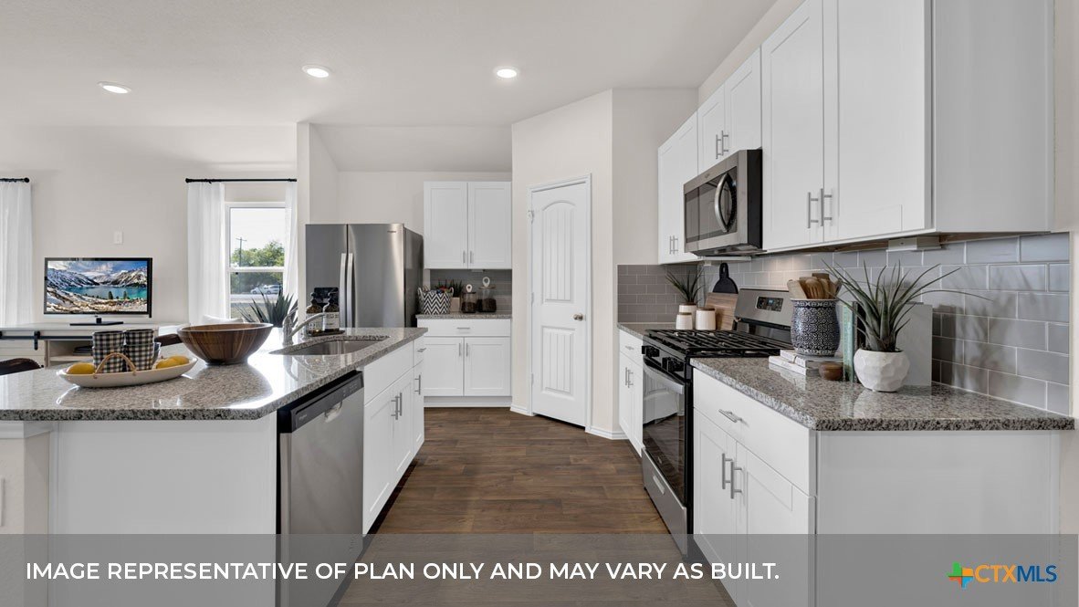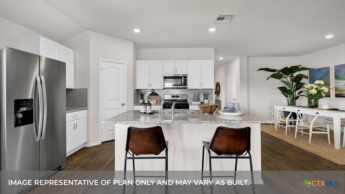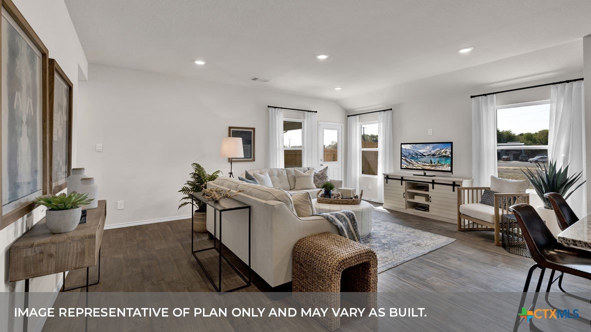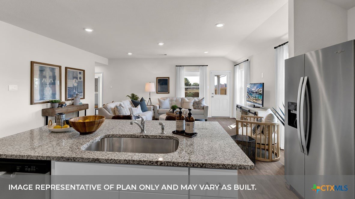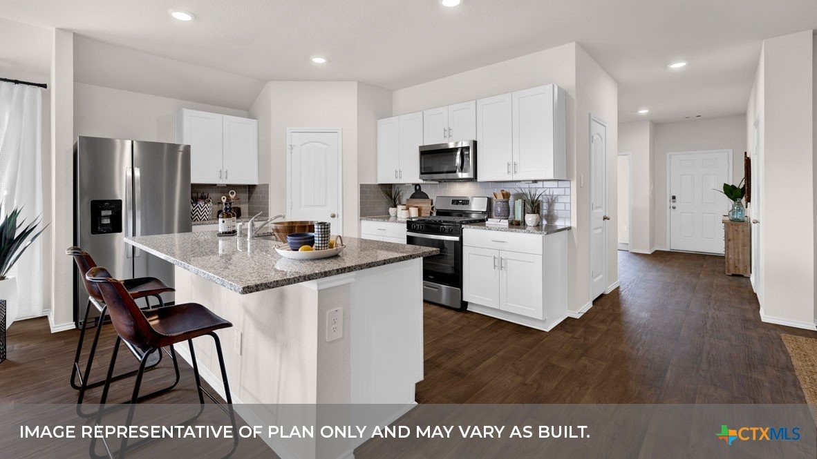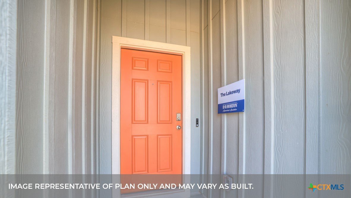 APRIL ESTIMATED COMPLETION DATE. The Lakeway is our most popular floorplan and is available at Hansford in Lockhart, Texas. This one-story home offers 2,034 square feet of living space across 4 bedrooms, 3 bathrooms, a study, and 2-car garage. Our homes in Hansford feature farmhouse exteriors. As you enter the home from the covered front porch, you’ll step into the spacious foyer and will find the open study, bathroom 2 and bedroom 2. Use the study as a home office, library, or extra play area for the kids. Stepping further into the home, you’ll discover the dining room, kitchen and family room laid out in an open concept design. Built to make cooking, eating, and entertaining a pleasant experience for family and friends, you’re sure to make many memories in this beautiful space. The kitchen includes granite countertops, a large island facing the family room, a walk-in pantry, stainless-steel appliances and 36’’ upper cabinets. Located privately off the dining room are bedrooms 3 and 4, as well as bathroom 3. The primary bedroom is at the back of the house, off the family room, and includes a private bathroom. This relaxing bathroom space features a 5’ walk in shower, vanity, private toilet area with a door, and a walk-in closet. The utility room is outside the primary bedroom, allowing for the laundry chores to be completed with ease. The Lakeway includes vinyl flooring throughout the common areas of the home, and carpet in the bedrooms. All our new homes feature a covered back patio, full sod, irrigation system in the front and back yard, and a 6’ privacy fence around the back yard. This home includes our America’s Smart Home base package, which includes the Amazon Echo Pop, Front Doorbell, Front Door Deadbolt Lock, Home Hub, Thermostat, and Deako® Smart Switches.