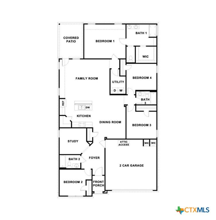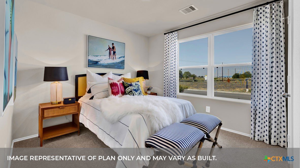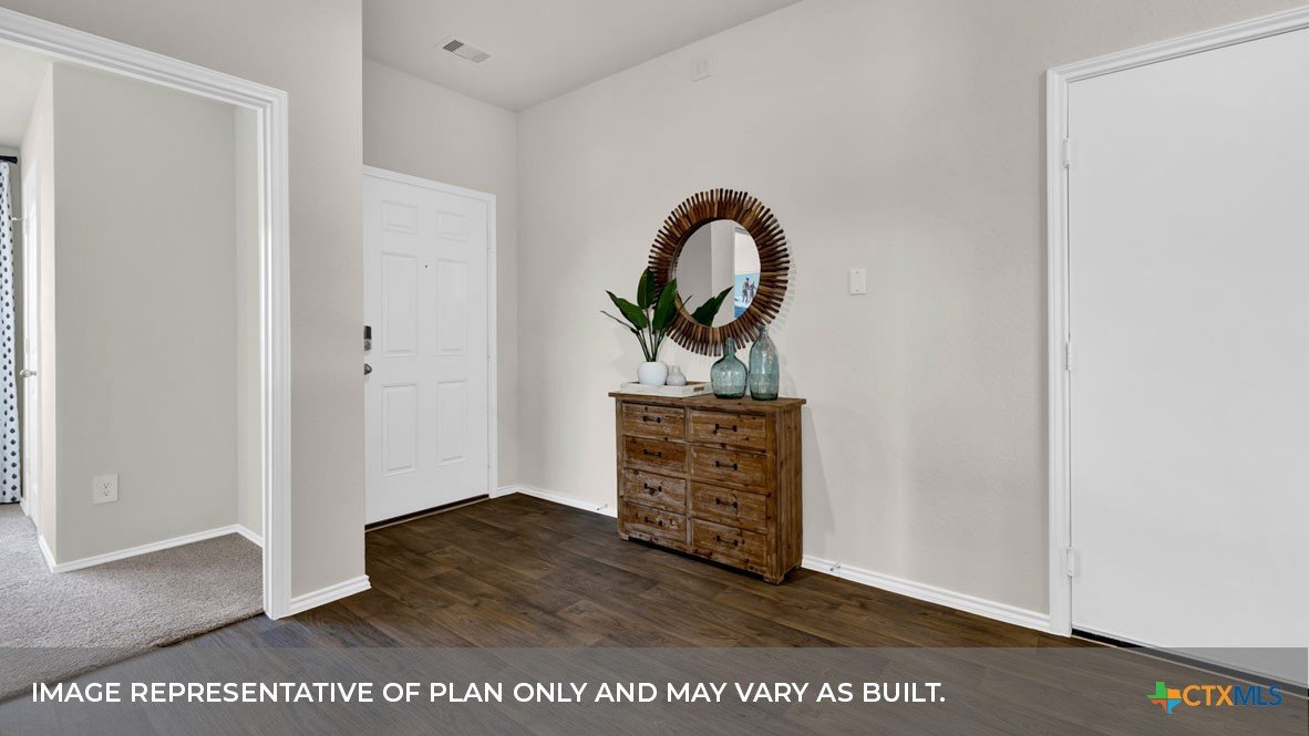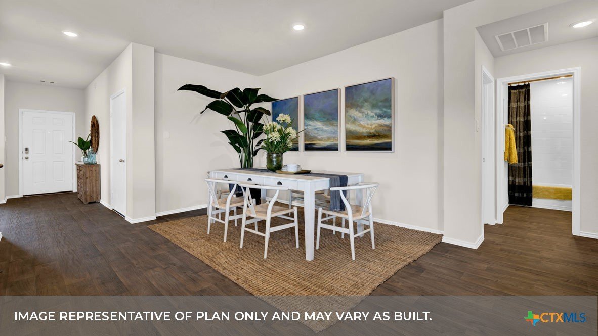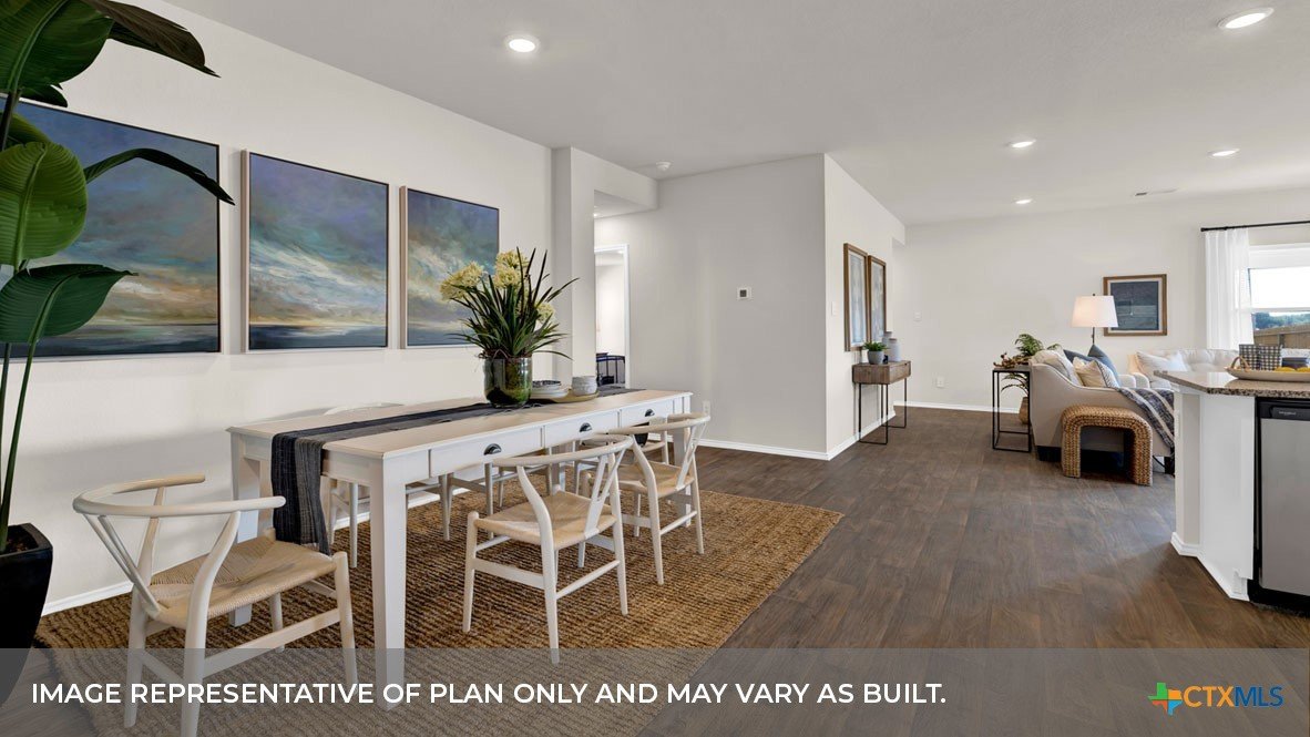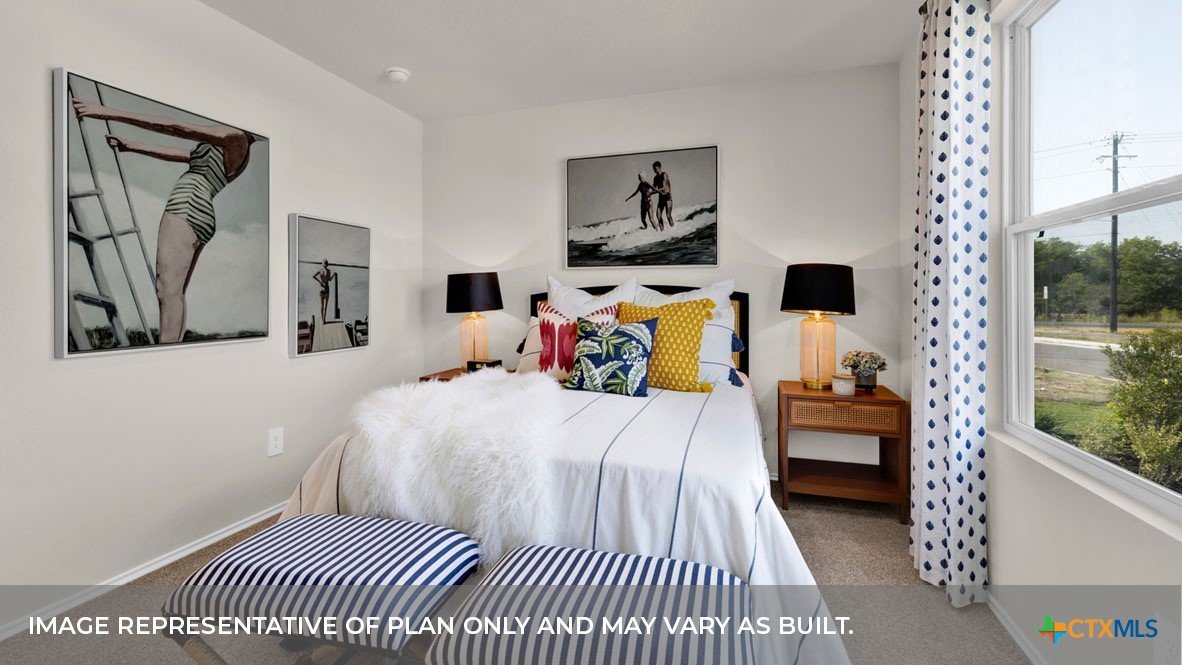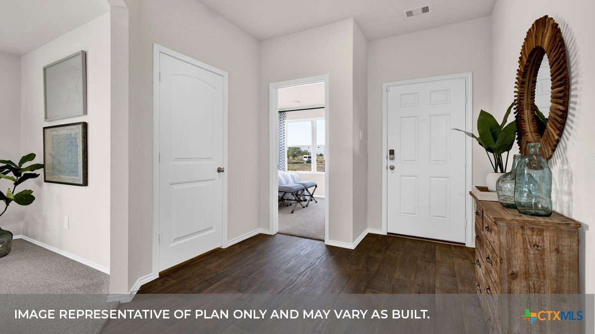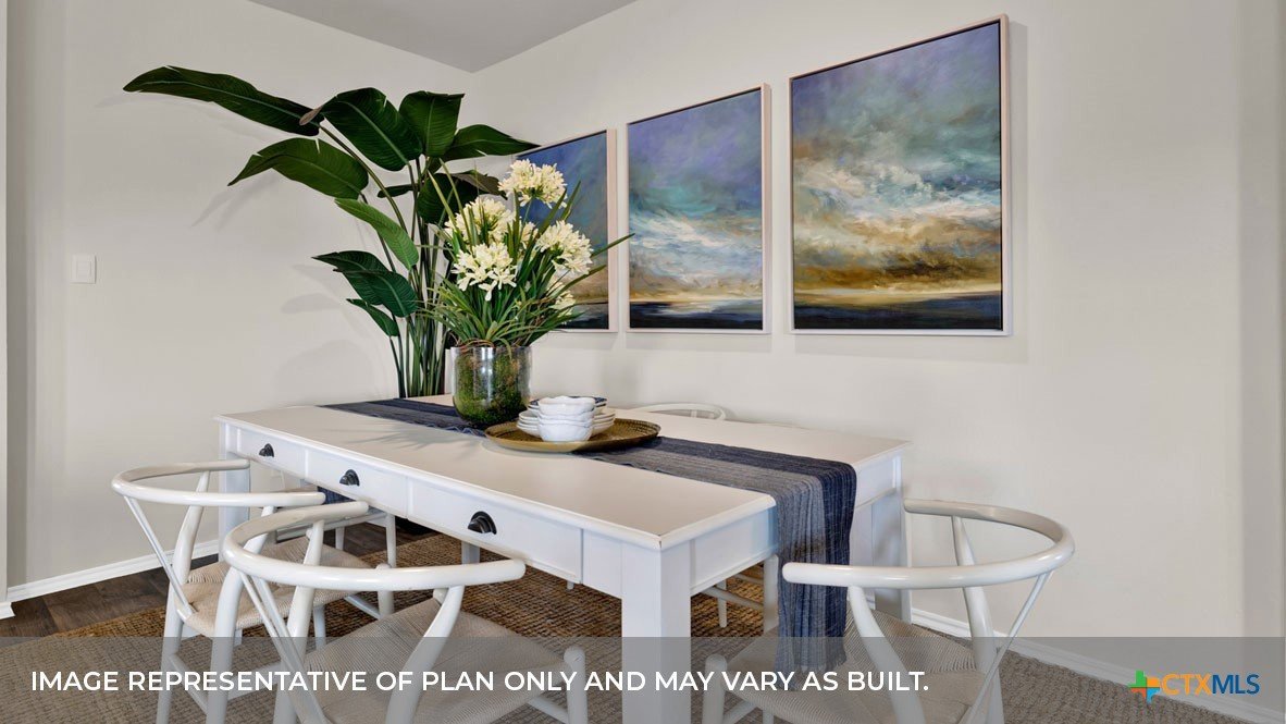 APRIL ESTIMATED COMPLETION DATE. The Lakeway is our most popular floorplan and is available at Hansford in Lockhart, Texas. This one-story home offers 2,034 square feet of living space across 4 bedrooms, 3 bathrooms, a study, and 2-car garage. Our homes in Hansford feature farmhouse exteriors. As you enter the home from the covered front porch, you’ll step into the spacious foyer and will find the open study, bathroom 2 and bedroom 2. Use the study as a home office, library, or extra play area for the kids. Stepping further into the home, you’ll discover the dining room, kitchen and family room laid out in an open concept design. Built to make cooking, eating, and entertaining a pleasant experience for family and friends, you’re sure to make many memories in this beautiful space. The kitchen includes granite countertops, a large island facing the family room, a walk-in pantry, stainless-steel appliances and 36’’ upper cabinets. Located privately off the dining room are bedrooms 3 and 4, as well as bathroom 3. The primary bedroom is at the back of the house, off the family room, and includes a private bathroom. This relaxing bathroom space features a 5’ walk in shower, vanity, private toilet area with a door, and a walk-in closet. The utility room is outside the primary bedroom, allowing for the laundry chores to be completed with ease. The Lakeway includes vinyl flooring throughout the common areas of the home, and carpet in the bedrooms. All our new homes feature a covered back patio, full sod, irrigation system in the front and back yard, and a 6’ privacy fence around the back yard. This home includes our America’s Smart Home base package, which includes the Amazon Echo Pop, Front Doorbell, Front Door Deadbolt Lock, Home Hub, Thermostat, and Deako® Smart Switches.