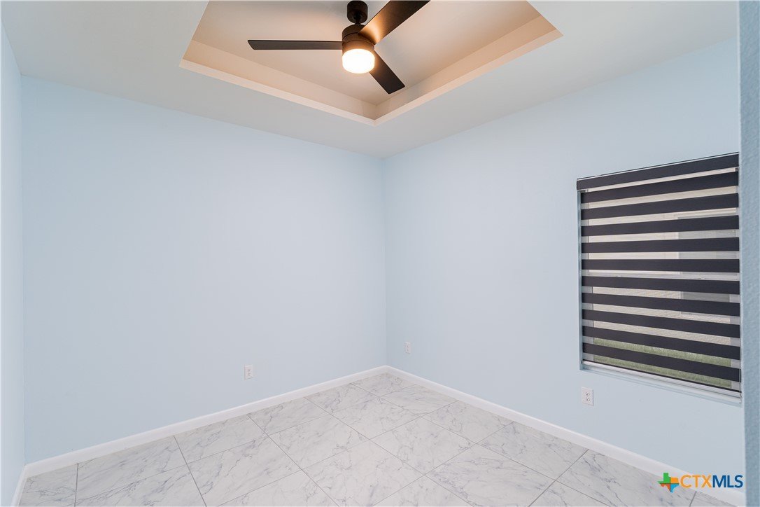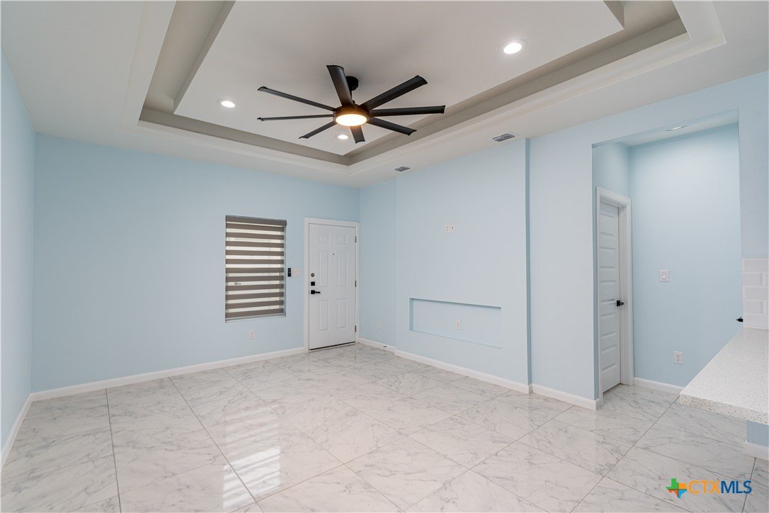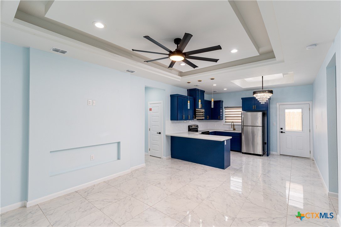 Inside this apartment, you'll find soaring tray ceilings, contemporary lighting, and elegant tile flooring throughout. The open-concept kitchen is a standout feature, boasting striking navy blue cabinetry, quartz countertops, stainless steel appliances, and a stylish chandelier over the dining area. Both bathrooms are beautifully finished with sleek tile work and modern fixtures. Each bedroom includes a ceiling fan and natural light, with the primary suite offering a private bath and walk-in closet. Enjoy the added convenience of a covered carport and private backyard access through the kitchen. Schedule your showing today and come see for yourself why this place could be the one you fall in love with!