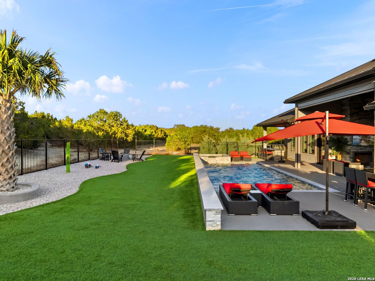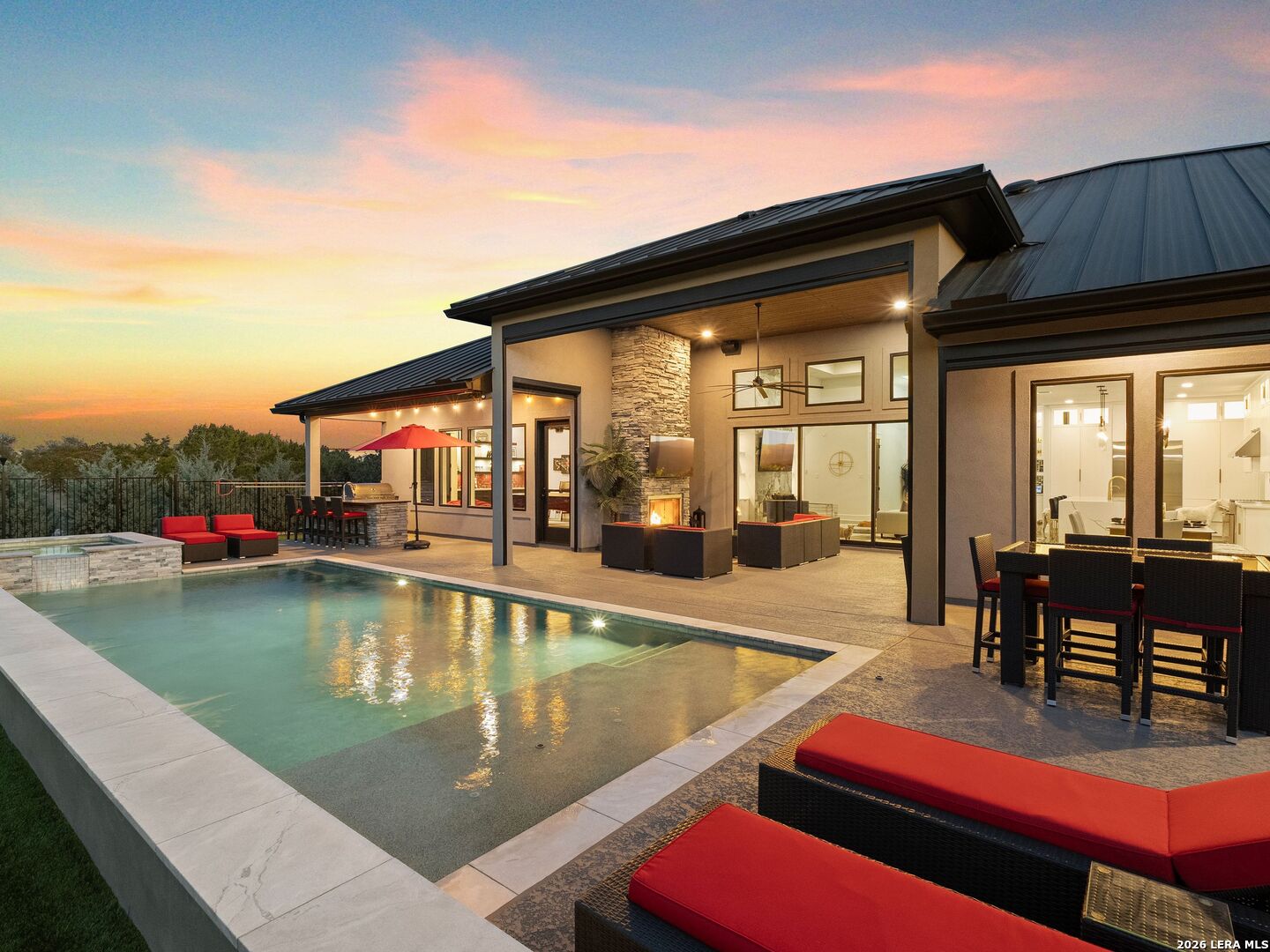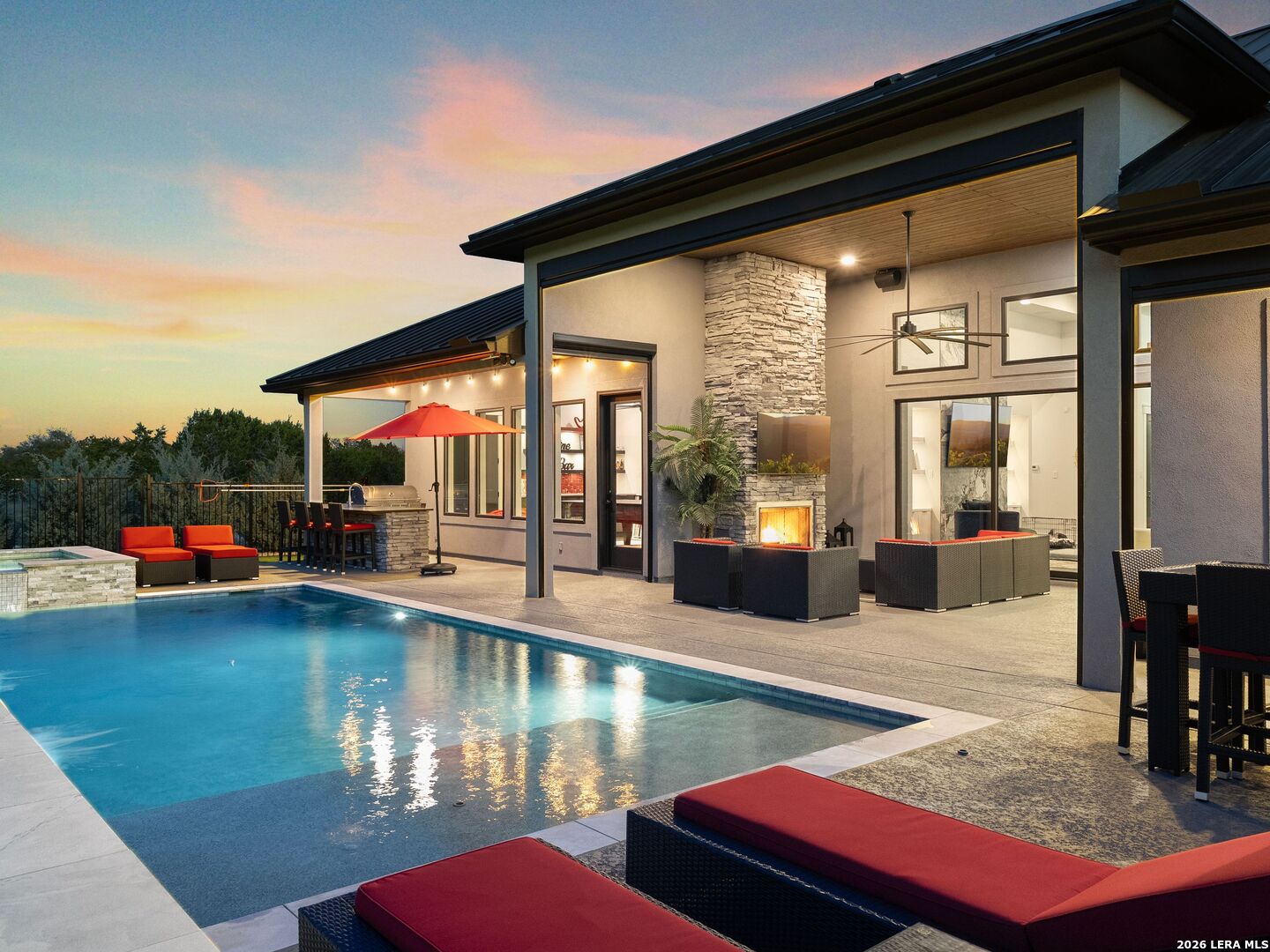 Luxury Hill Country home with Guadalupe River access in the prestigious gated community of Paradise on the Guadalupe. Built in 2024 and set on 1.54 acres, this exceptional single-story estate offers 4 bedrooms, 4 baths, a 3 car garage, soaring ceilings, and a seamless open-concept layout designed for upscale living and entertaining. The chef's island kitchen features custom cabinetry, quartz countertops, gas cooking, butler's pantry, and premium finishes, flowing into indoor and outdoor living spaces with statement fireplaces, private study, and game room. The spacious primary suite delivers a spa-style bath with soaking tub, dual vanities, and oversized walk-in closets. Outdoor living feels like a private resort with a heated saltwater pool and spa, outdoor kitchen, mature trees, and beautifully landscaped grounds. Relax year-round on the covered patio with automatic screens perfect for entertaining in the Texas Hill Country. Additional highlights include metal roof, four-sides masonry, energy-efficient features, water softener, security system, and high-speed internet. Community amenities feature private Guadalupe River access with trails, pavilion, and an impressive 80-acre private park. Enjoy sunsets at the private River Lounge over looking the Texas Hill Country. Located within the highly regarded Comal ISD. Luxury, privacy, and the Hill Country lifestyle-beautifully combined.