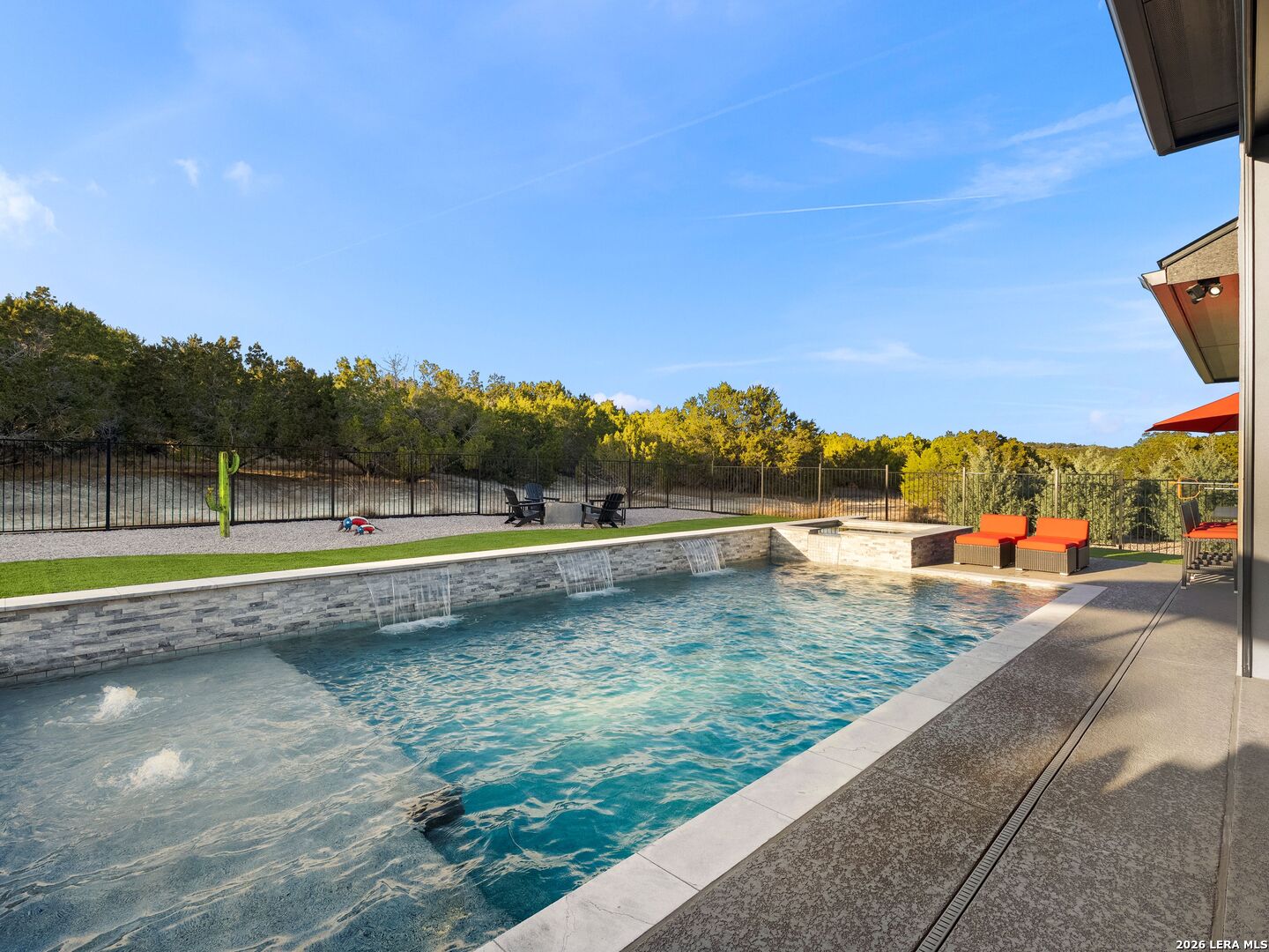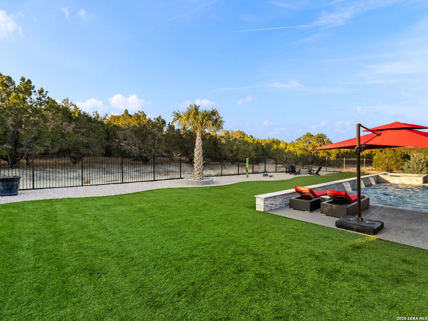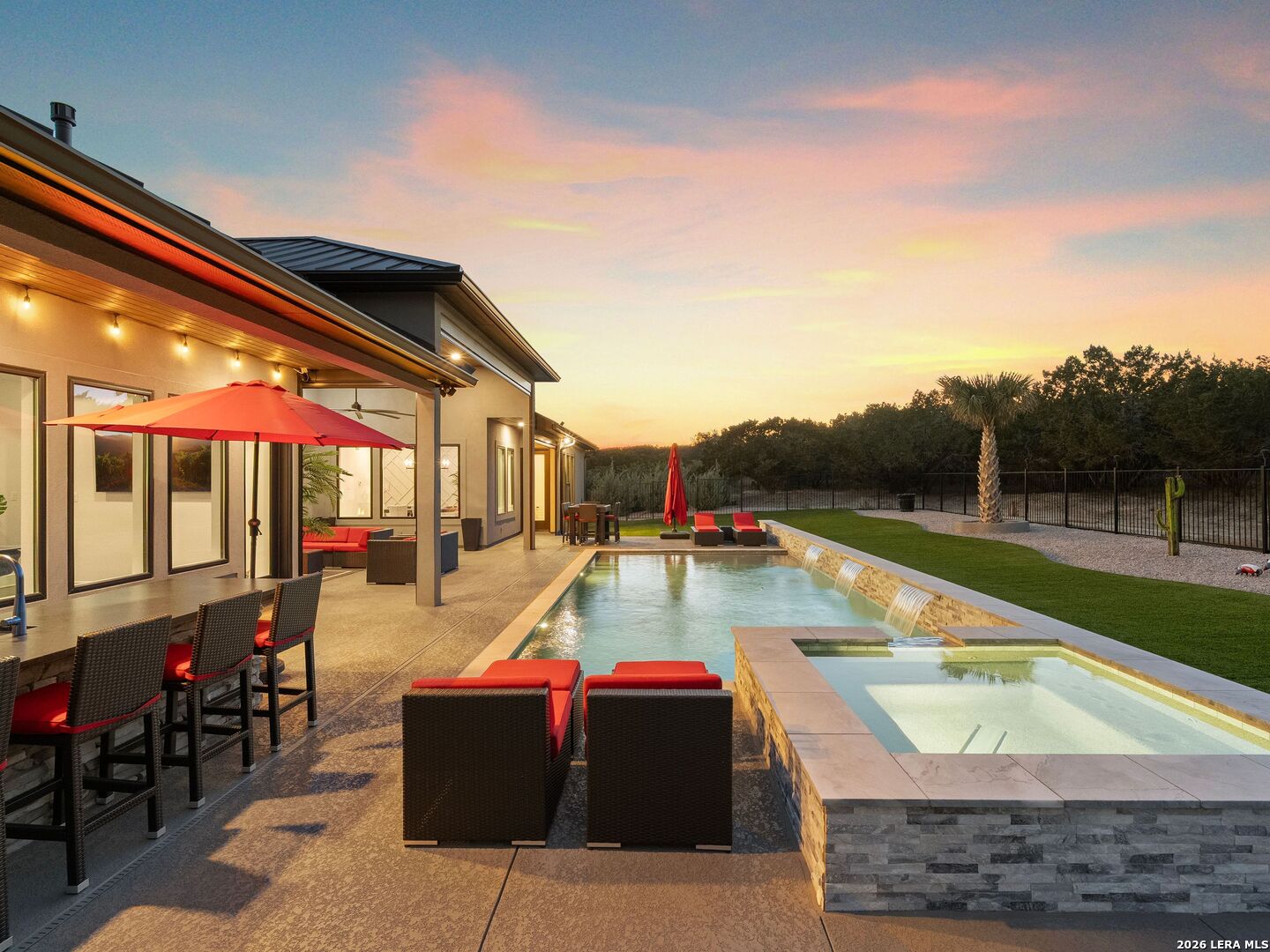Luxury Hill Country home with Guadalupe River access in the prestigious gated community of Paradise on the Guadalupe. Built in 2024 and set on 1.54 acres, this exceptional single-story estate offers 4 bedrooms, 4 baths, a 3 car garage, soaring ceilings, and a seamless open-concept layout designed for upscale living and entertaining. The chef's island kitchen features custom cabinetry, quartz countertops, gas cooking, butler's pantry, and premium finishes, flowing into indoor and outdoor living spaces with statement fireplaces, private study, and game room. The spacious primary suite delivers a spa-style bath with soaking tub, dual vanities, and oversized walk-in closets. Outdoor living feels like a private resort with a heated saltwater pool and spa, outdoor kitchen, mature trees, and beautifully landscaped grounds. Relax year-round on the covered patio with automatic screens perfect for entertaining in the Texas Hill Country. Additional highlights include metal roof, four-sides masonry, energy-efficient features, water softener, security system, and high-speed internet. Community amenities feature private Guadalupe River access with trails, pavilion, and an impressive 80-acre private park. Enjoy sunsets at the private River Lounge over looking the Texas Hill Country. Located within the highly regarded Comal ISD. Luxury, privacy, and the Hill Country lifestyle-beautifully combined.