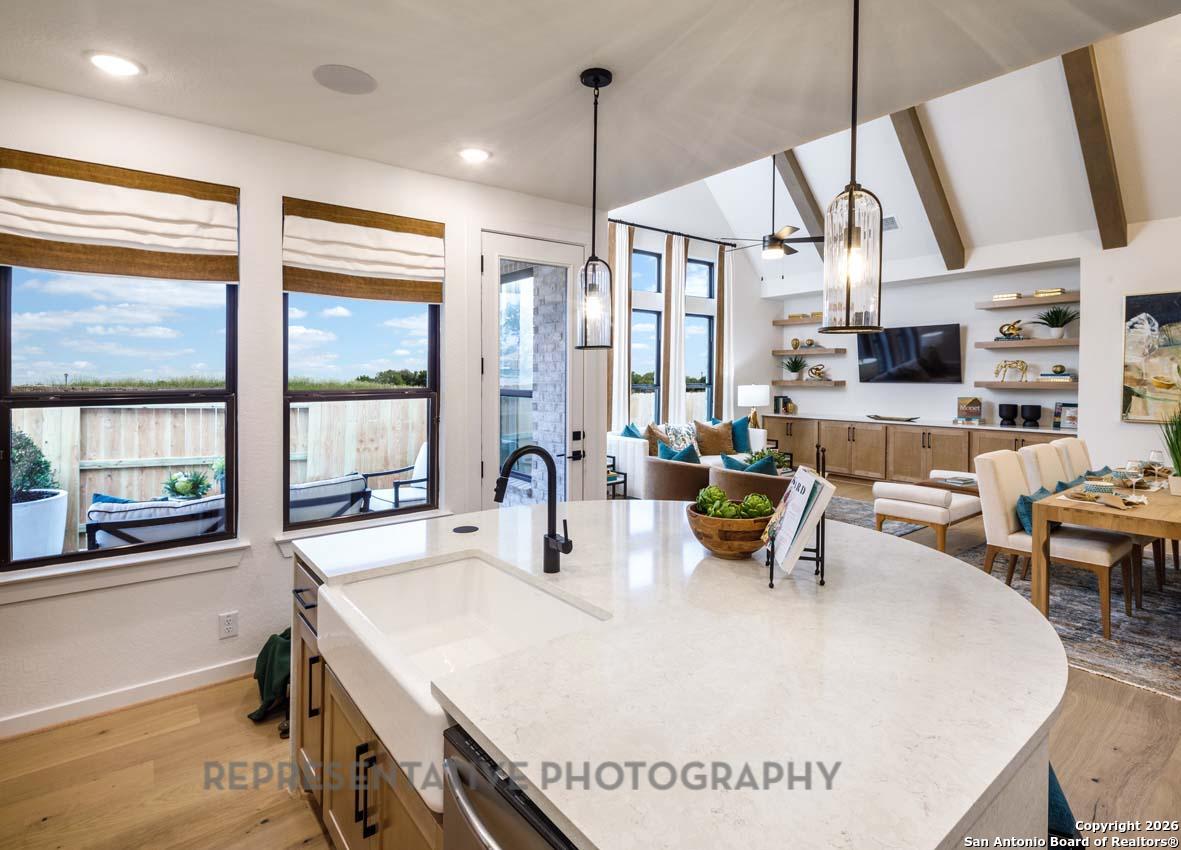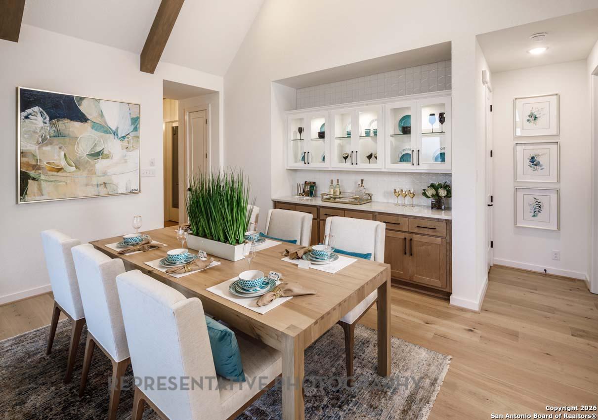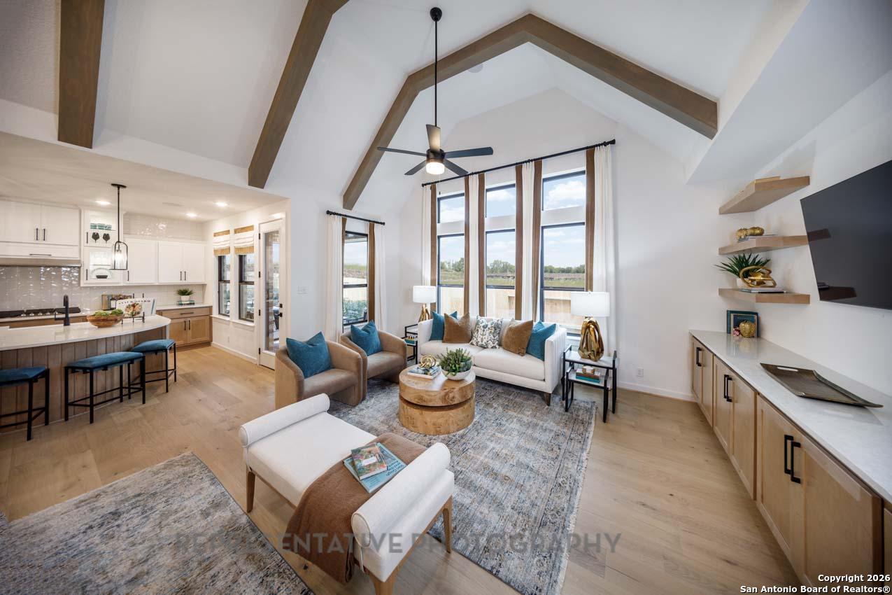 This beautifully designed one-story model home offers 2,200 square feet of thoughtfully planned living space with four bedrooms, three full baths, and a private study. The open-concept layout centers around a spacious gathering room and dining area, both highlighted by elegant steepled ceilings that create a bright, airy atmosphere. Designed for both everyday comfort and entertaining, this home blends functionality with refined architectural details throughout.